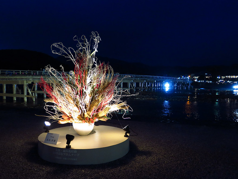 搭嵐電在嵐山駅下車後,先過渡月橋到中之島公園,這裡有大型花藝與行燈競賽,還有小吃攤讓遊客填肚子。花灯路範圍幾乎涵蓋嵐山知名景點,我們逛了快3小時,直到活動時間結束還逛不完哩。