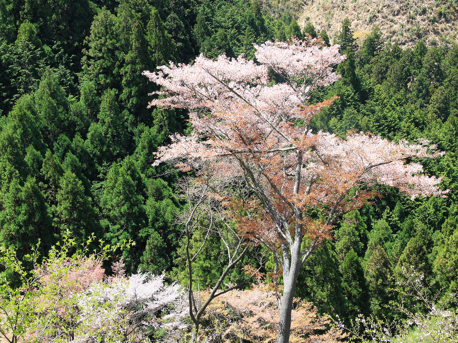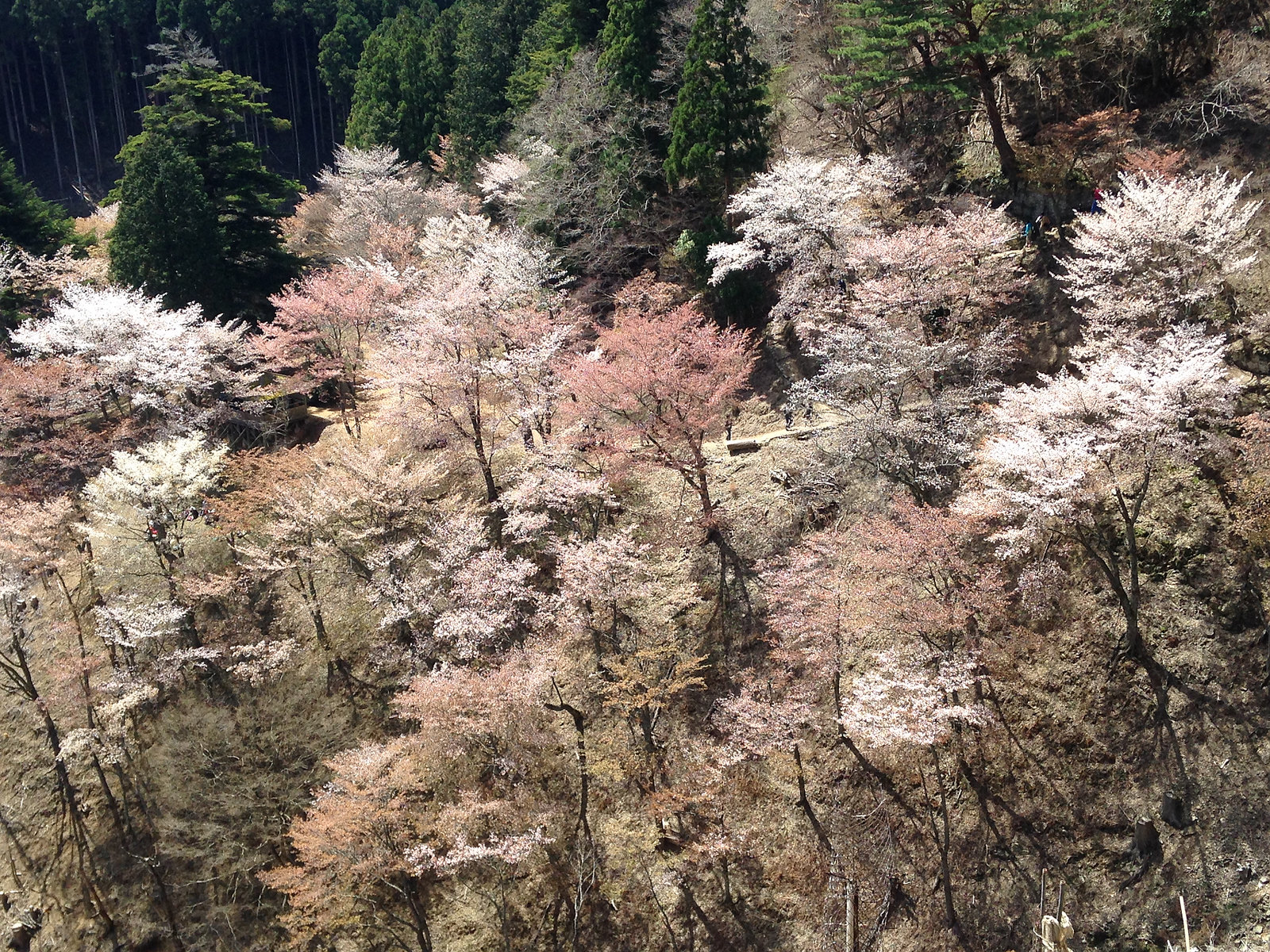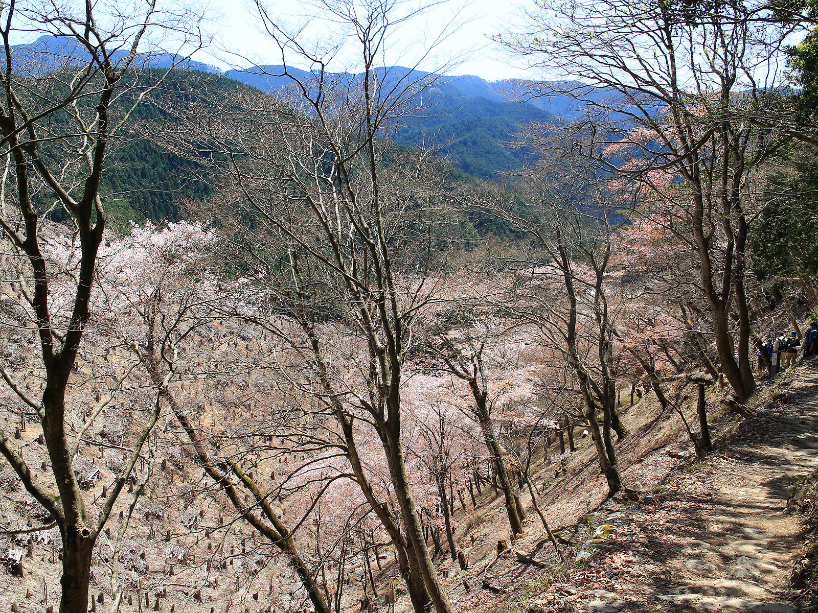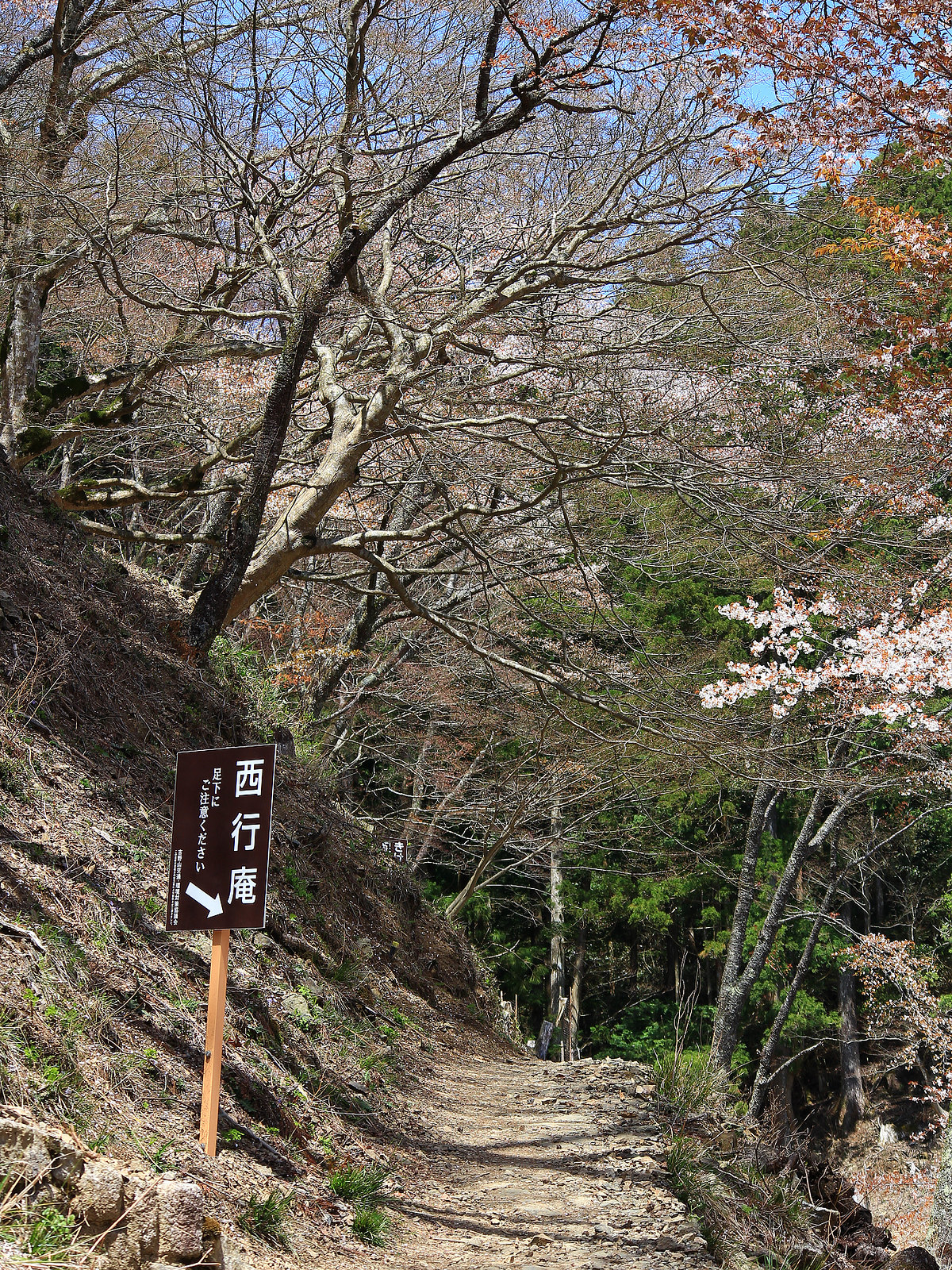 由於第一次拜見吉野山櫻花被大雨打敗,只前進到中千本,心中抱憾不已(見霧雨蒼茫的吉野山一目千本)。隔年晚春再度挑戰吉野山,此時下千本至中千本櫻花已盡數散落,只剩下上千本和奧千本尚能覓得櫻花蹤影,所以這趟目標就放在上千本和奧千本。