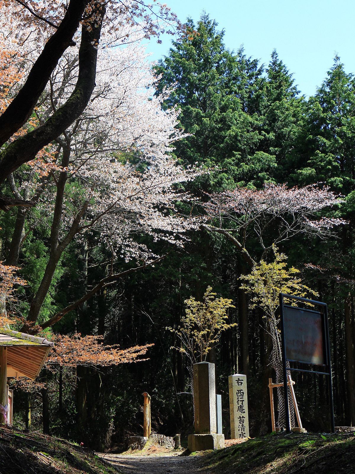 「西行庵」靜謐坐落在櫻花林下,裡面供奉西行坐像由人參拜