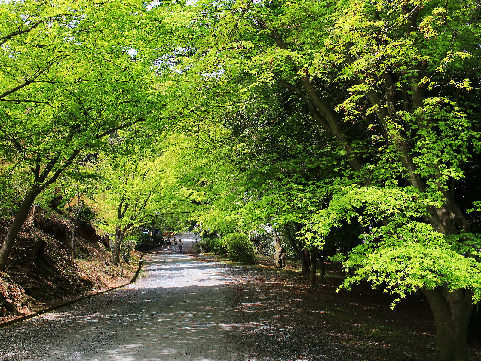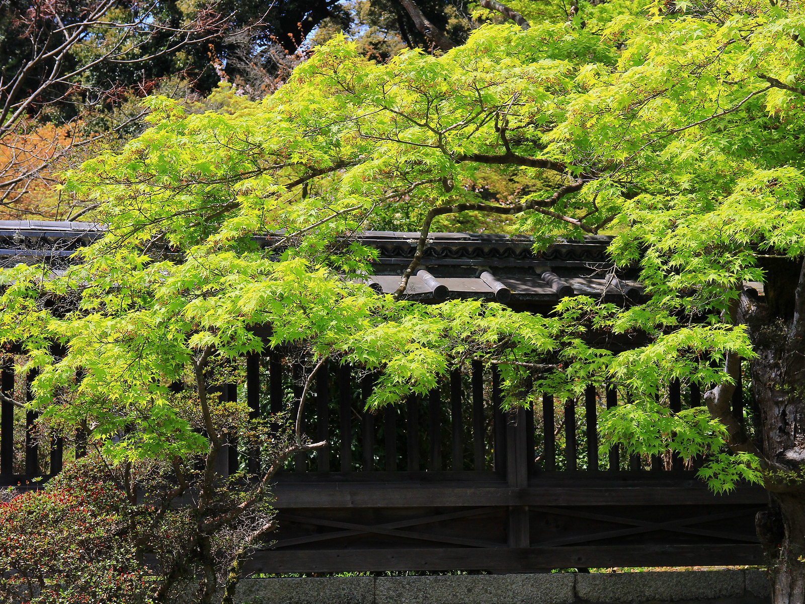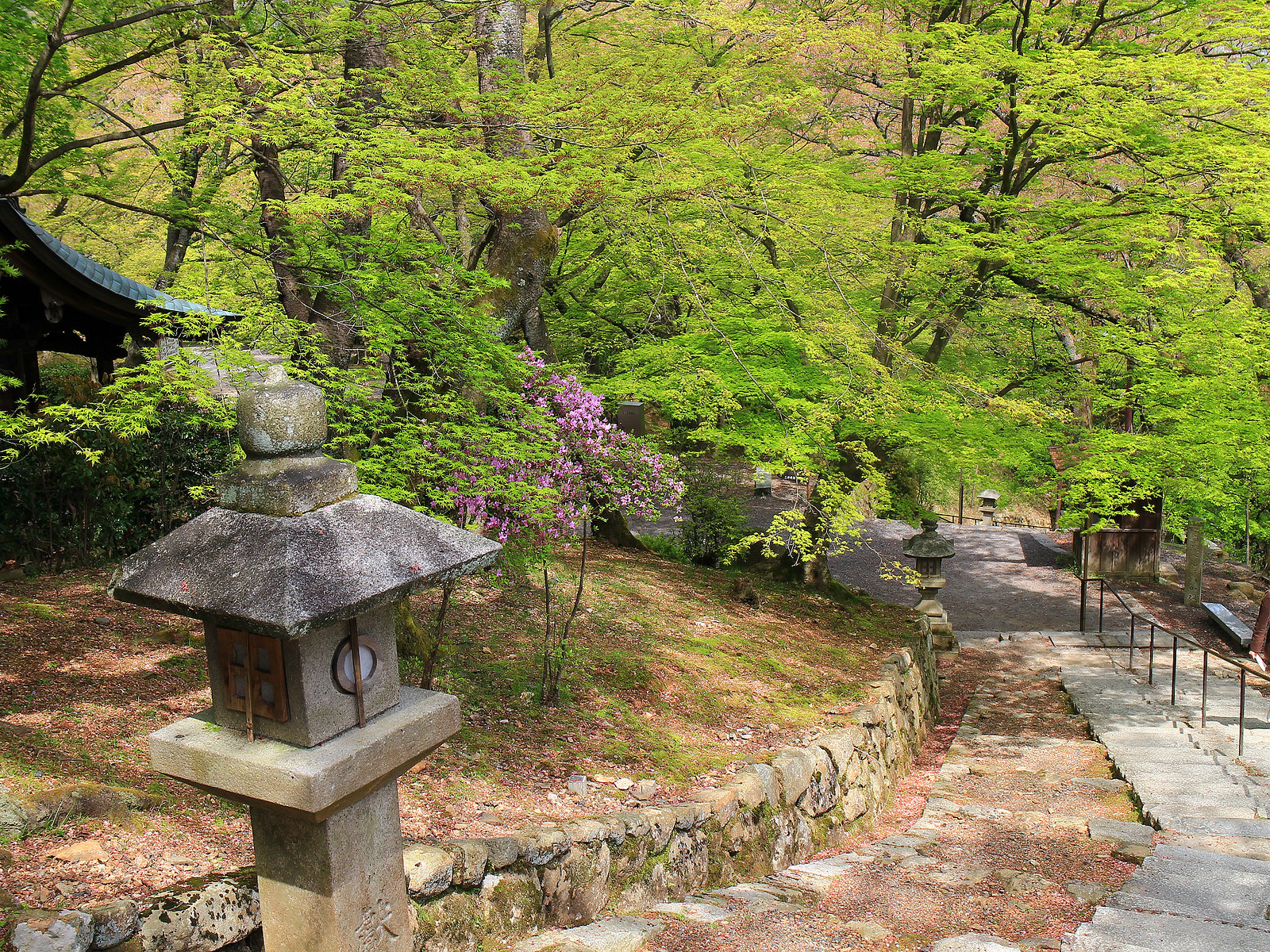 造訪三井寺時,正是櫻花已落入塵土化作泥的新綠時節,賞櫻人潮如潮水般退去,喧囂歸於平靜,甫自寒冬甦醒的楓葉展現清新翠綠身姿,帶來無窮活力與希望。