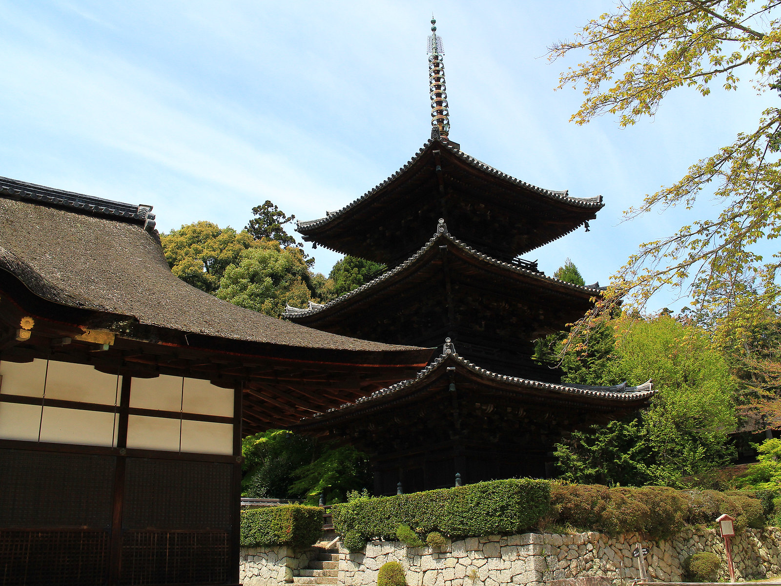 三重塔:重要文化財,建於南北朝時代,本來是大和國比蘇寺(據傳聖德太子開基)的東塔,
