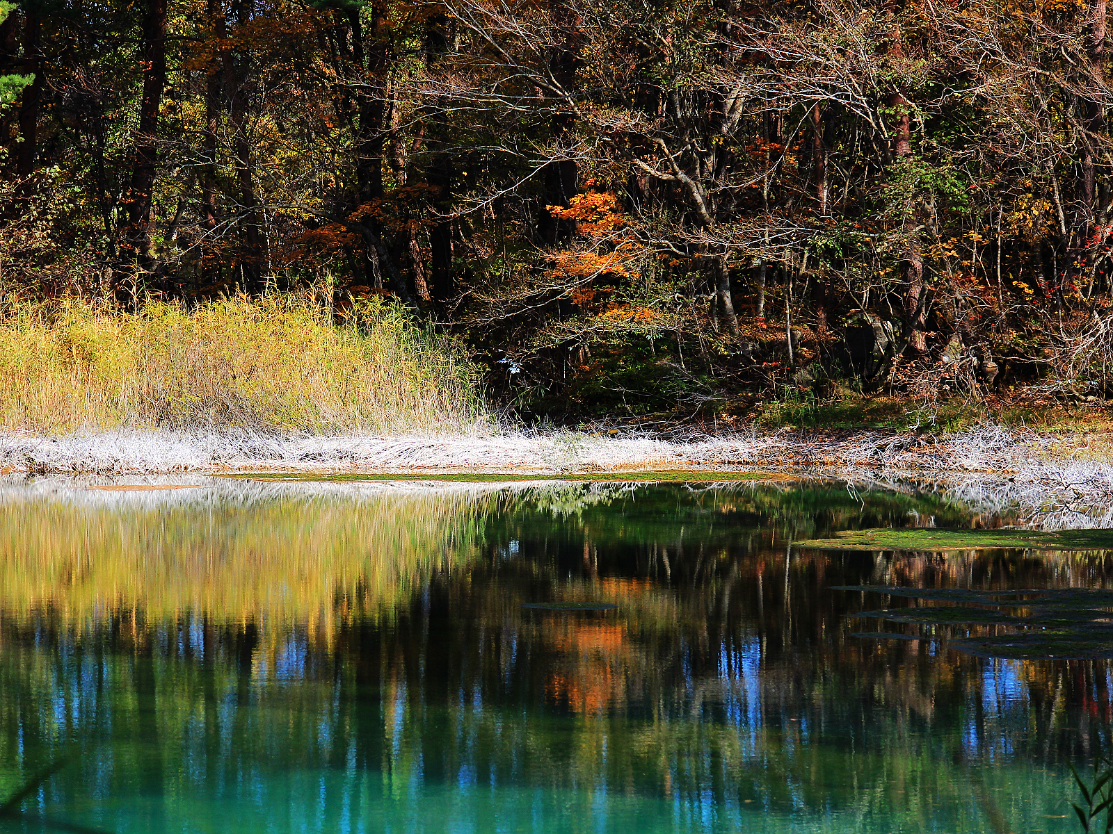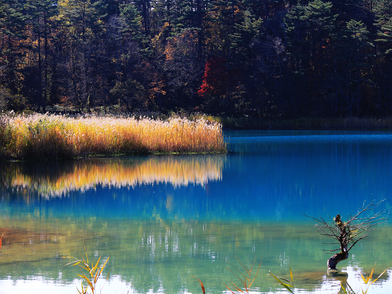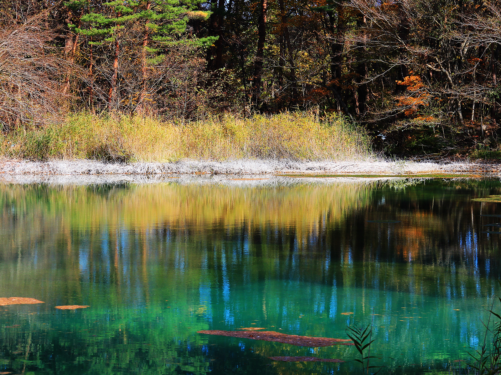 【青沼】白色與金黃深藍翠綠相呼應,倒影如同一幅抽象畫