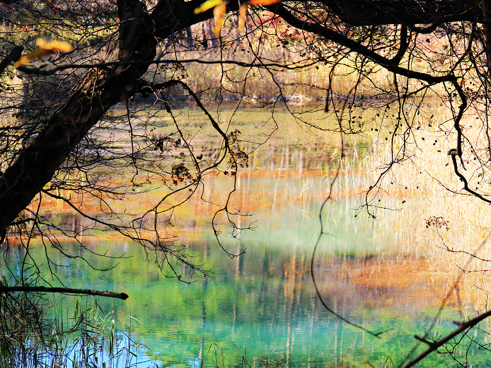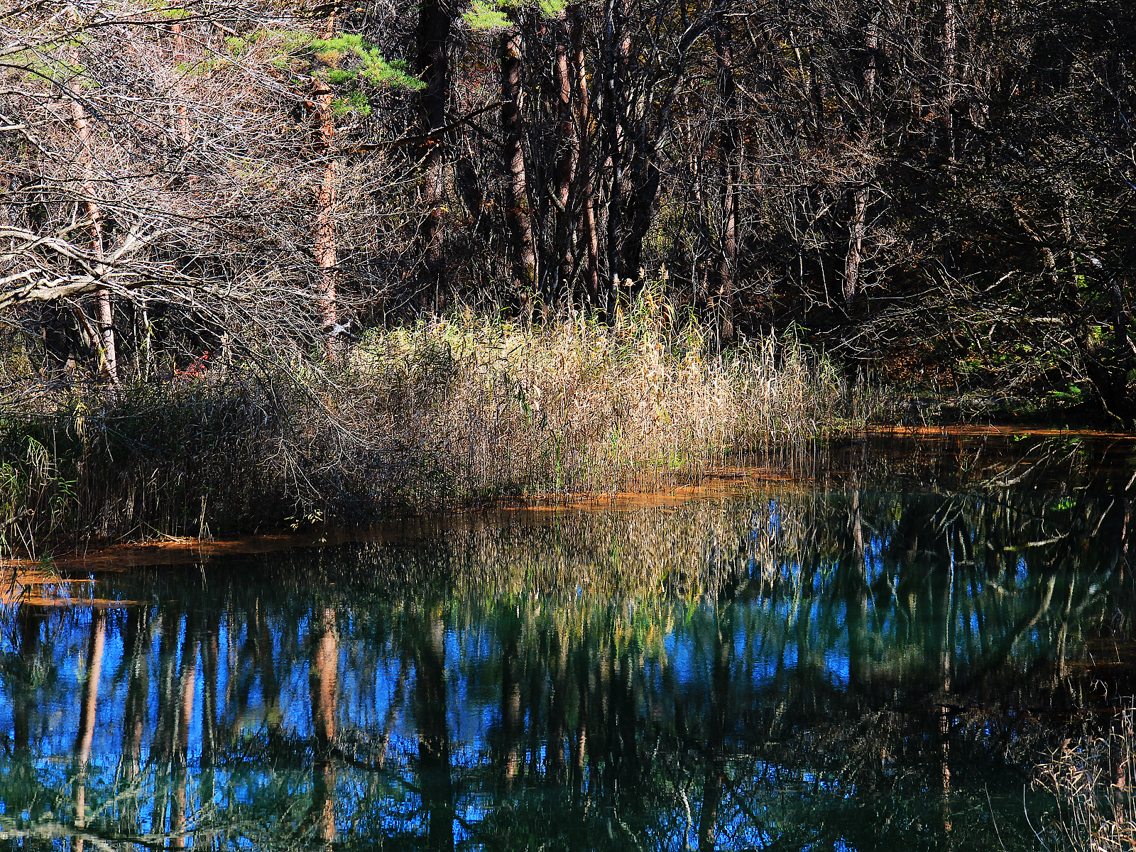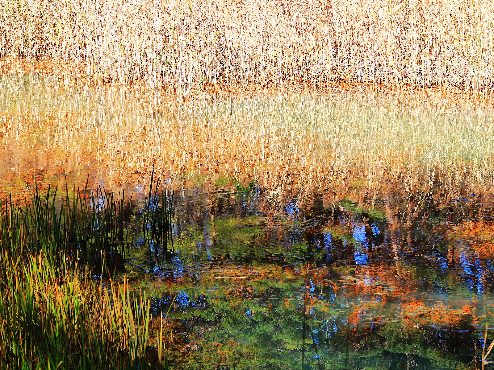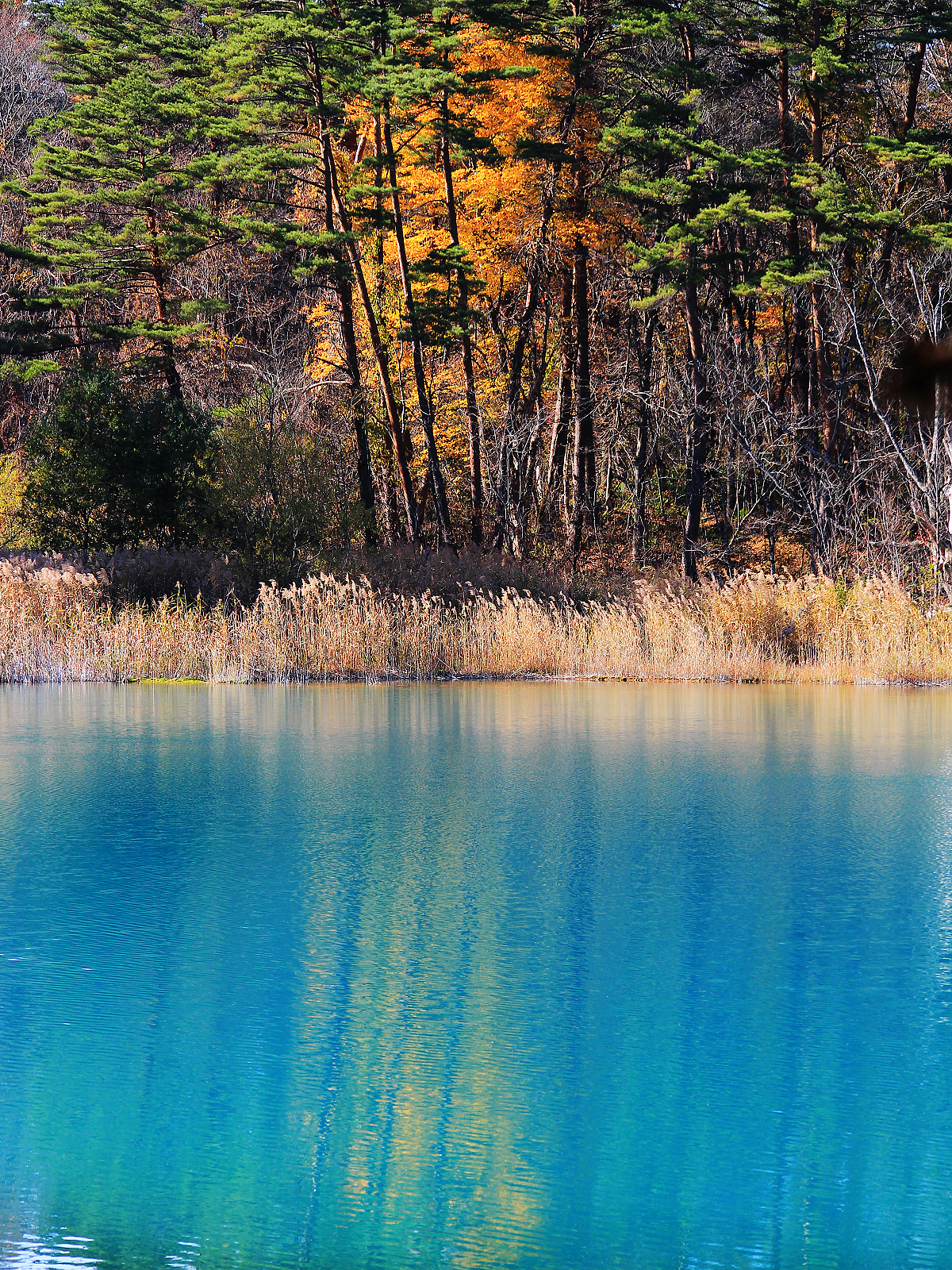 【青沼】白色與金黃深藍翠綠相呼應,倒影如同一幅抽象畫