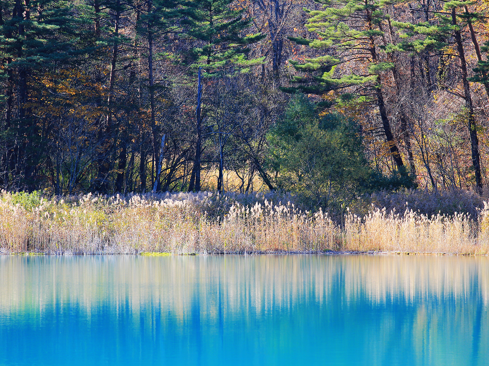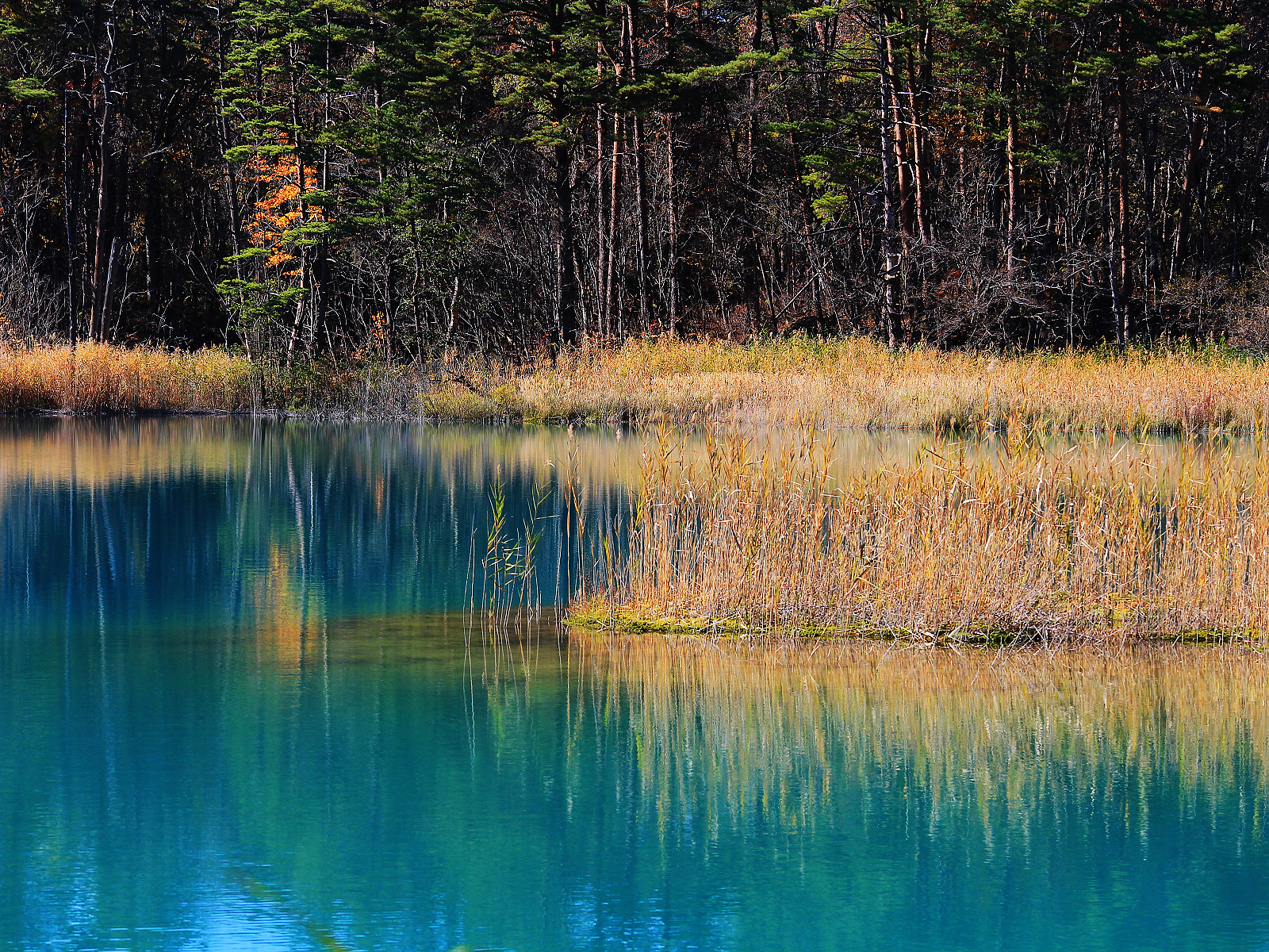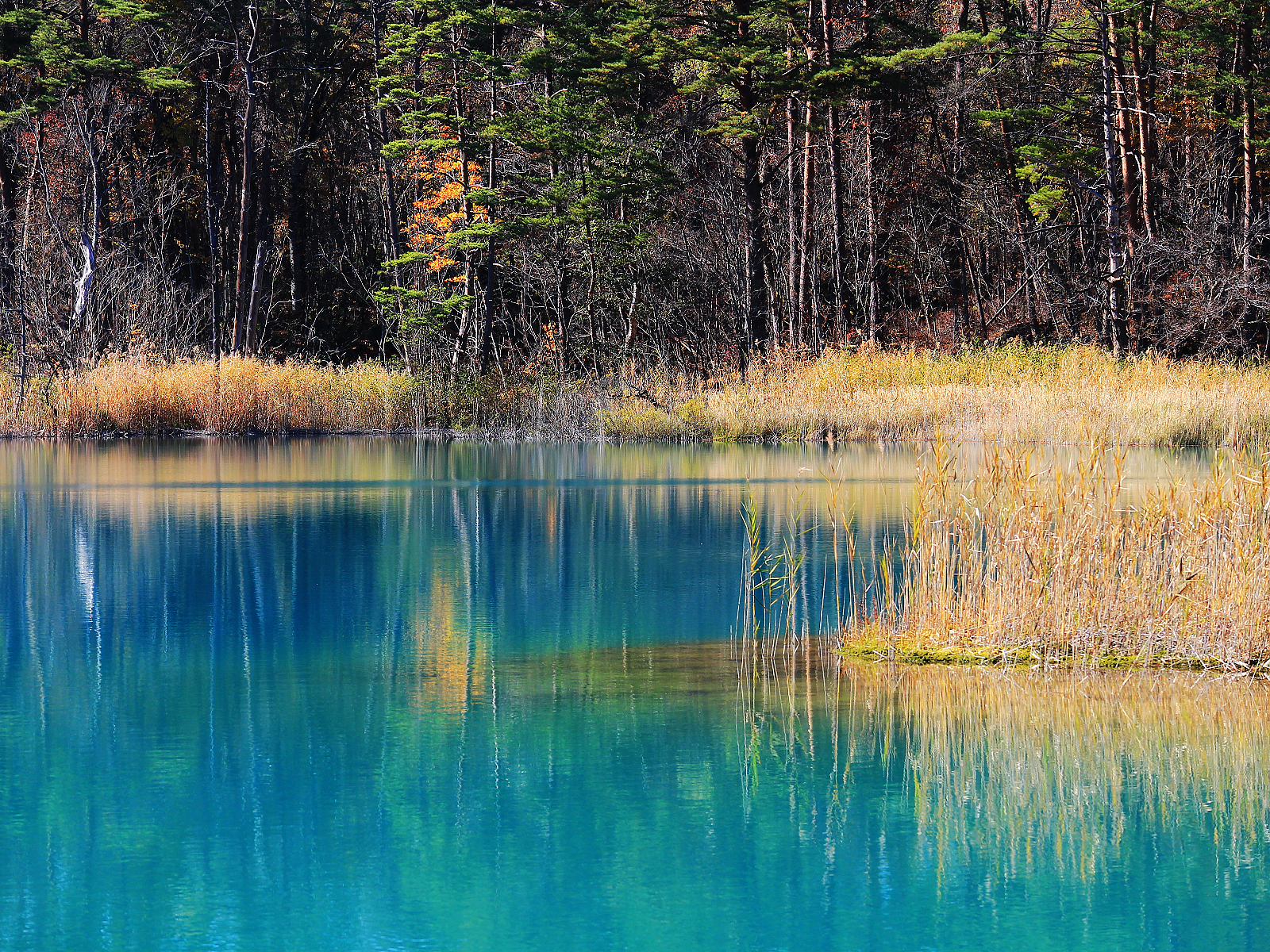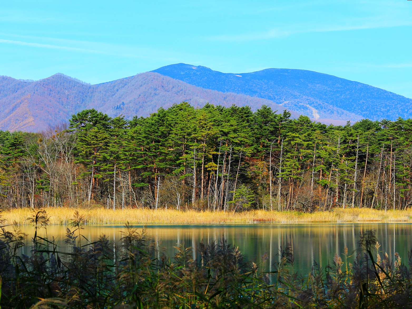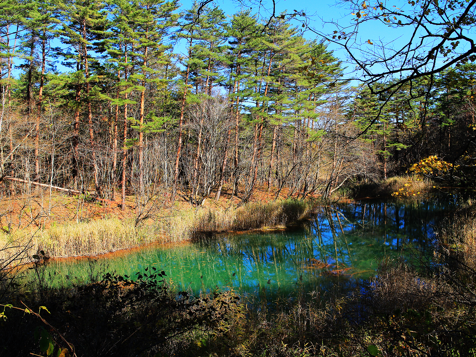 這麼鮮豔美麗的藍綠色令人很難想像青沼源自具有強酸性的地下水,湖畔白色蘆葦就是被強酸湖水漂白而成