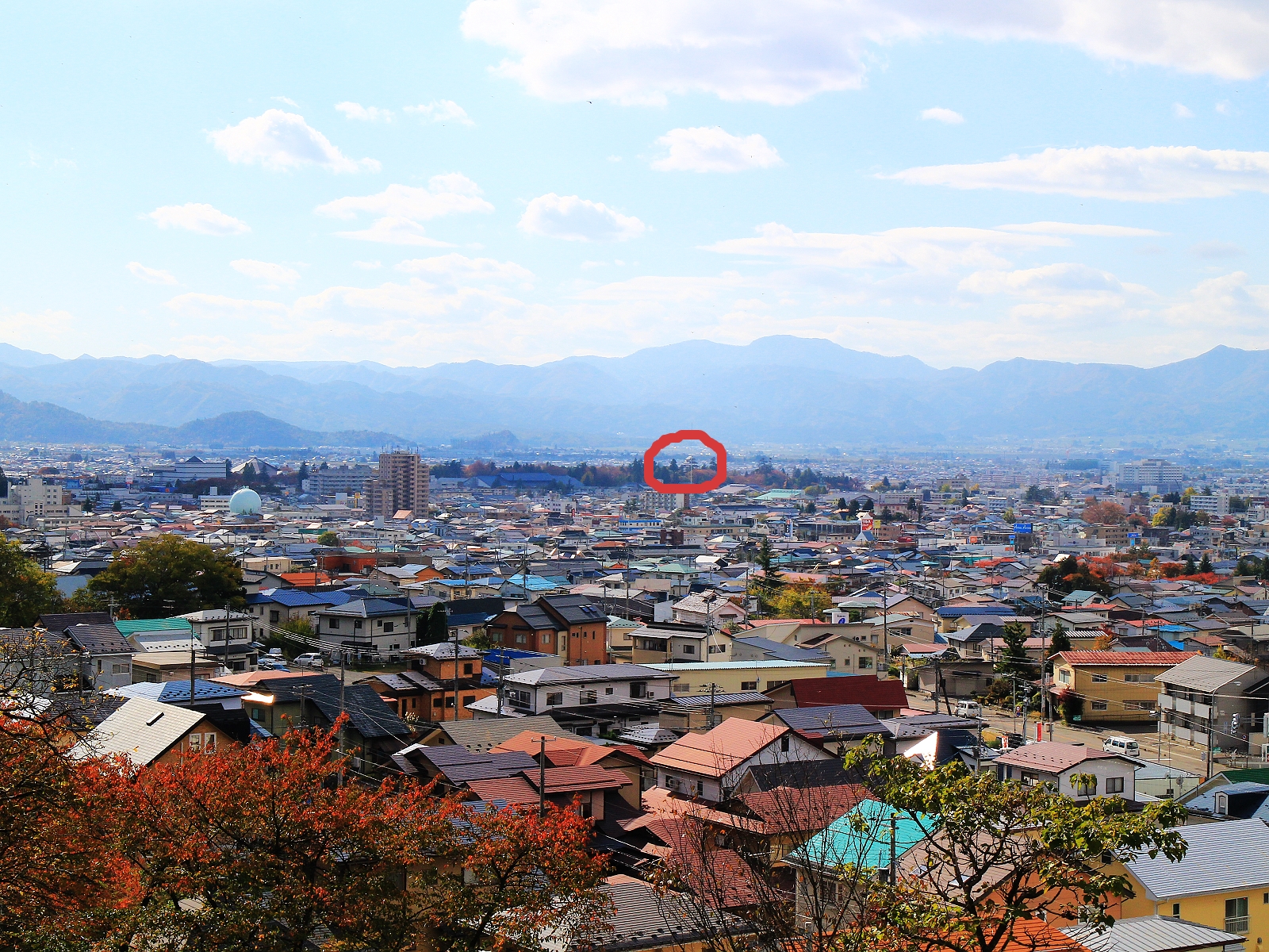 正前方隱約可見鶴城天守(紅圈處),當年的鶴城壯觀多了