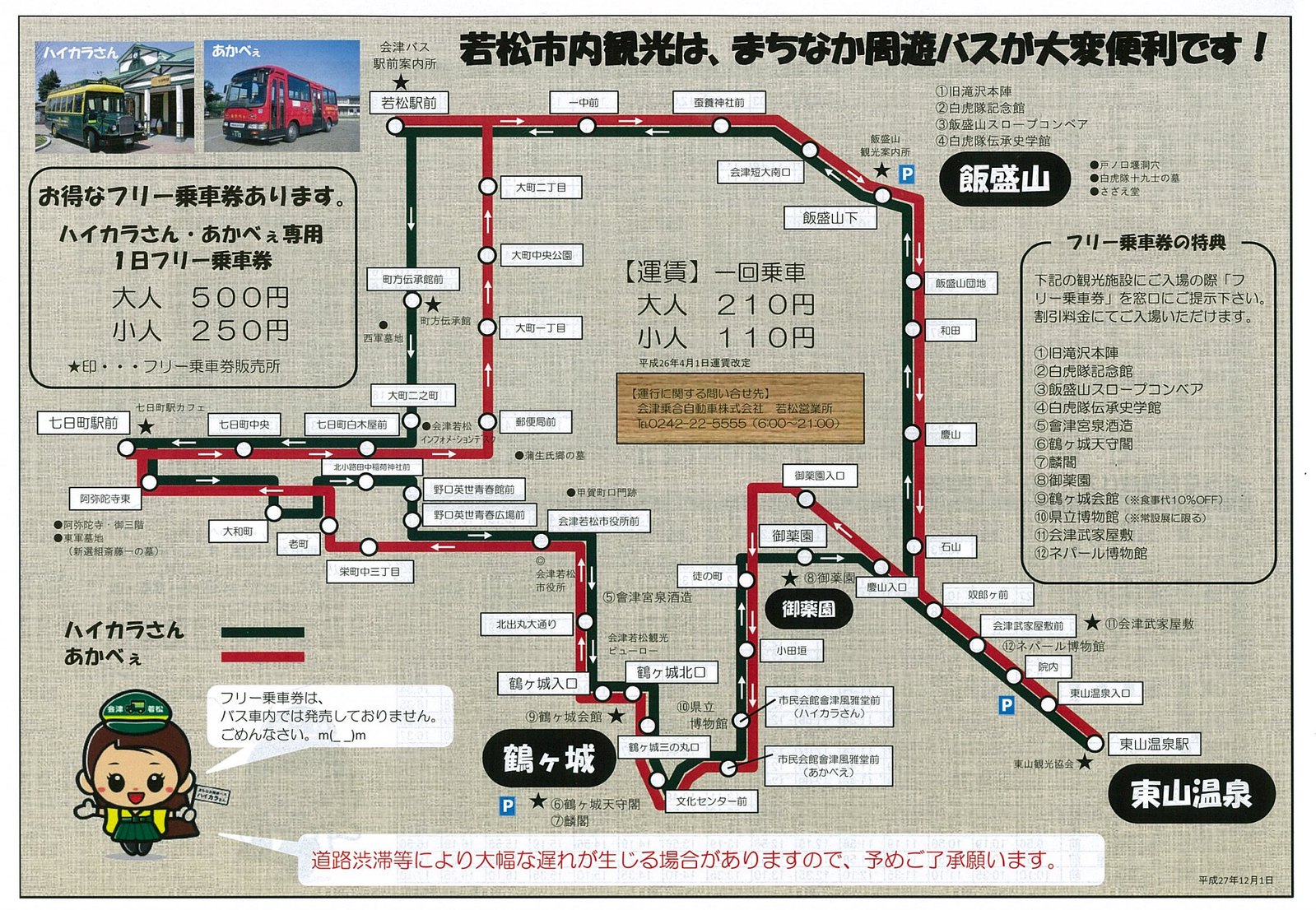 如果去的景點超過兩個,上車前記得在巴士站前的售票亭買500円「ハイカラさん・あかべぇ専用フリー乗車券」才划算