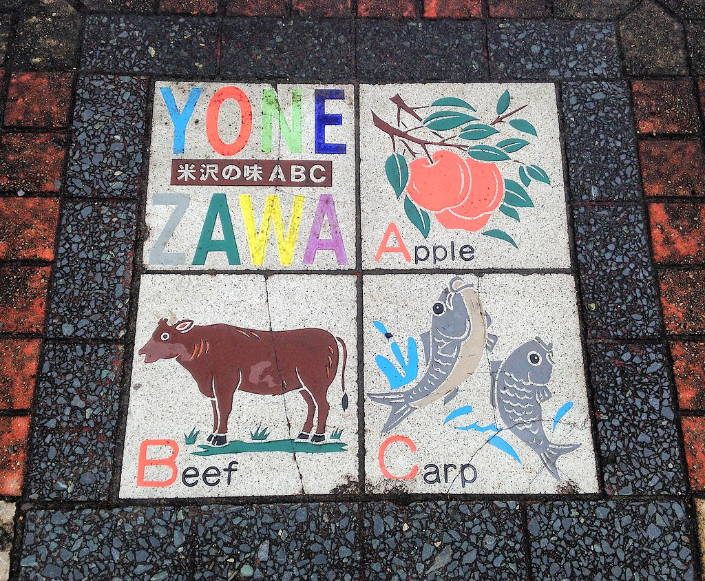 人行道地磚的米澤特產ABC: A蘋果(館山蘋果)、B牛肉(米澤牛)、C鯉魚(米澤鯉)