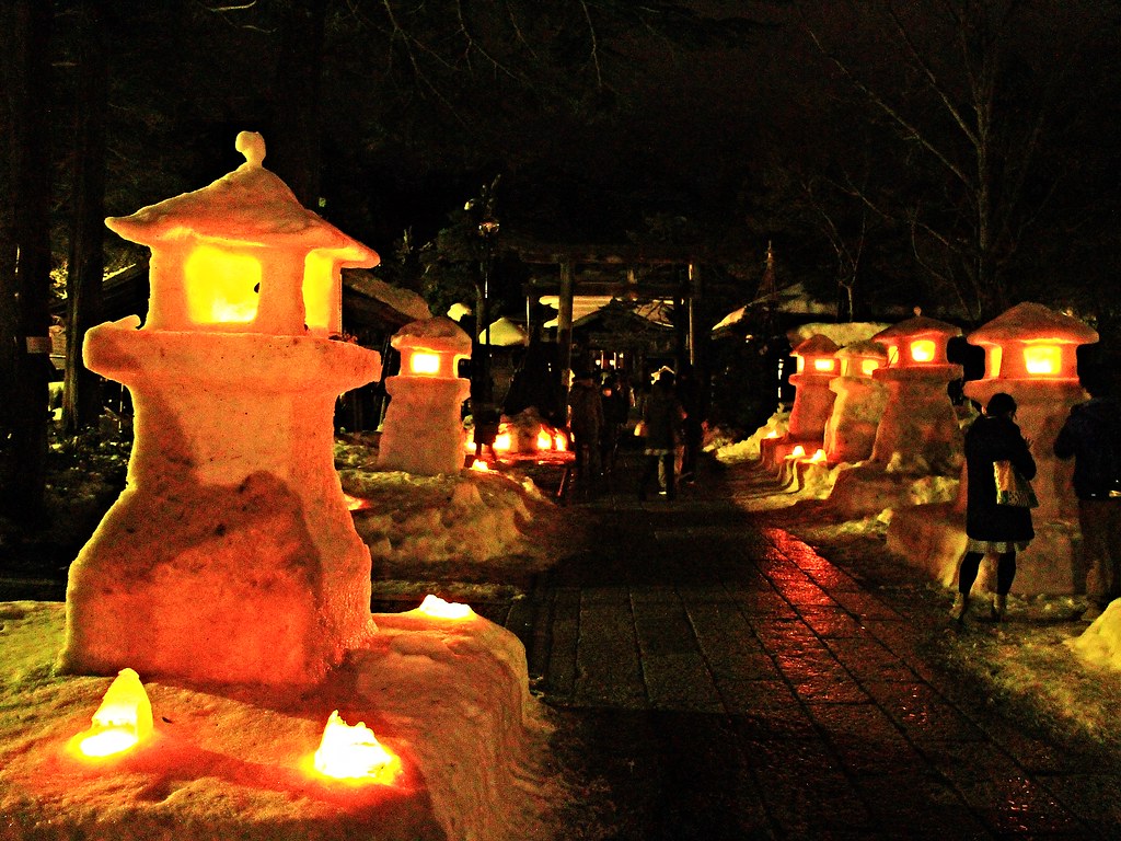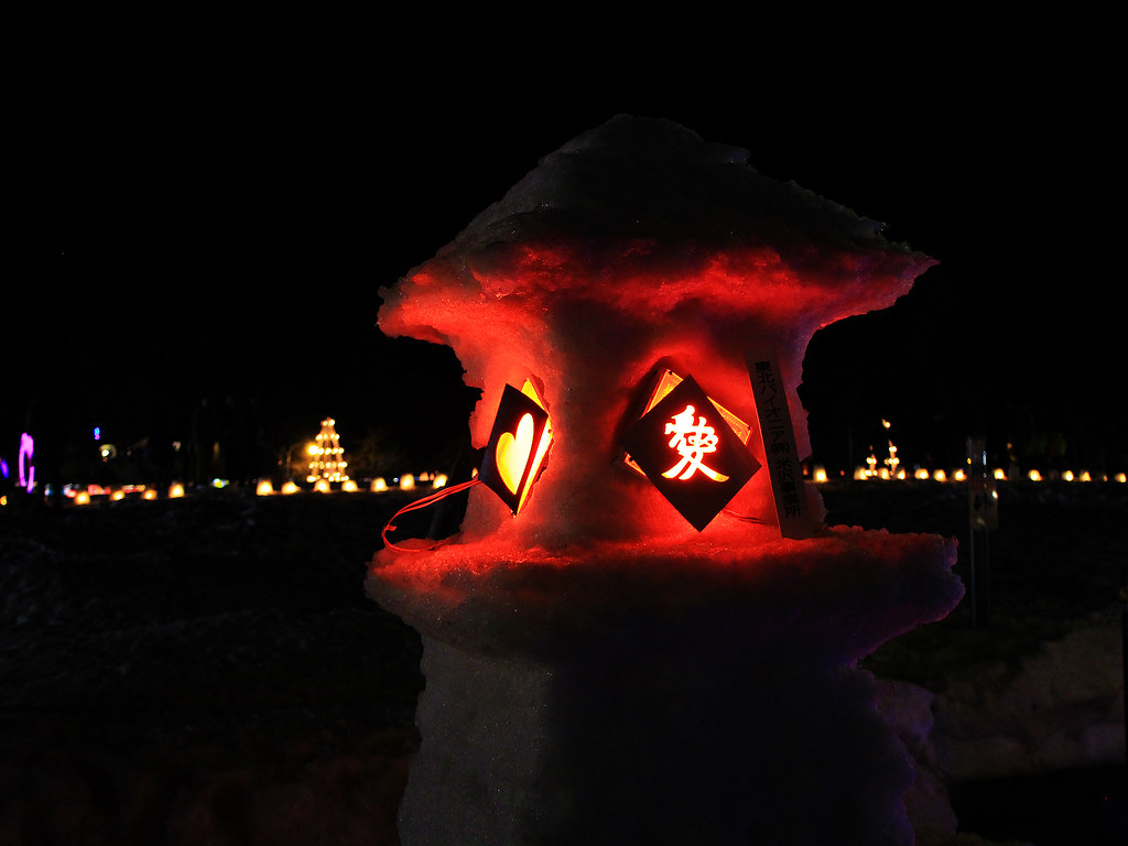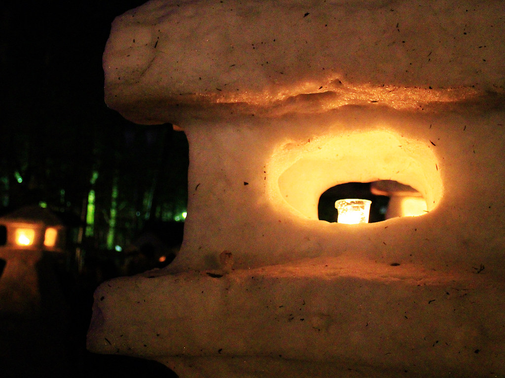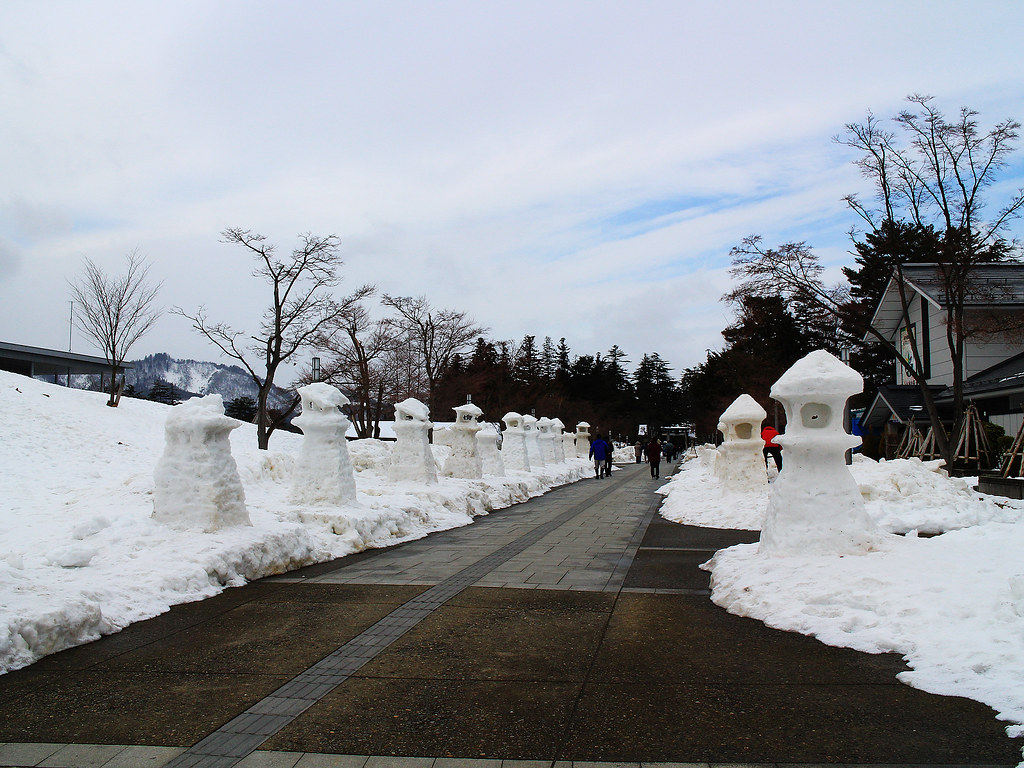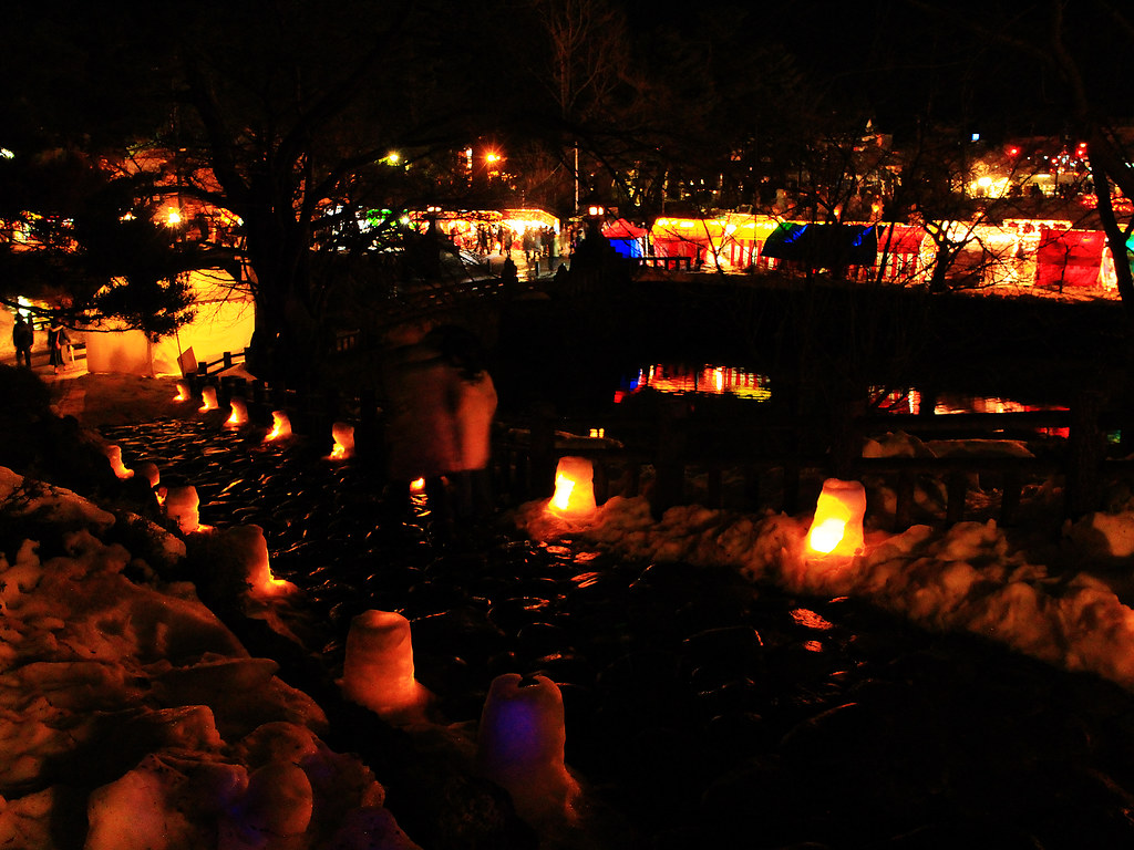這年剛好遇到大暖冬,活動第二天傍晚不少雪灯篭和雪洞逐漸融化,但是閃爍的美麗燈火照亮寒冷幽闇之夜,依然營造出奇幻迷離的氛圍。比起其他知名雪燈祭,米澤的上杉雪燈祭小而美,對於第一次看雪燈的我們,寒徹骨中能有如此體驗已經大滿足。