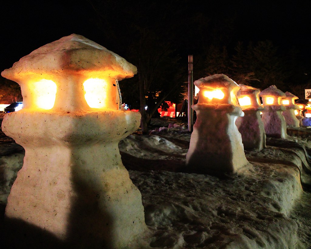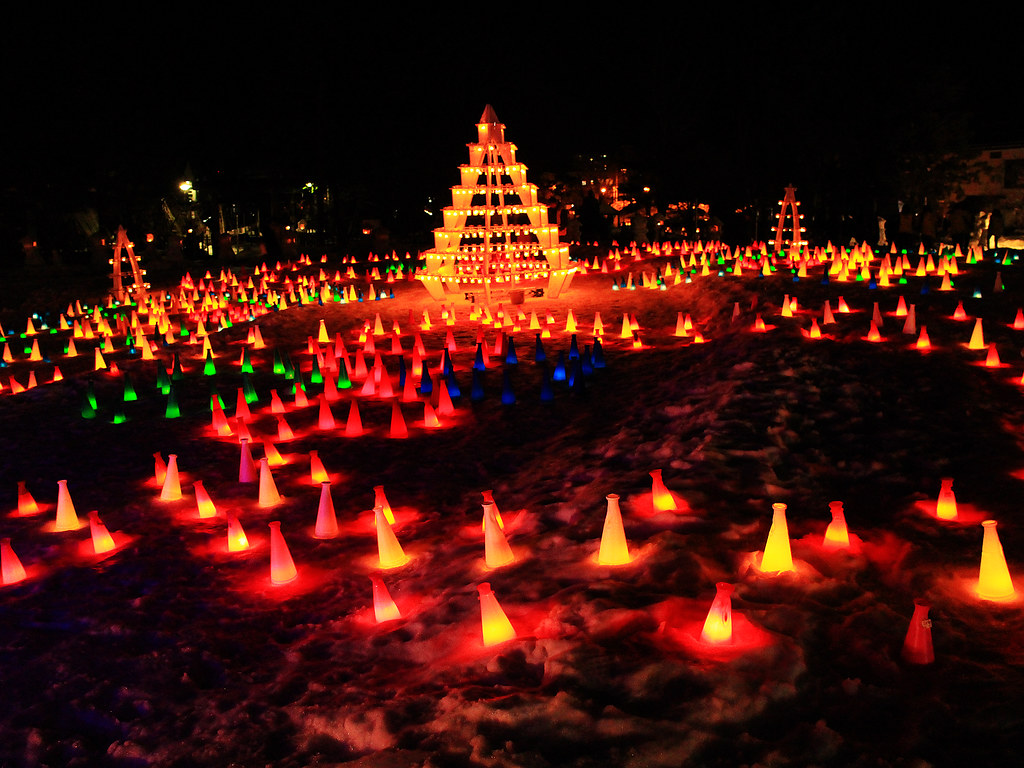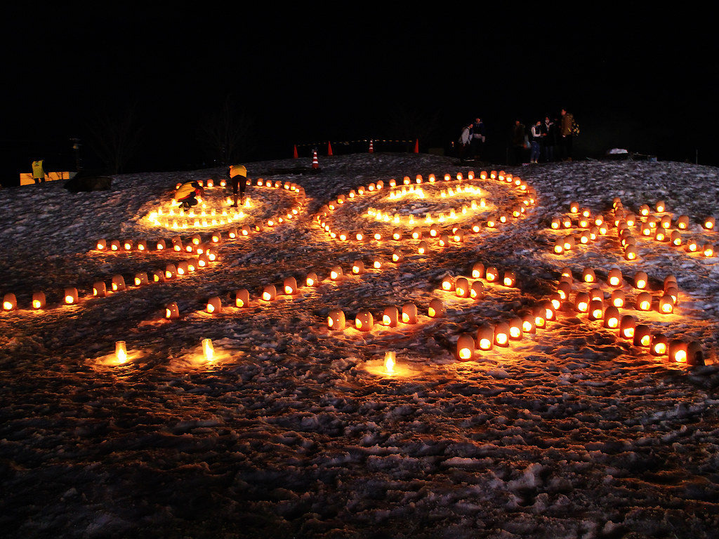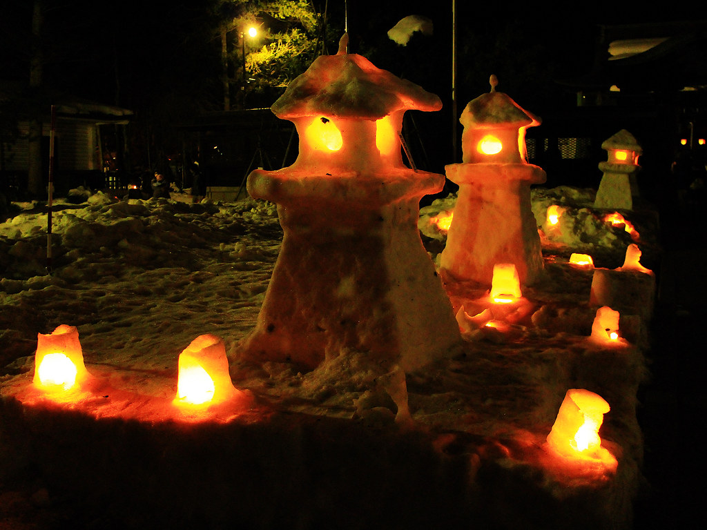 這年剛好遇到大暖冬,活動第二天傍晚不少雪灯篭和雪洞逐漸融化,但是閃爍的美麗燈火照亮寒冷幽闇之夜,依然營造出奇幻迷離的氛圍。比起其他知名雪燈祭,米澤的上杉雪燈祭小而美,對於第一次看雪燈的我們,寒徹骨中能有如此體驗已經大滿足。