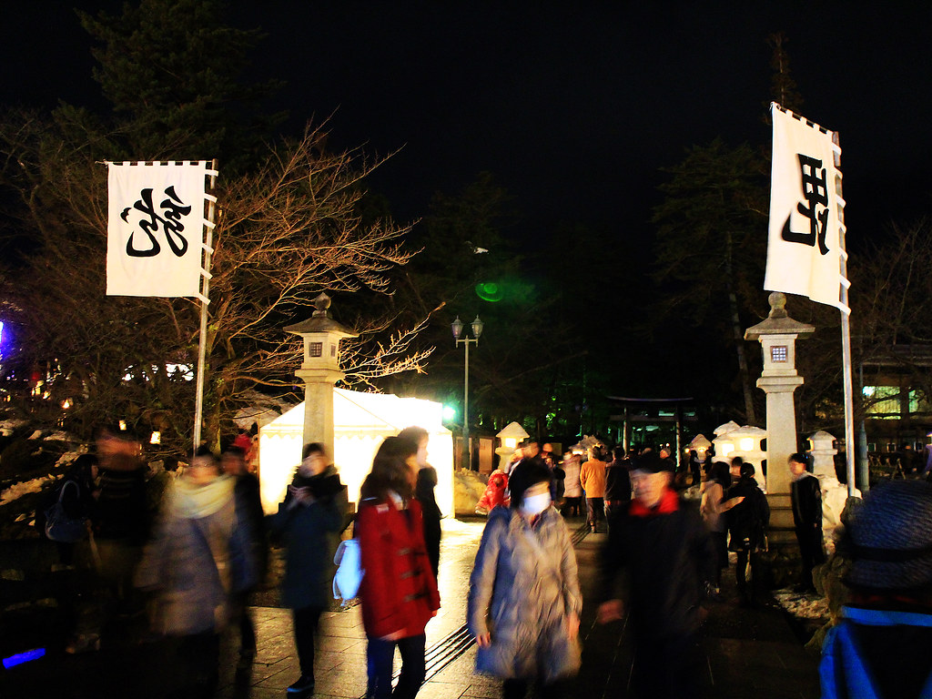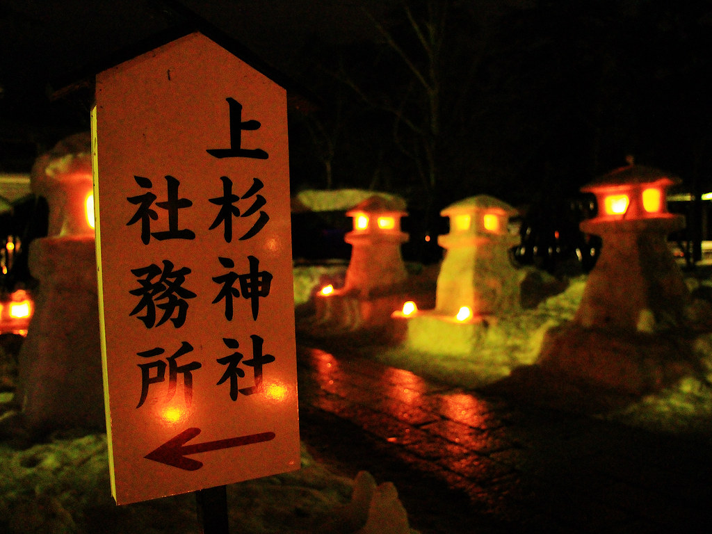 第一屆上杉雪燈祭開始於1978年,此後毎年2月第2個週六日都舉辦這冬之祭典,歷史相當悠久,今年(2016)我參加的是第39屆,明年邁向40周年。短短兩天,主會場所在的上杉神社、松が岬公園一帶約300座雪灯篭(燈籠)和1,000個雪洞裡燃起燭燈,還有販賣各式當地小吃的物產展,慢慢逛一圈下來也花了快2小時。