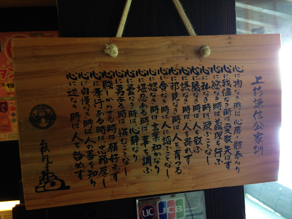酒足飯飽要結帳了,收銀台掛著上杉謙信家訓,