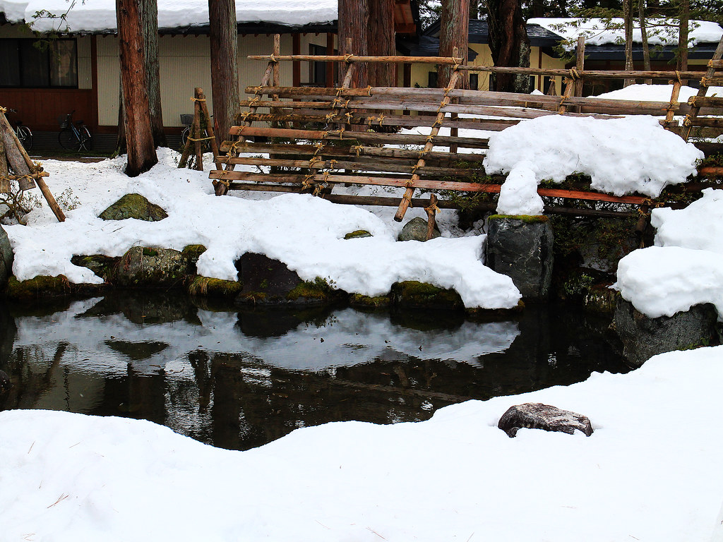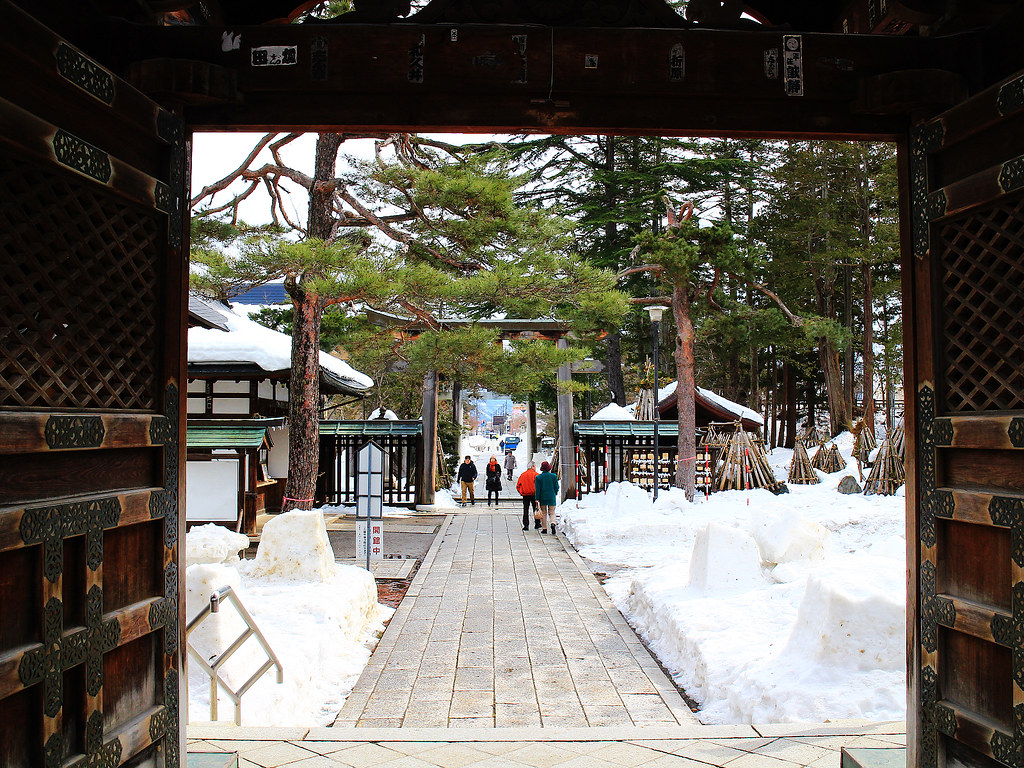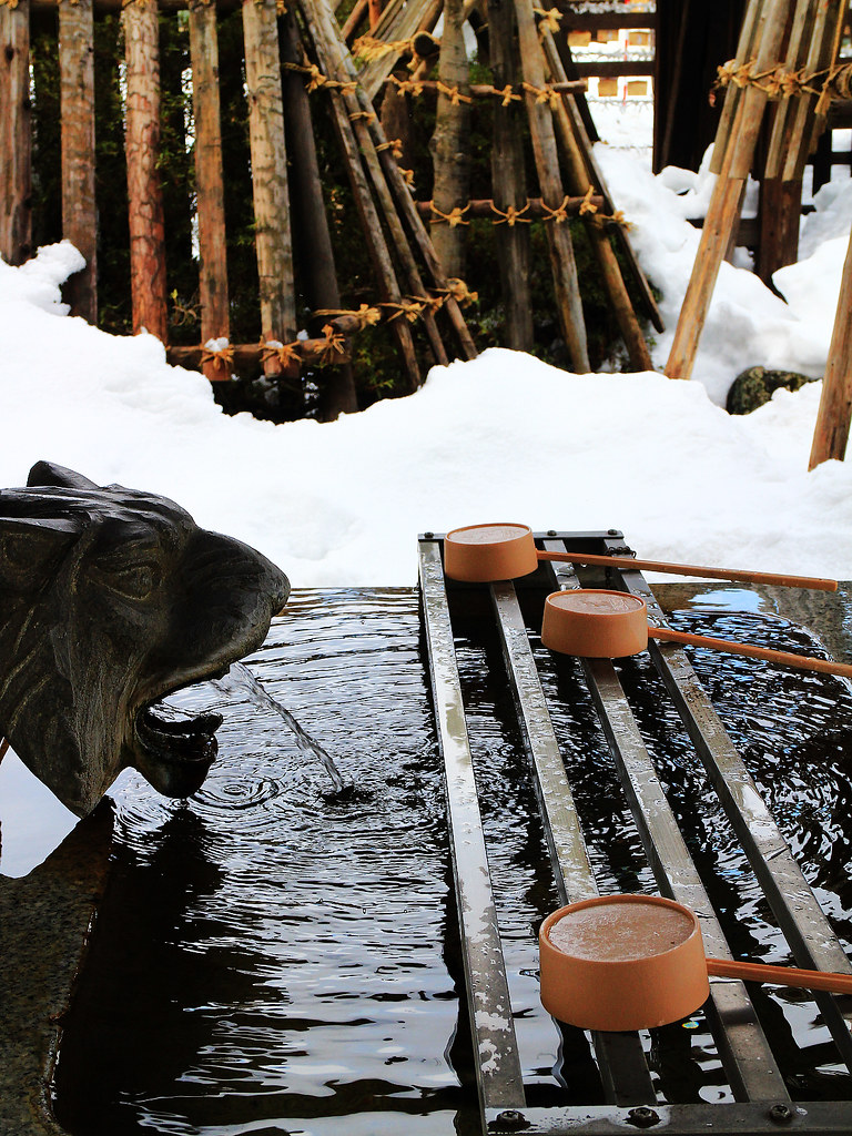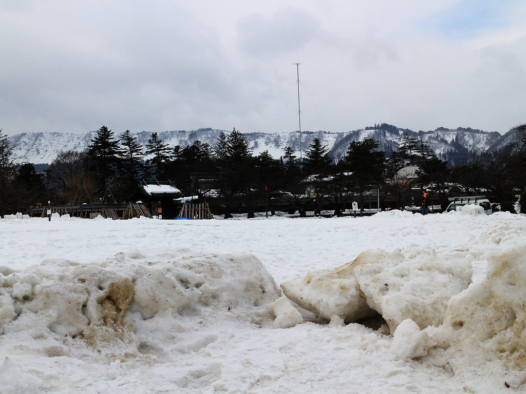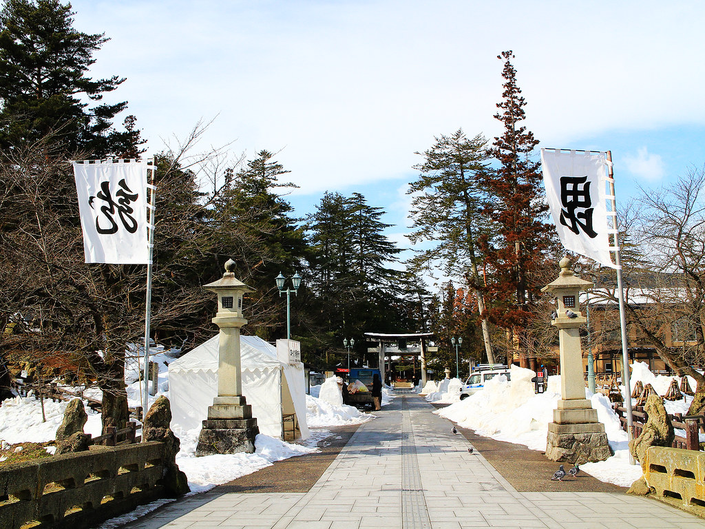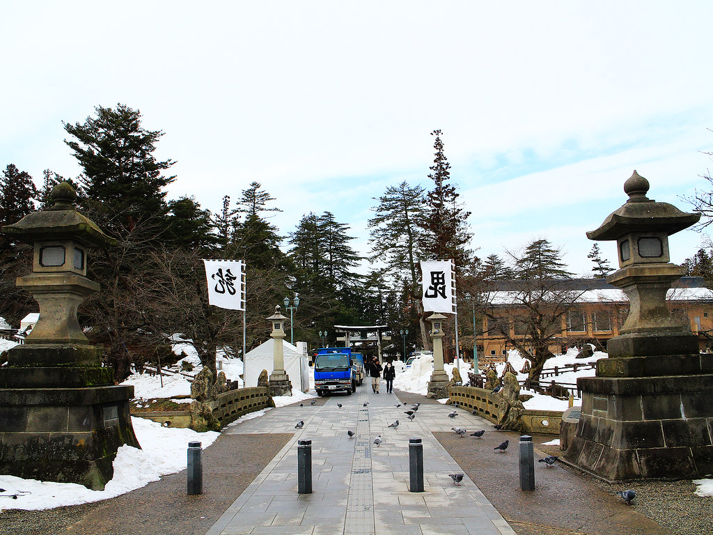 第二天早上,我利用去銀山溫泉前的短短空檔再訪上杉神社,雪霽天晴朗,與前一夜神秘色彩截然不同,在謙信公著名毘字旗與龍字旗飄揚下,往昔上杉一門武將的颯爽英姿與軒昂氣宇躍然眼前。