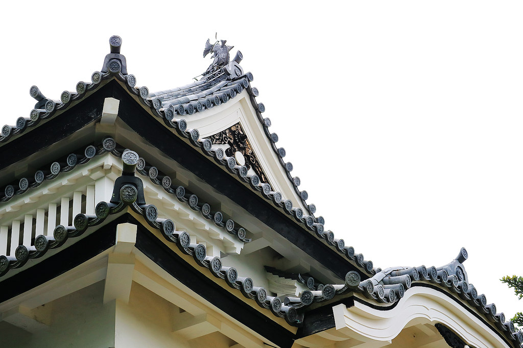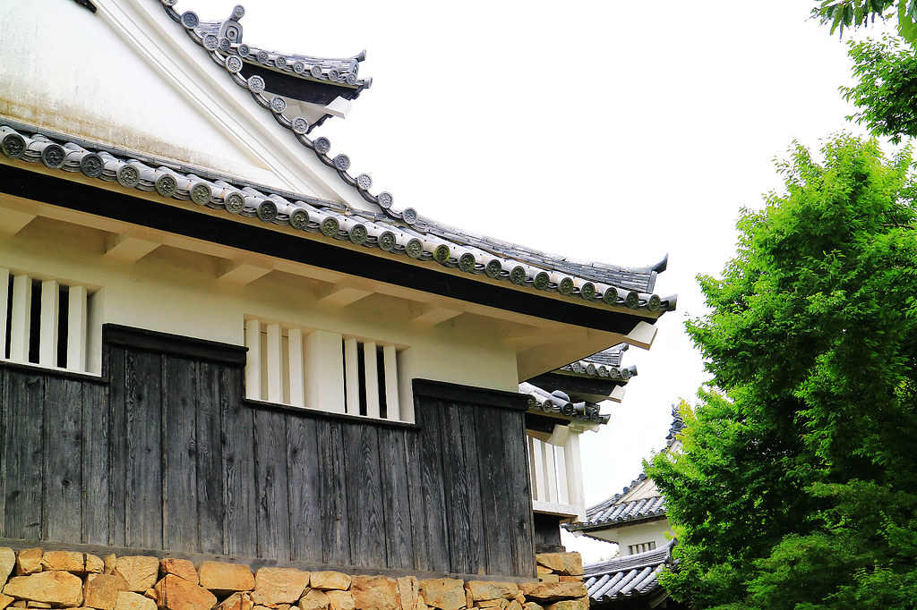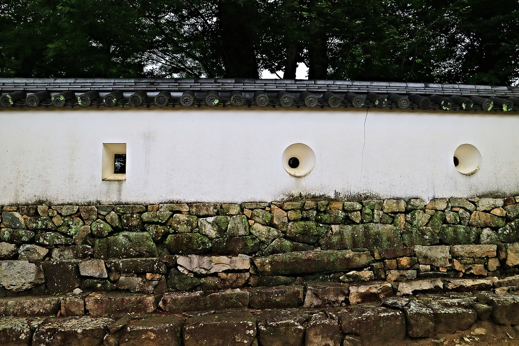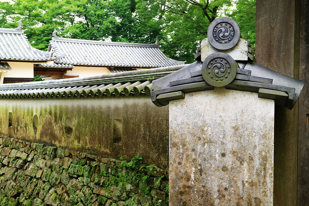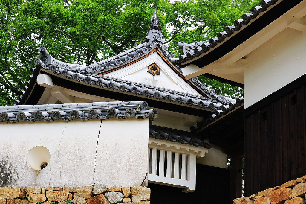 備中松山城代表紋章是水谷氏左三巴紋(左三つ巴/ひだりみつともえ),土塀上的圓瓦都看得到紋章