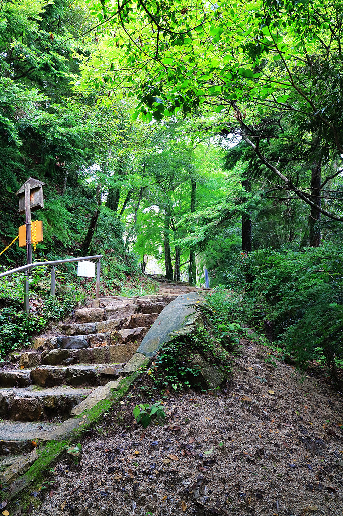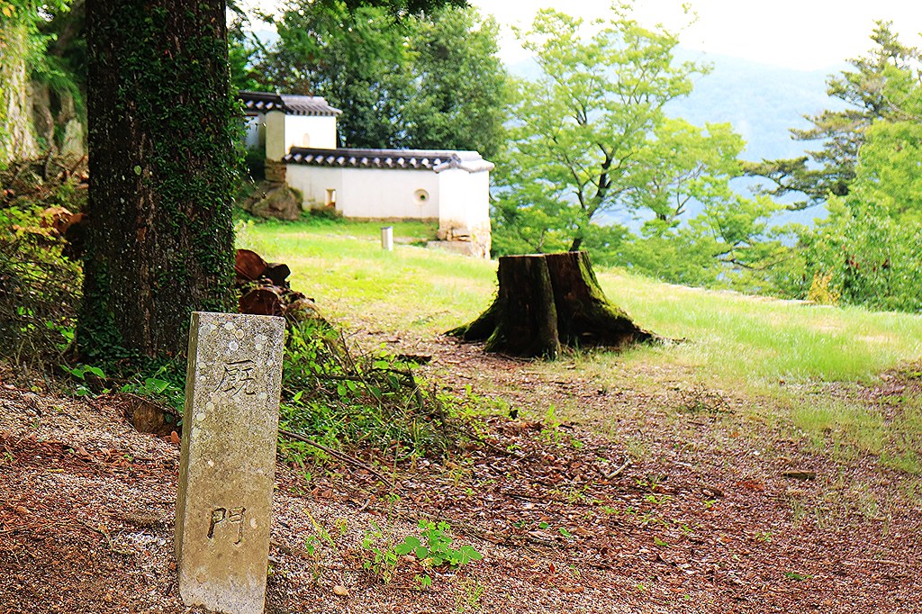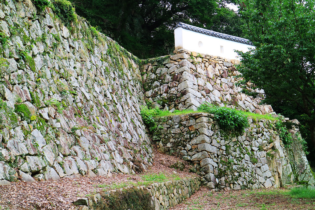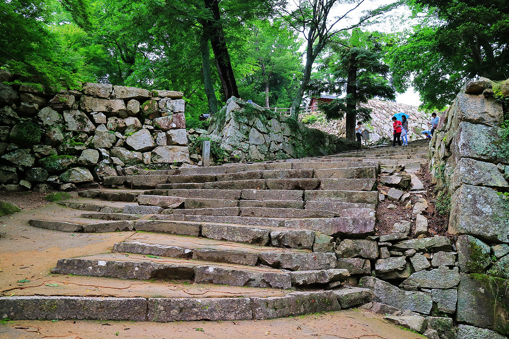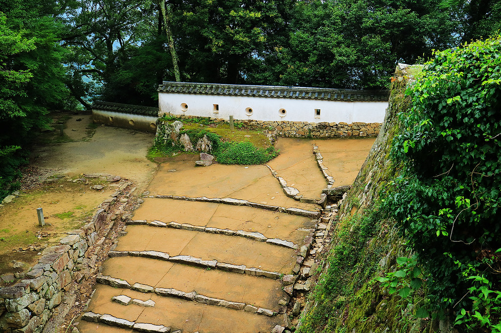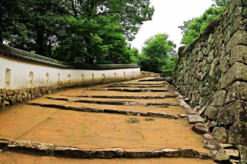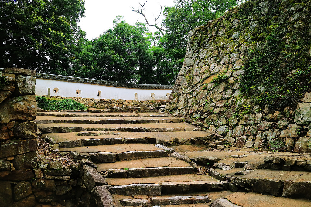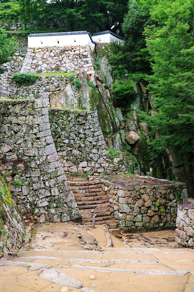 高粱市素有備中小京都之稱,歷史悠久,計程車行駛在蜿蜒小徑中,靜謐城下町有著白牆綿延的武家屋敷與城牆高聳的山麓寺院,高粱川支流紺屋川靜靜流過市街,處處是優雅閒適風情。可惜沒時間,不然漫步在這古老山城想必相當療癒。車行10分鐘左右很快抵達ふいご峠,接著踏上登城山路,我一鼓作氣快步爬行15分鐘,終於看到巍峨的石垣與土塀。