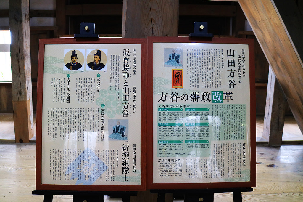 明治時期廢藩置縣前,本州瀨戶內海側由8小國分據,包括備中、備前、備後,備中國大約在現今岡山縣西南部(備前是岡山縣東南部、備後是廣島縣),戰略地位重要。尤其當時稱備中松山藩的高粱市位居備中國中心點,更是兵家必爭之地,早在鎌倉時期(1240年),已於高粱川東岸臥牛山築起城寨,戰亂頻仍藩主時常異動,城寨也逐漸擴張。戰國時期這裏更是壓制中國地區的據點,毛利、宇喜多、尼子、織田等各路知名武將都曾在此設置陣營或居所,位於海拔430公尺山頂的天守是江戶時期(1693)修築完成,為現存12座天守中最高的山城(現存天守是指江戶時期或之前所建,保存至今的天守)。