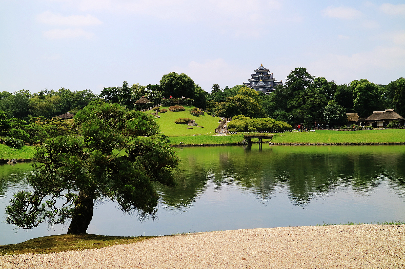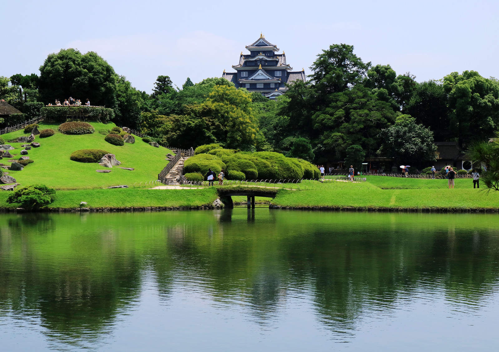 這座完工於西元1700年的池泉回遊式名園,因為建於岡山城後方,本來稱為「後園」,明治4年才引用范仲淹「先憂後樂」典故改名「後樂園」。從江戶時代至今,儘管歷代藩主加減增修與天災人禍毀損的復原,皆大致維持初建時樣貌,屹立歷史洪流三百多年。從喧囂市區進入園中,令我眼睛為之大亮,總面積約13公頃的腹地內,以園路、水路將遼闊草坪、池塘、假山、梅林、茶田、茶室等串連一氣,借景園外岡山城與周邊群山,各種花卉植物隨四時遞嬗爭奇鬥艷。漫步園中小徑,隨時都有柳暗花明又一村的悸動與悠然見南山的寫意,真不愧是元禄文化(江戸時代前期、元禄年間)代表庭園,榮獲日本米其林綠色指南三星的確實至名歸。