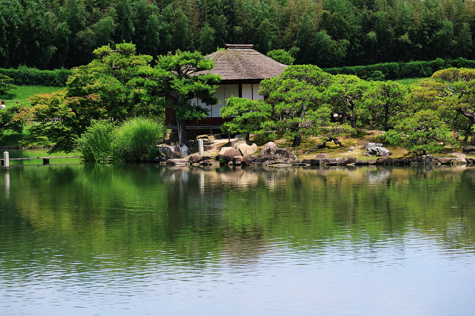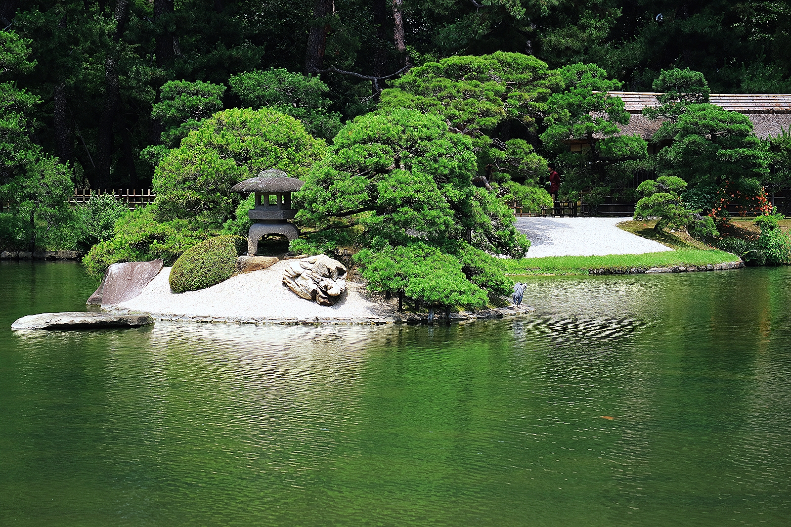 廉池軒是少數逃過第二次世界大戰戰火的建築物之一,橫跨池面的石橋和對岸小島仍然展現過去的原貌。