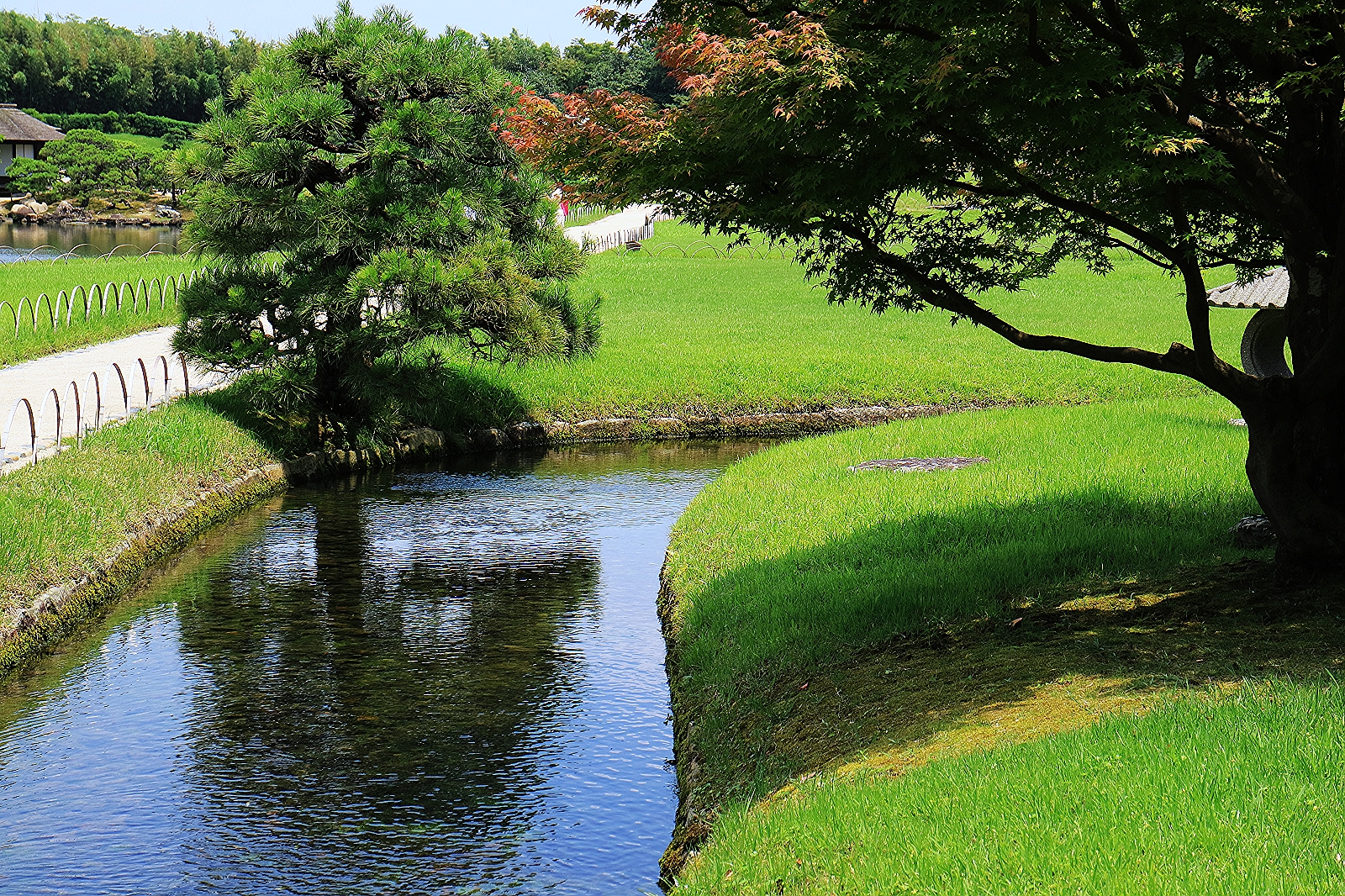 後樂園一大特色就是水景造園非常雅緻,水天一色相互輝映,使景色更加旖旎多姿。江戶時期是從旭川上游4公里處引水至後樂園,用於園內池塘、水路等造景,現在用的是伏流水。