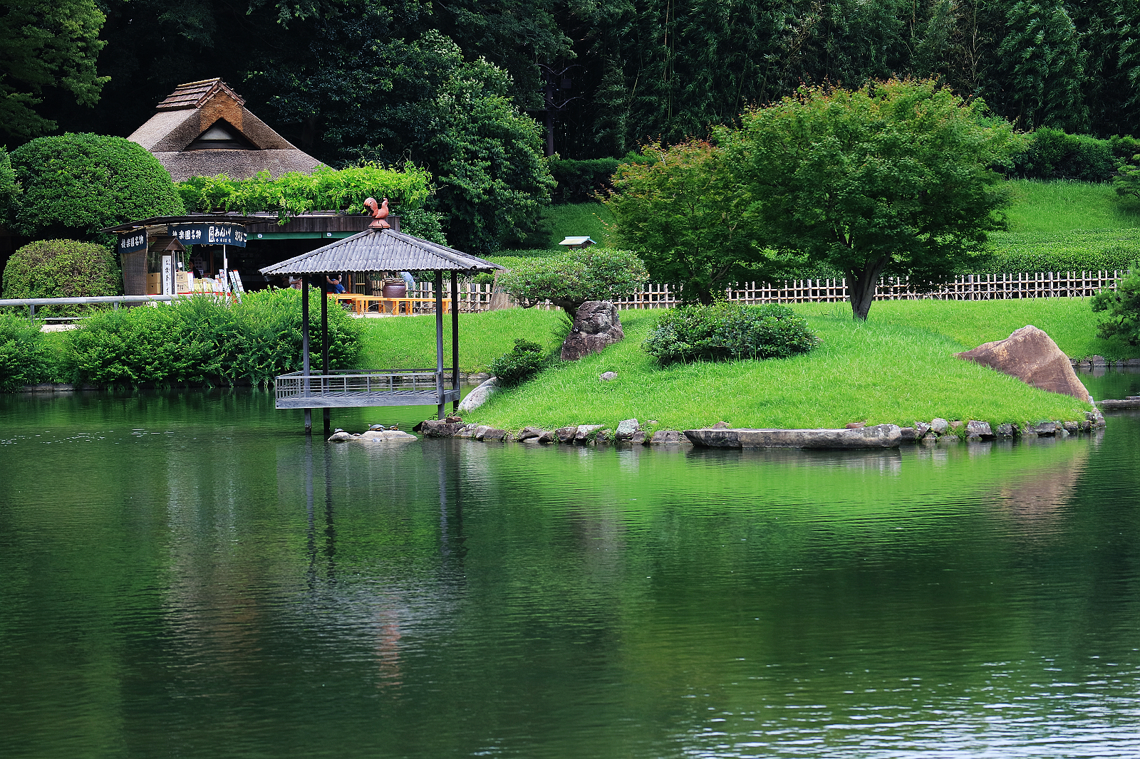 畫面儉樸素雅建築為「流店」,流水穿過建築物中央,是日本罕見設計。藩主漫覽庭院休息處所。