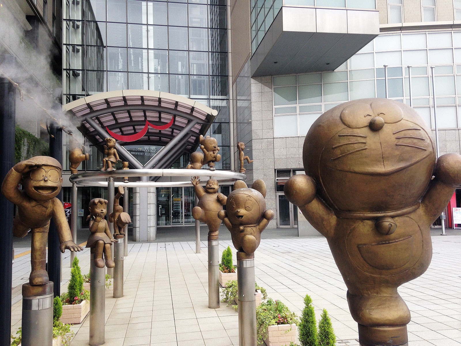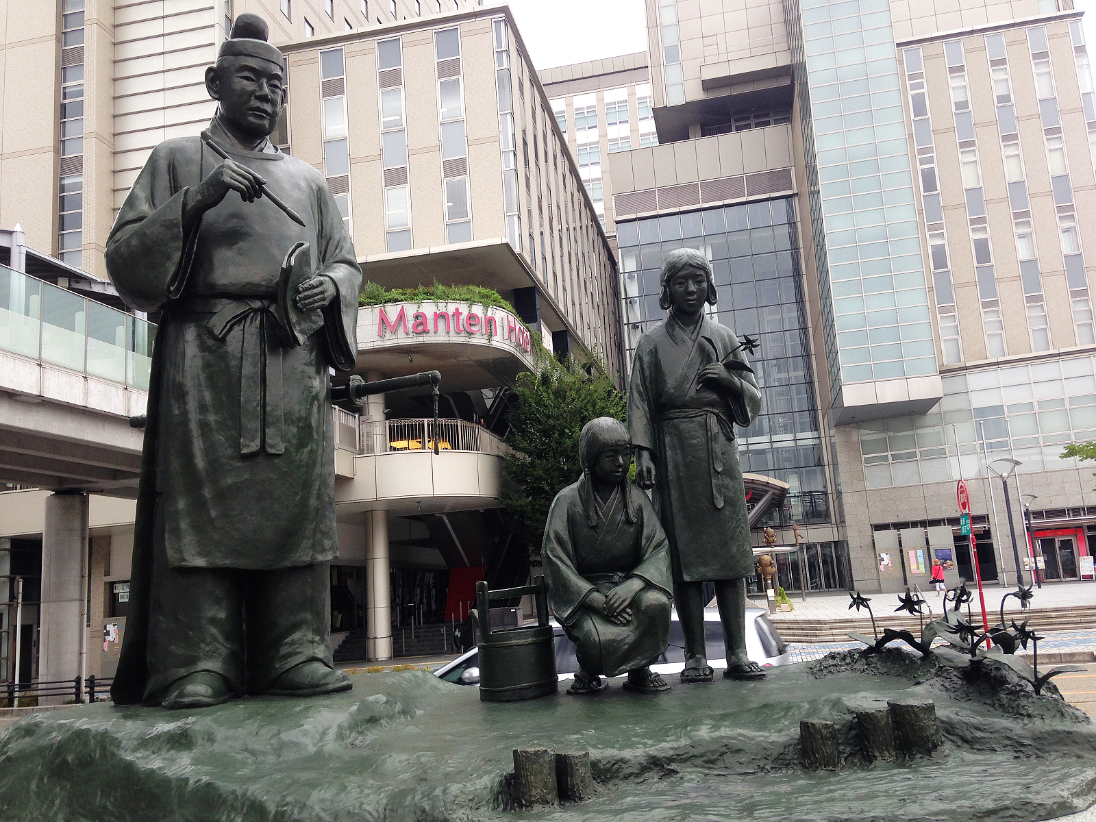 車站前大伴家持像與後方哆啦A夢相映成趣