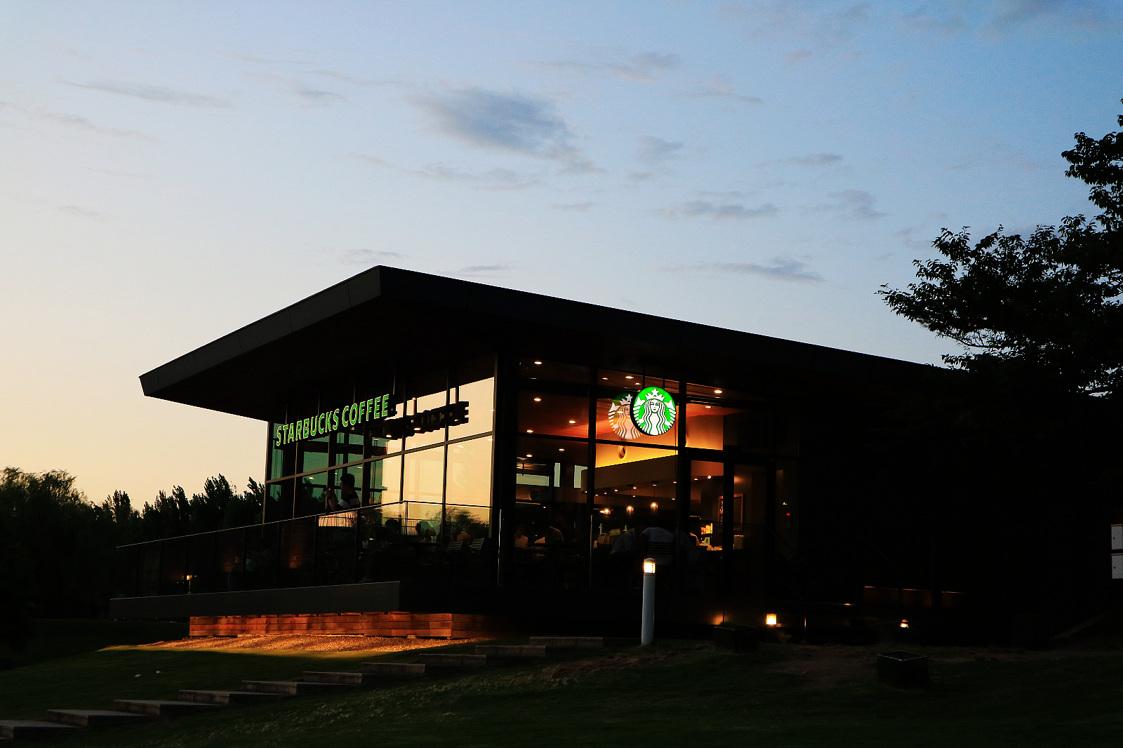 可眺望美麗水景的Starbucks,不論透過室內大落地窗或戶外陽台座椅,都能一邊享受咖啡一邊飽覽旖旎水色