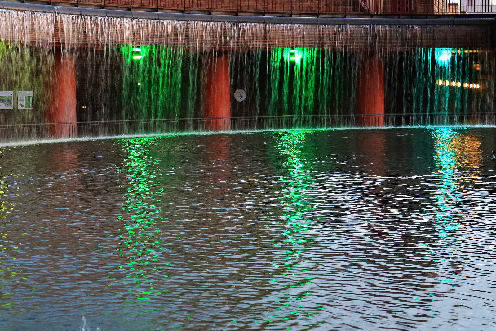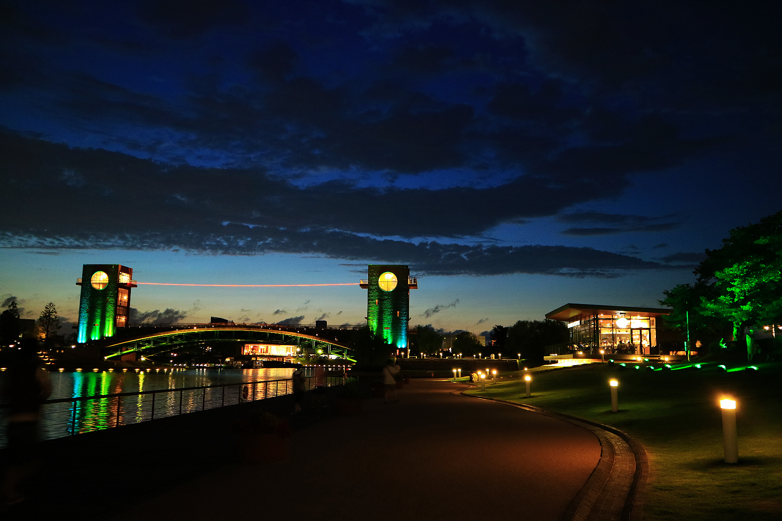 漫步在運河旁寬闊徒步區,從噴水廣場霓彩水舞變換,至入夜後天門橋瞭望塔串接的永結同心,構築了旖旎炫目的世界。