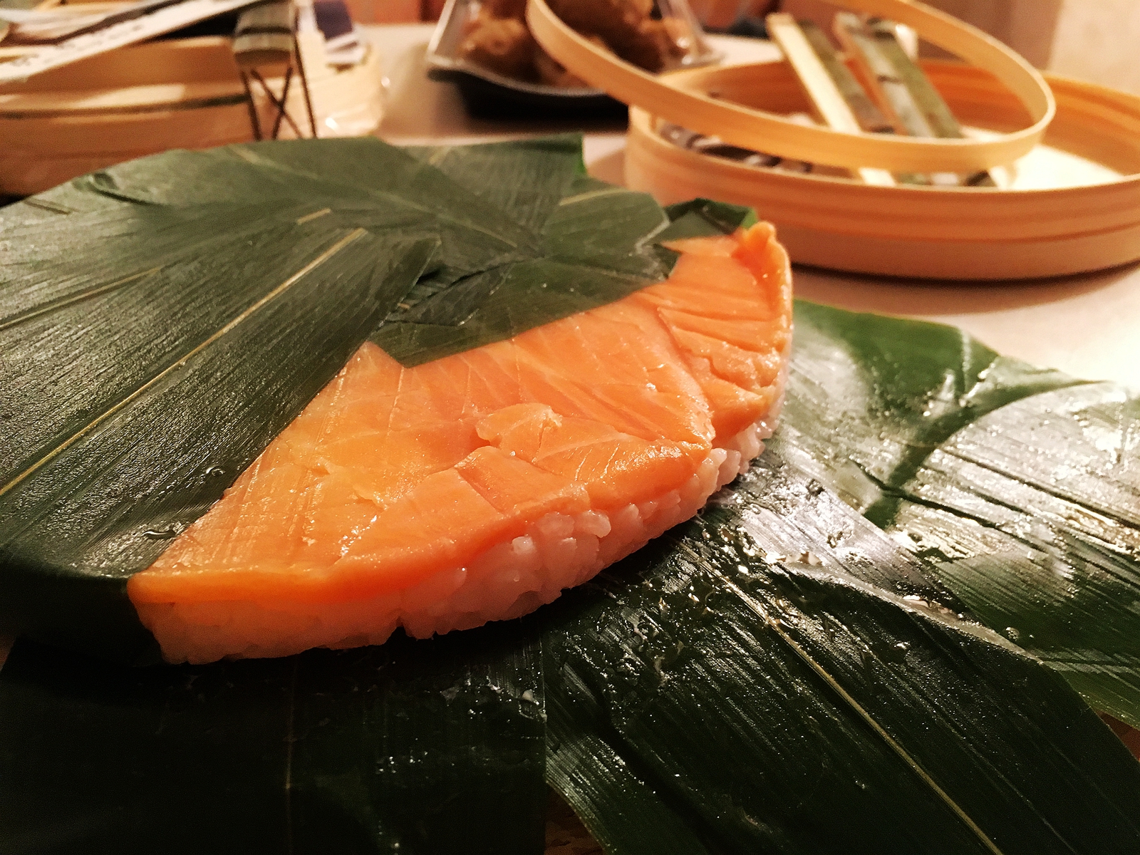 鱒魚肉經過鹽巴醃製與加壓呈現淡淡粉橘色,多了魚肉纖維感帶來的嚼勁,及笹葉包覆擠壓的淡淡竹葉香氣