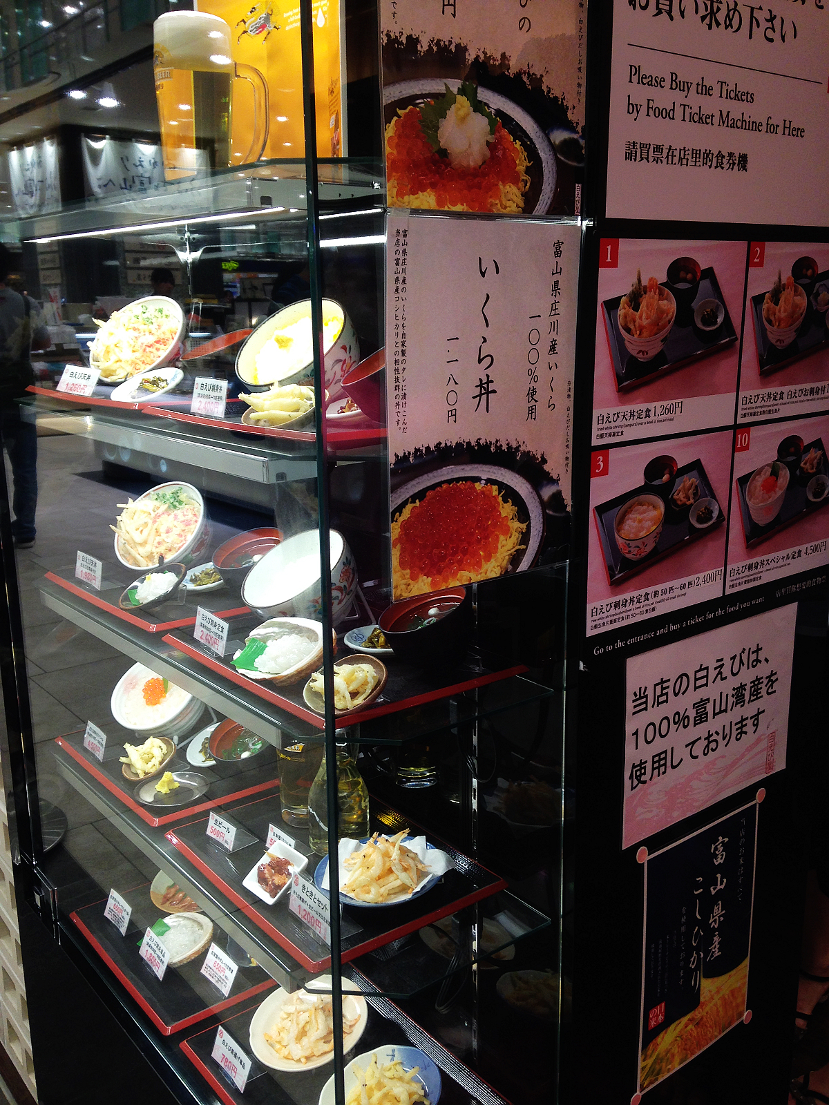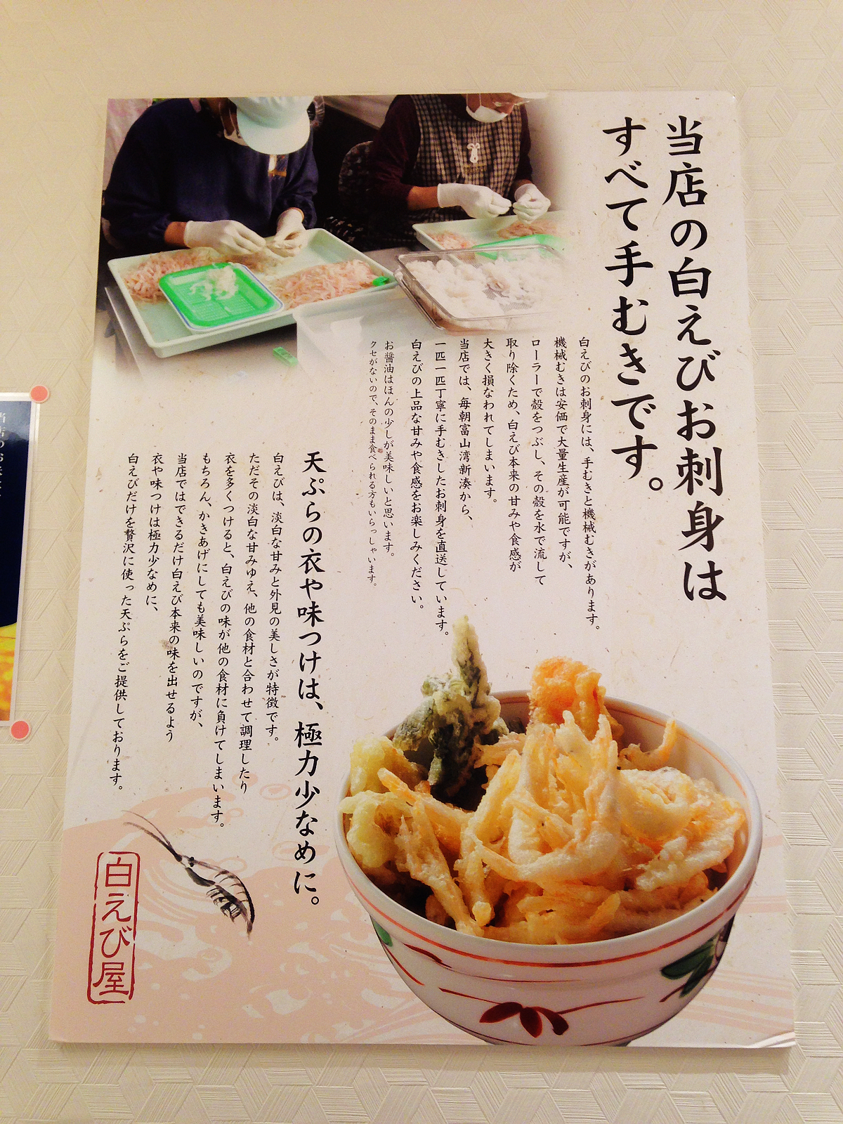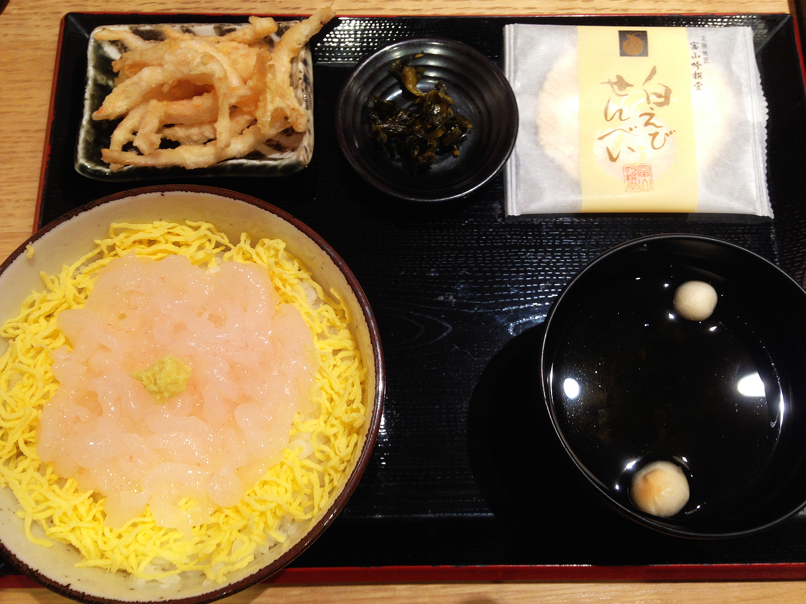 多次經過車站裡的白えび亭總是大排長龍,眼看就要離開富山了,說什麼也要吃一回。特別選晚上8點過後,已經餓到前胸貼後背,排隊20分鐘終於等到了!「白えび亭」是號稱白えび元祖的「白えび屋」所開設,必須先在外面購票機選好餐點,再把票卷交給店員。店面不大,難怪總是大排長龍。牆上海報說明他們的白えび刺身都是以人工一隻一隻剝殼,我們點了「白えびの刺身丼」,相當鮮甜,等待是值得的!