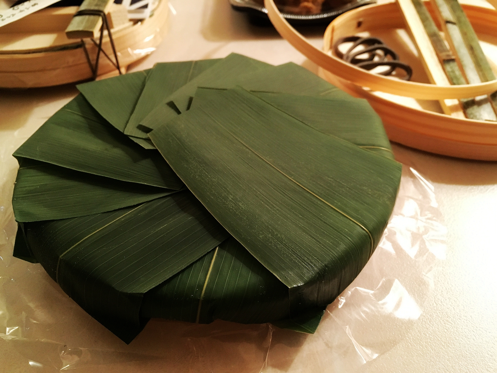 小心翼翼拆下青竹打開盒蓋,出現以笹葉包覆的鱒寿司