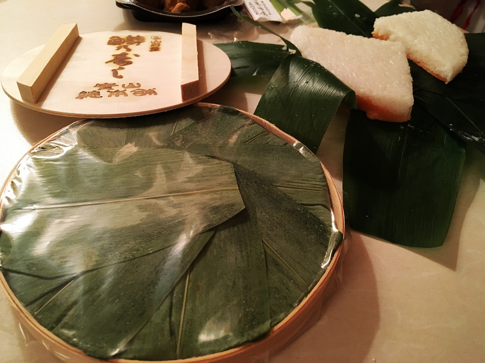 今天的鱒寿司則以駅弁(鐵路便當)名聞天下,趁著來到富山難得機會,我們買了兩家頗負盛名的鱒寿司便當品嚐。木製圓形外盒的鱒寿司便當,上下以橡皮筋勒緊四根青竹,使裡面鱒魚肉片與醋飯更加緊實(古法是用石頭),造型非常特別。小心翼翼拆下青竹打開盒蓋,出現以笹葉包覆的鱒寿司。掀開笹葉,就是鋪上滿滿鱒魚片的醋飯囉,以附的塑膠刀像切蛋糕一片片切開享用。鱒魚肉經過鹽巴醃製與加壓後,呈現淡淡粉橘色,和握壽司不同的是,多了魚肉纖維感帶來的嚼勁,及笹葉包覆擠壓的淡淡竹葉香氣。便當看起來不大,份量比我們想像多很多,兩人分食一個已經飽到不行,第二個吃一半再也吃不下,只好留到第二天吃。其實據在地人說,氣溫20度左右自然放置一天,可使醋飯與鱒魚相互吸收彼此滋味,會更加美味。至於這兩家味道差異,我們只覺得酸度略有不同,不過建議買一個嚐鮮就好,吃太多的確會膩哩!