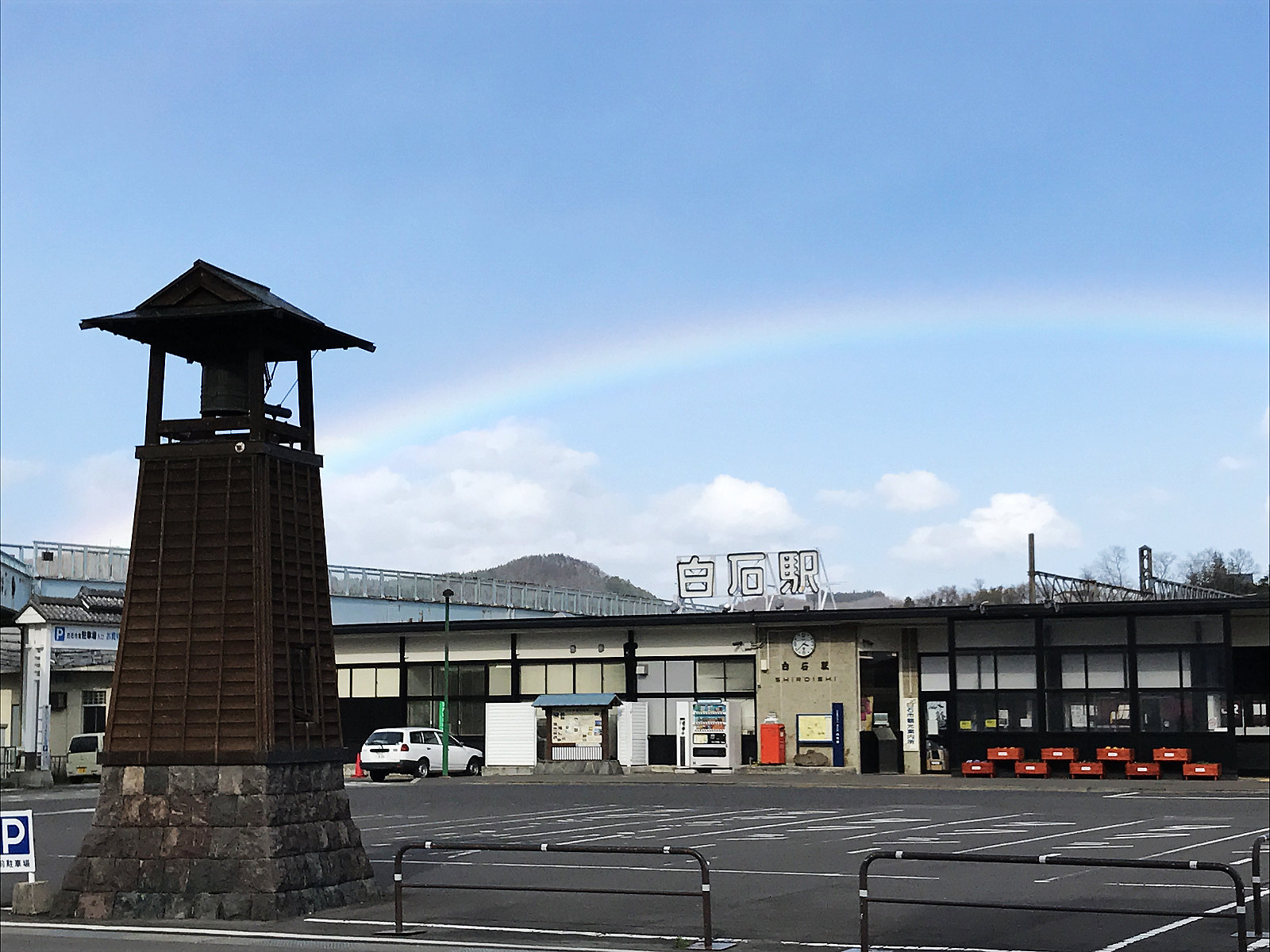 逛完白石城,依舊冒雨回到白石站,此時天邊出現彩虹,以為一切將風平浪靜。一進車站才知道事態不妙,因為春嵐攪局,東北本線「運轉見合,再開未定」,也就是暫時停駛不知何時再開。正不知如何是好,外頭突然瞬間變天,突然其來的狂風豪雨比颱風威力還猛,正值放學時刻,蜂湧而至的學生把小小白石站塞爆了!一堆人圍著問站務人員何時復駛,他也無奈搖頭說不知道。等了半個多小時,我突然想起附近有新幹線白石藏王站,上網查詢得知新幹線並未停駛,趕快衝出車站搶到唯一一輛計程車,急奔白石藏王站,比起愁困在白石站浪費寶貴時間,六百多元車資實在算不了什麼啊。
