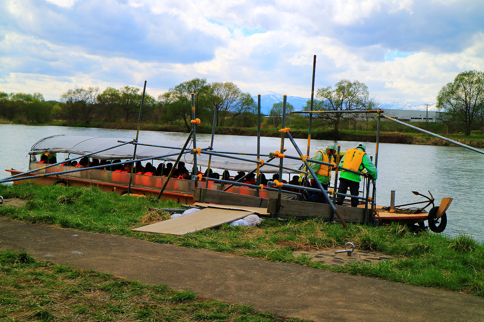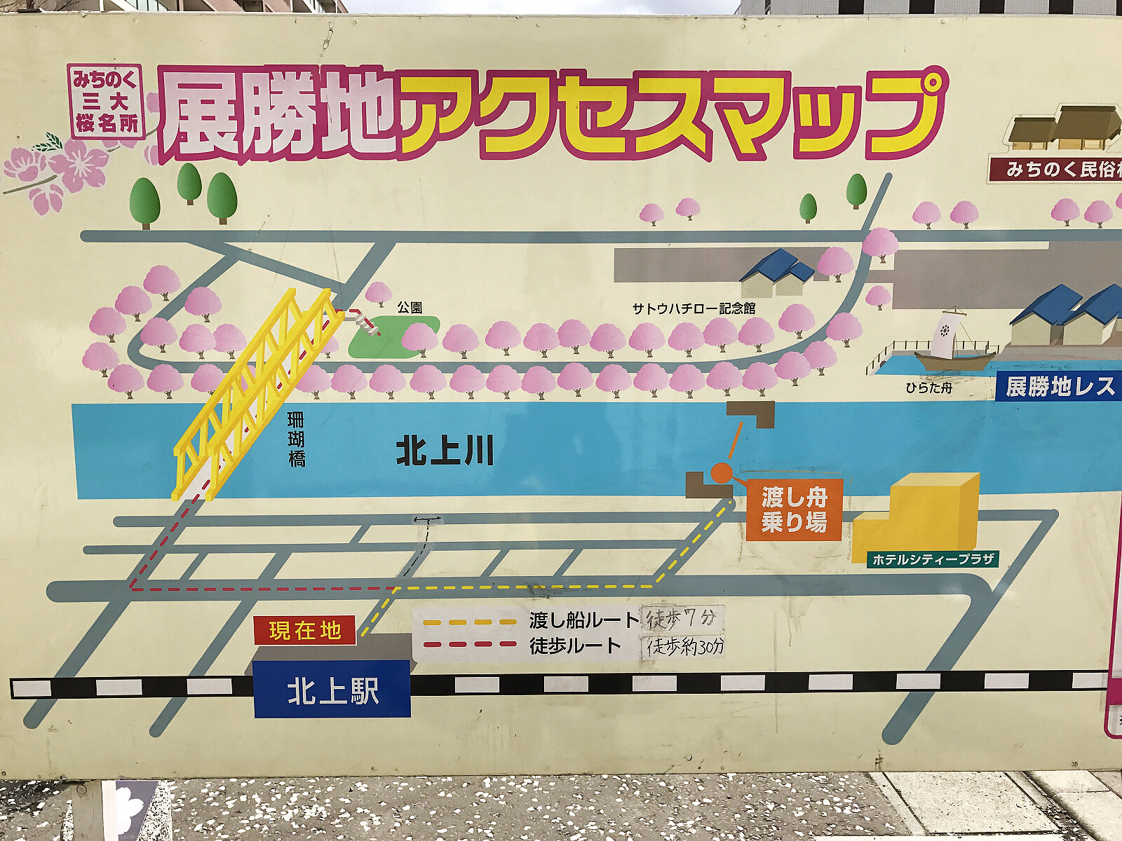 北上展勝地遊覽船搭乘處,遊北上川活動為櫻花期間限定,大人1,000日元,小學生500日元