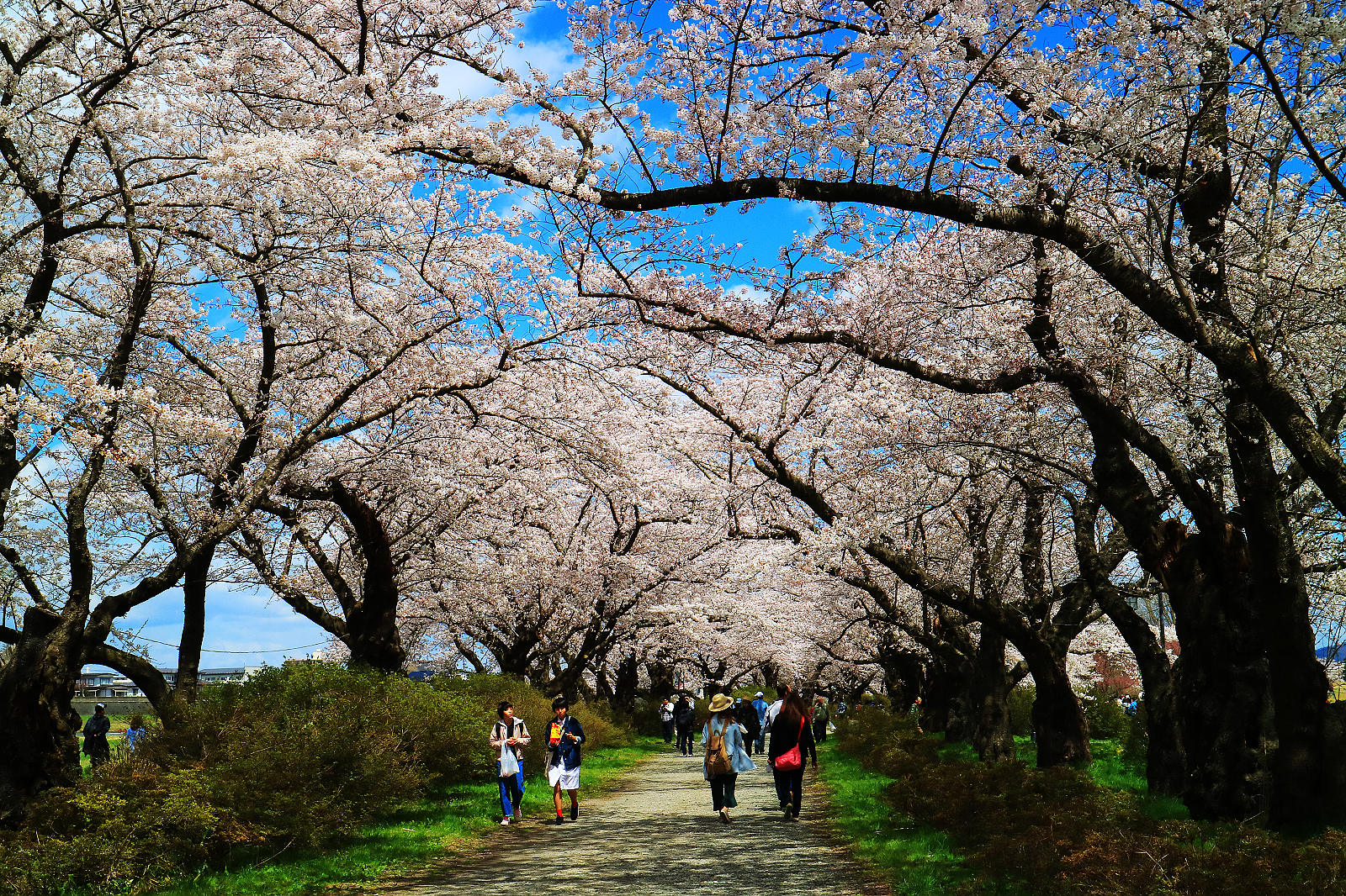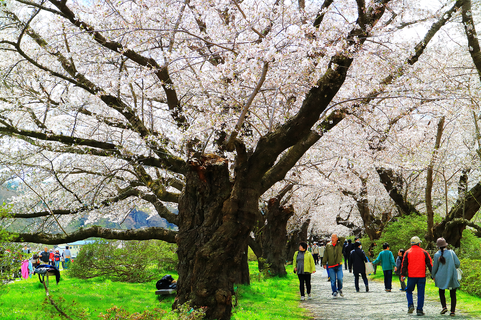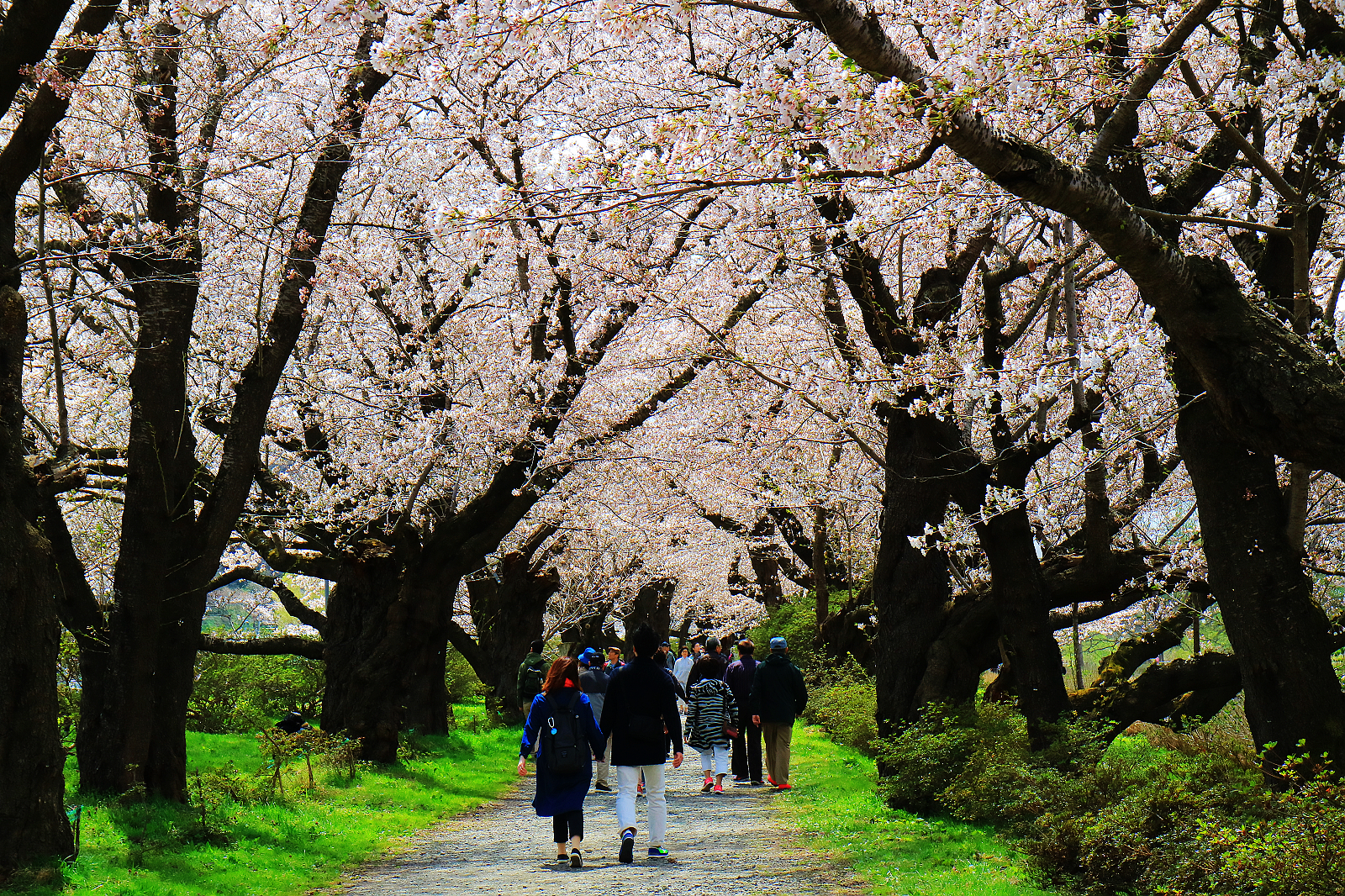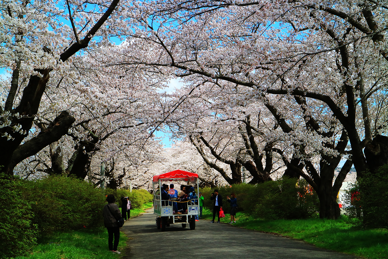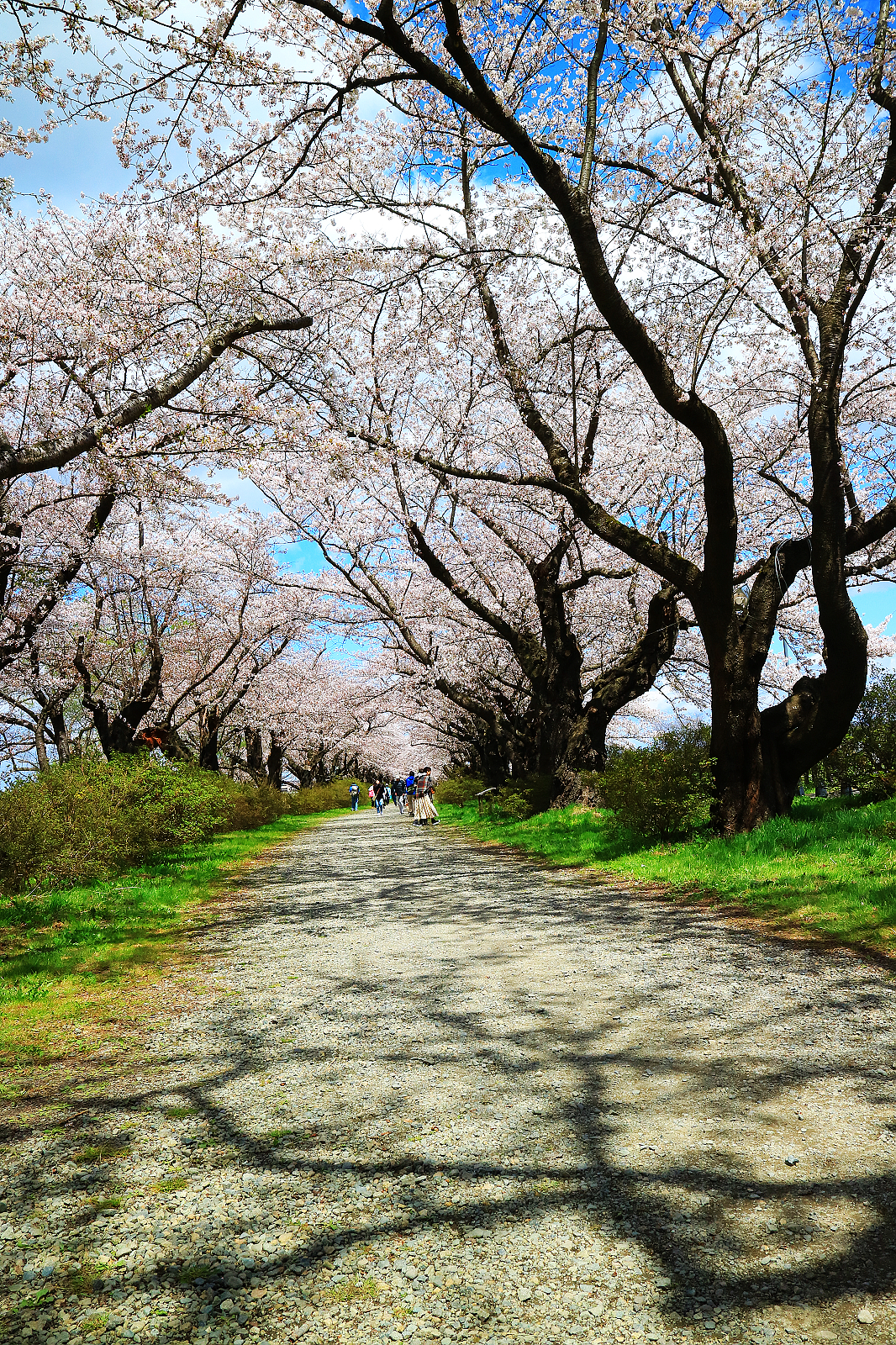 岩手縣北上展勝地與青森弘前城跡公園、秋田角館並列陸奧三大櫻花名所,也都是「日本櫻花名所100選」,這趟東北追櫻本來希望至少看到兩所,無奈今年花期延遲,弘前和角館尚含苞待放,於是直奔開了五成的北上展勝地。這裡的櫻花從1920年(大正9年)開始種植,現在293公頃展勝地公園裡,約有150多不同品種櫻花樹,總計1萬棵。最吸睛的當然是從珊瑚橋開始沿北上川畔綿延長達2公里的染井吉野櫻隧道,層層疊疊的花瓣將藍天渲染成粉紅霞彩,漫步其間,旖旎爛漫令人心醉神馳,想必滿開時更加驚人!
