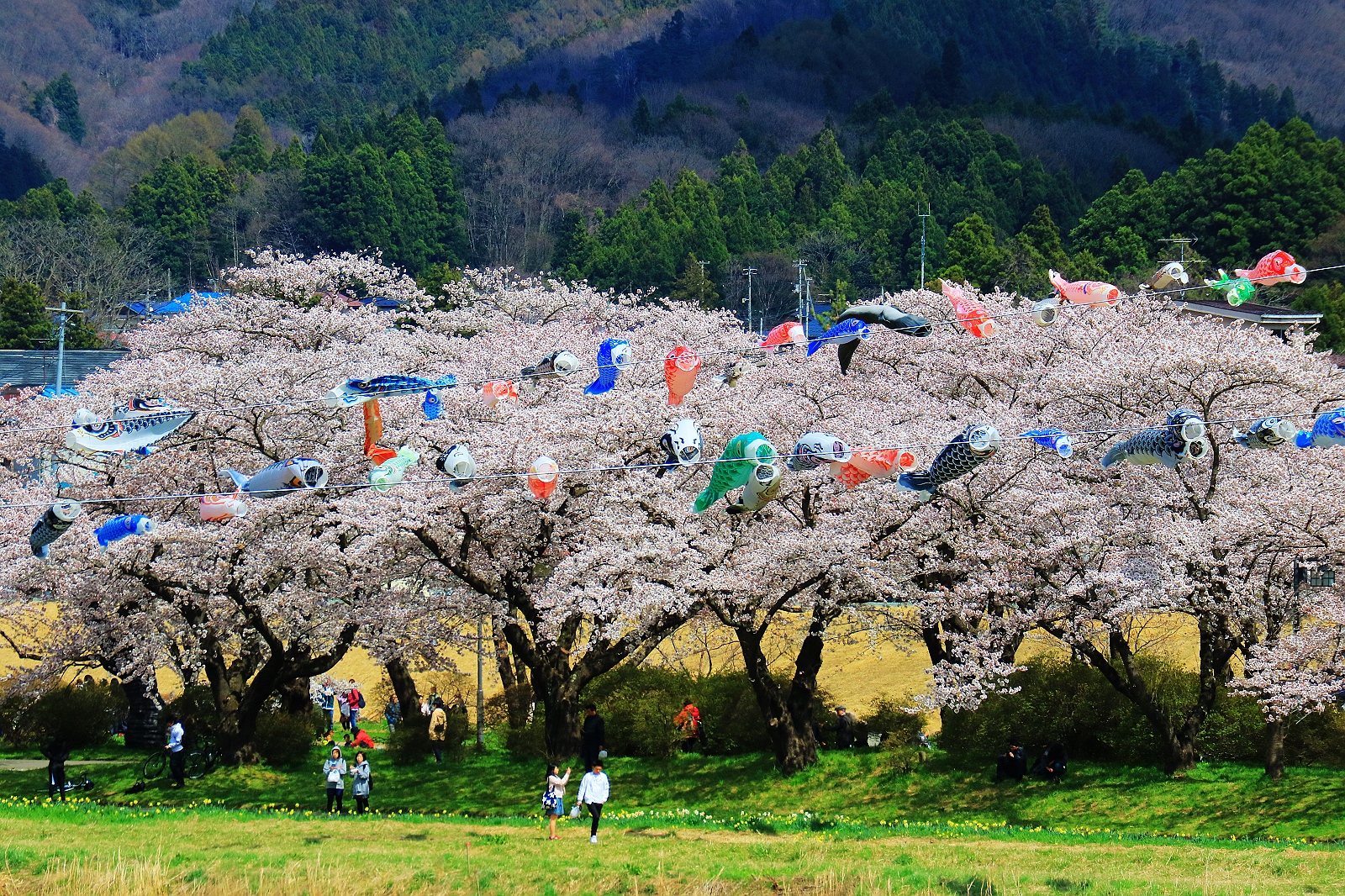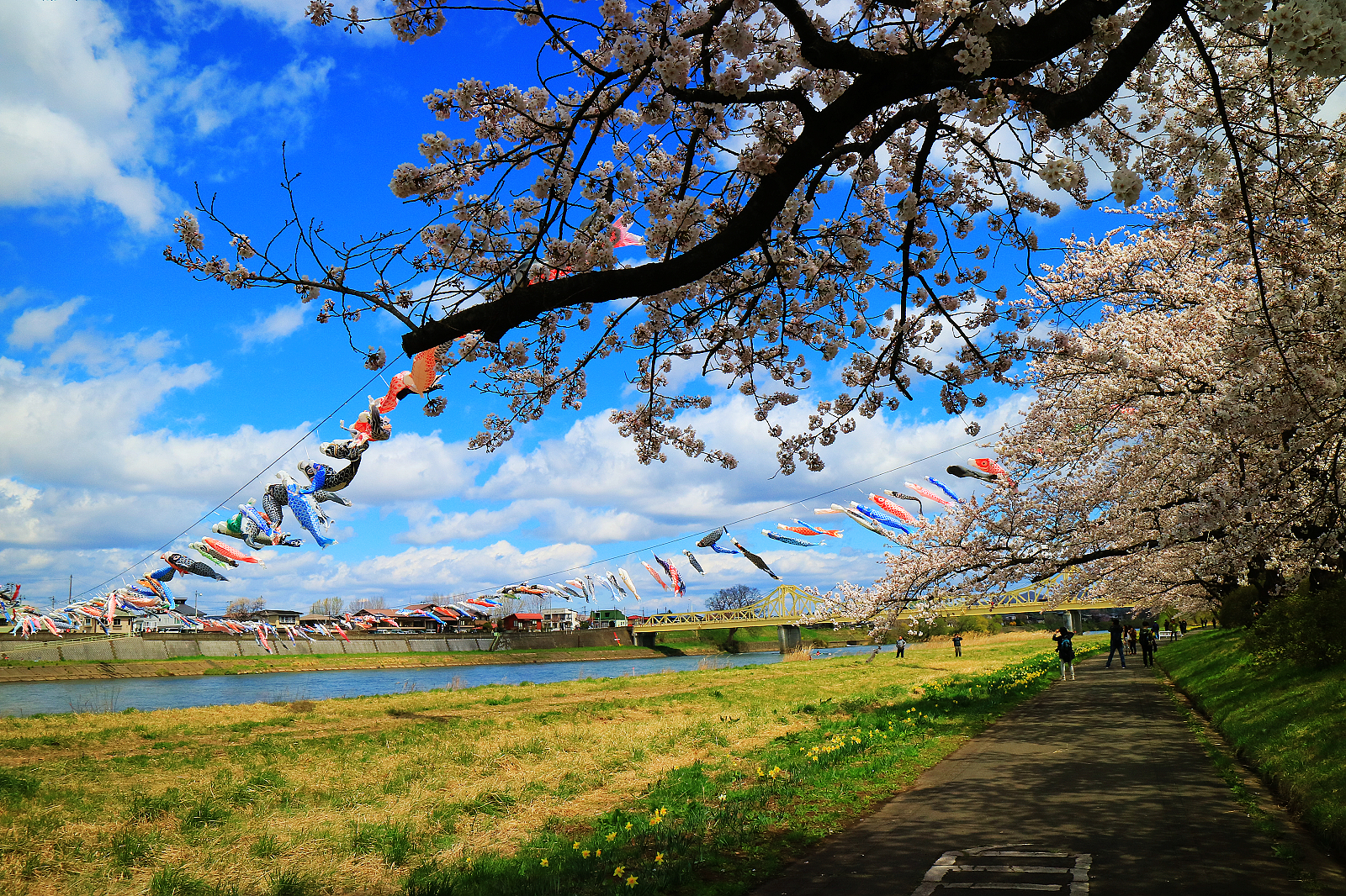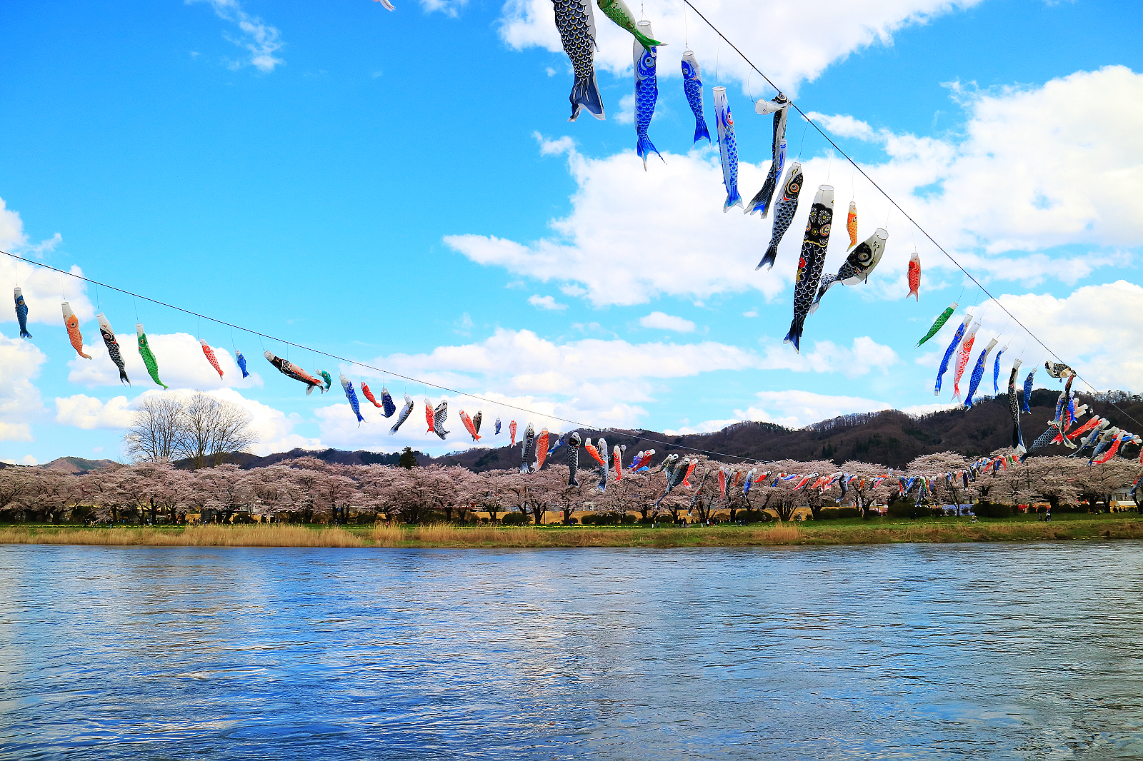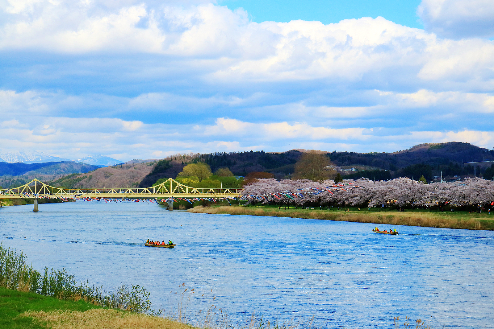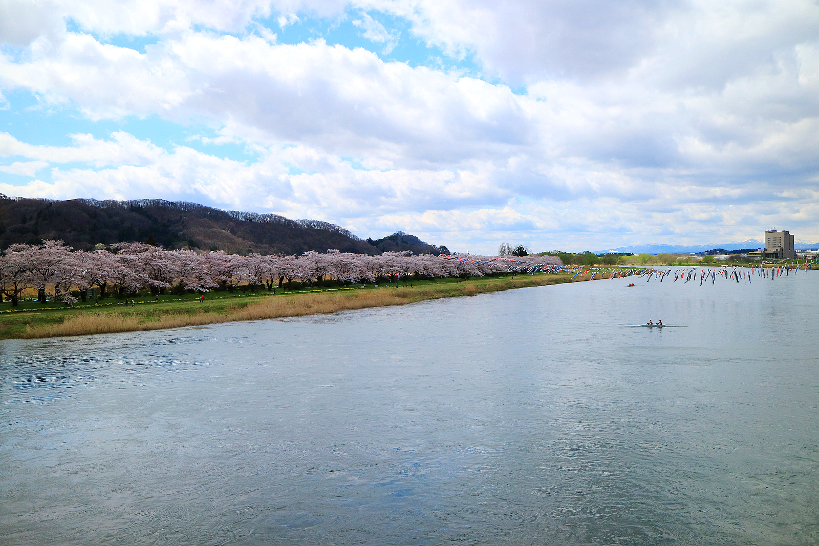 翩飛在藍天的鯉魚旗與櫻花共舞是北上川展勝地最特別的景象
