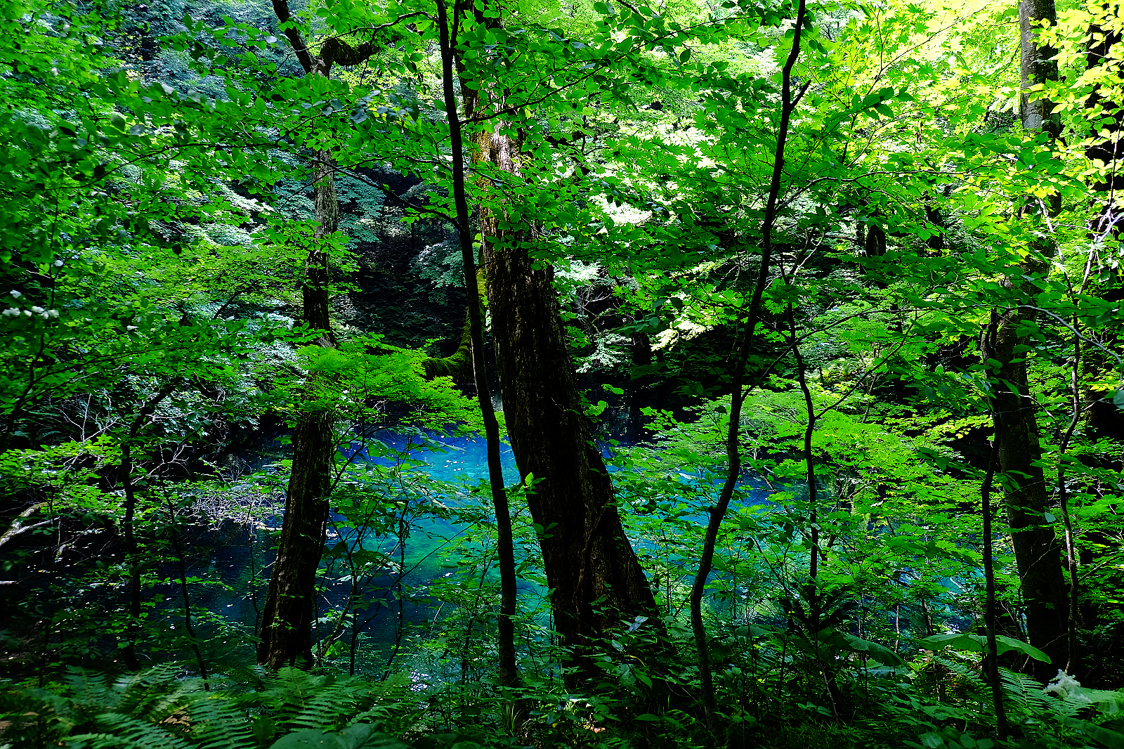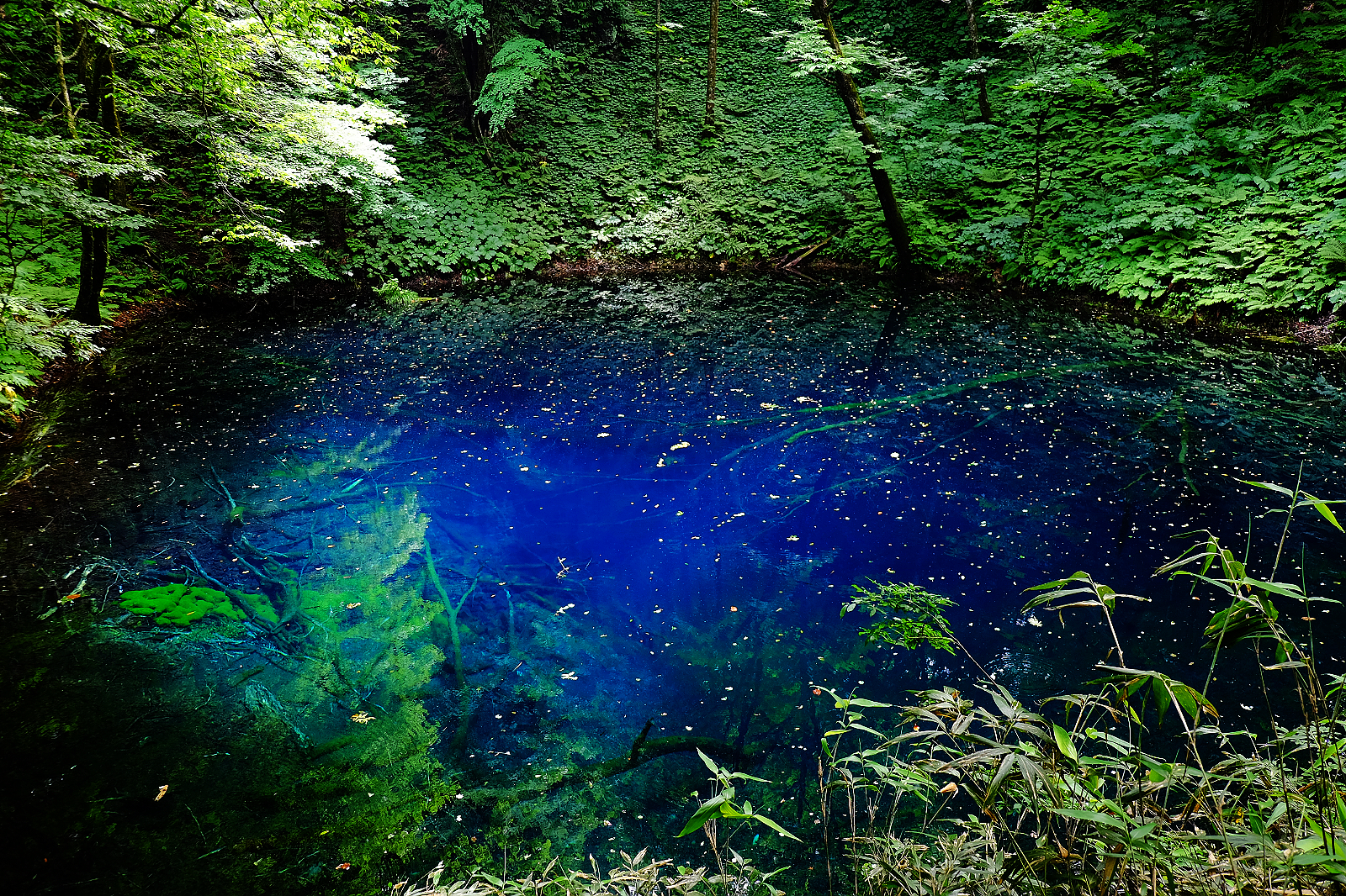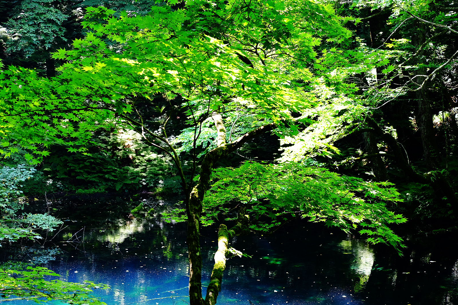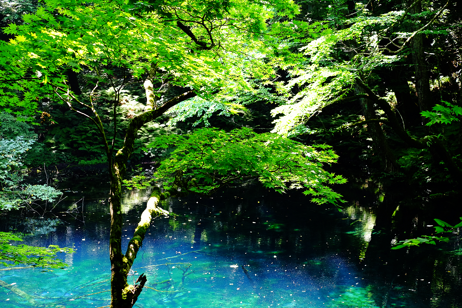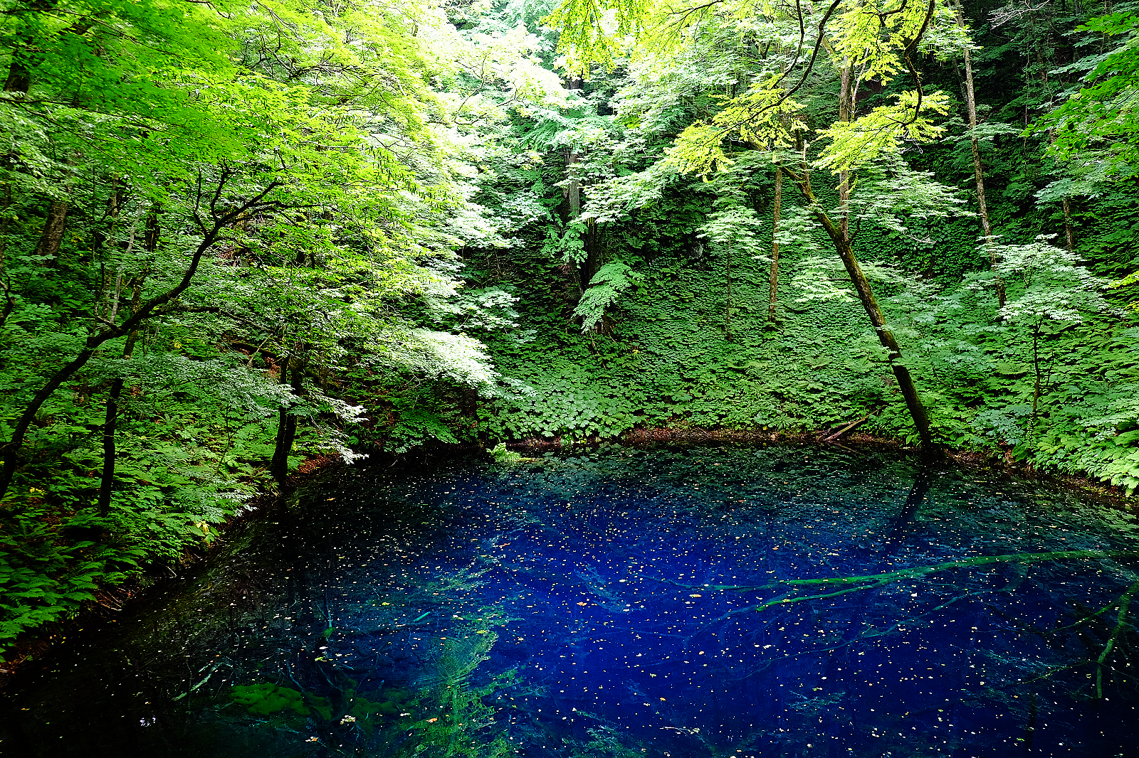其中「青池」是十二湖人氣第一,猶如墨藍寶藍碧藍等各款藍色顏料調和成的絕美青藍色湖水,透明度深達9公尺,沈睡湖底的櫸木枯枝清晰可見。陽光遊走湖面,湖水隨著變換色彩濃淡熠熠生輝,青池雖然面積不大,散發的亙古不朽之美依舊令人屏息讚嘆。