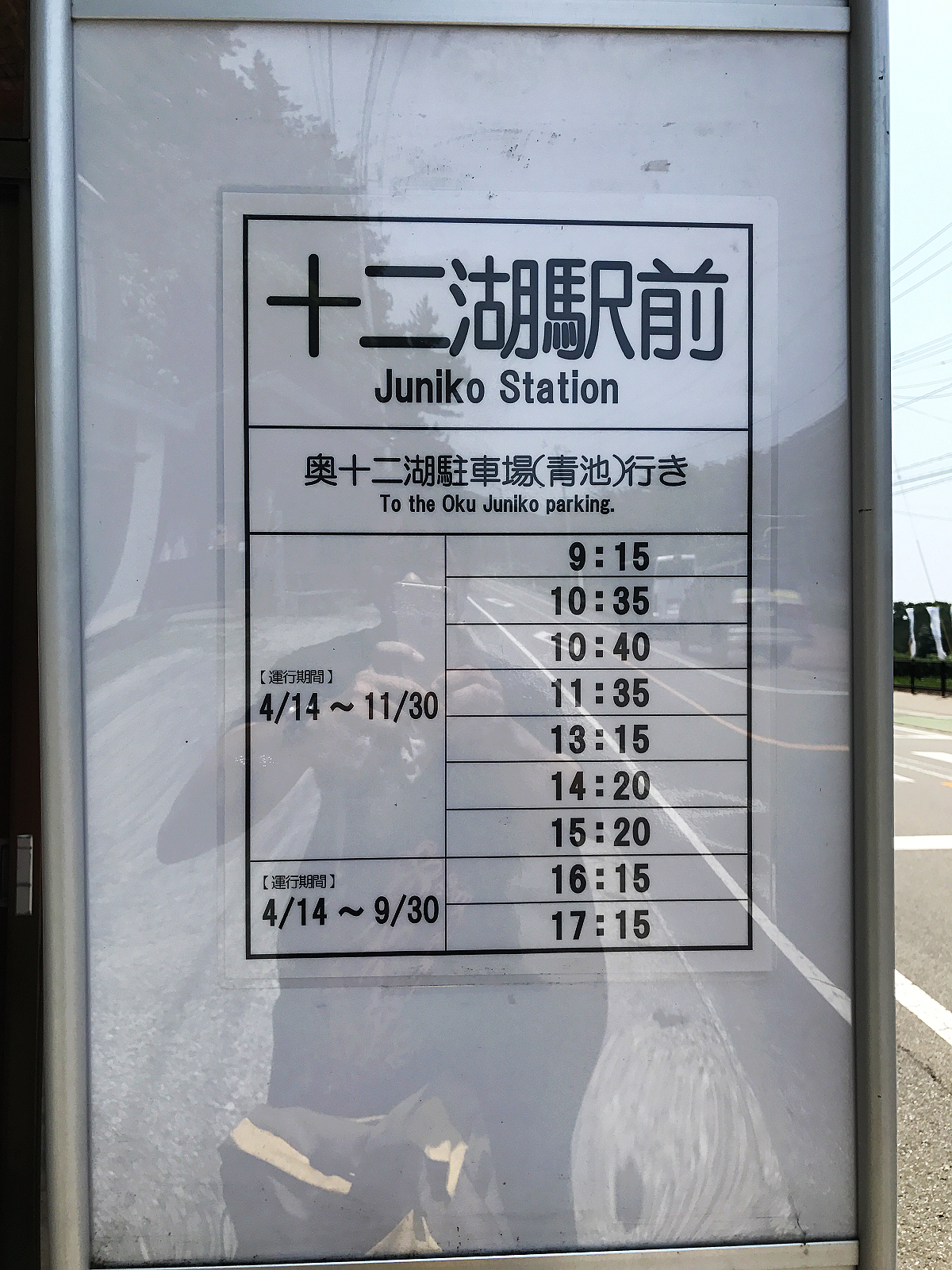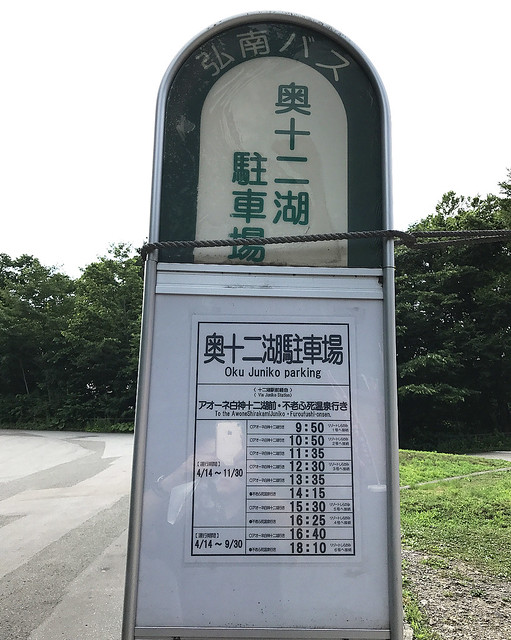奧十二湖的巴士站牌,健行回來後補拍一張沒人的