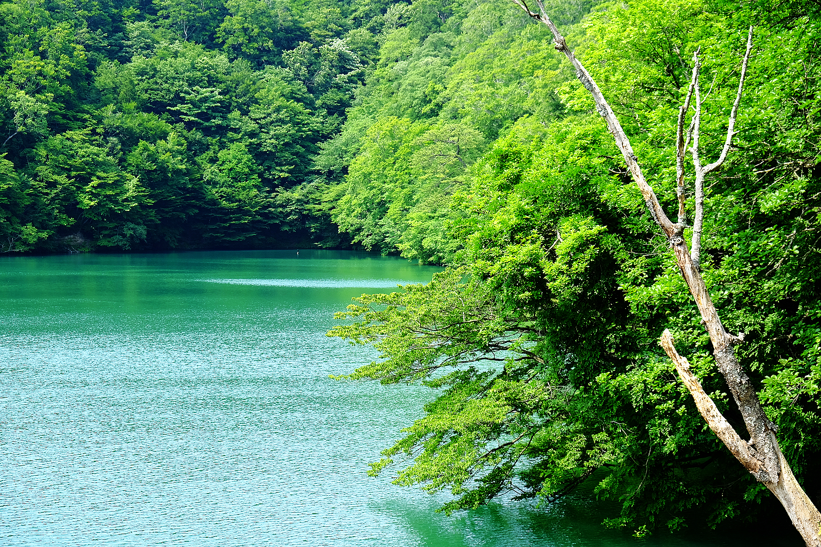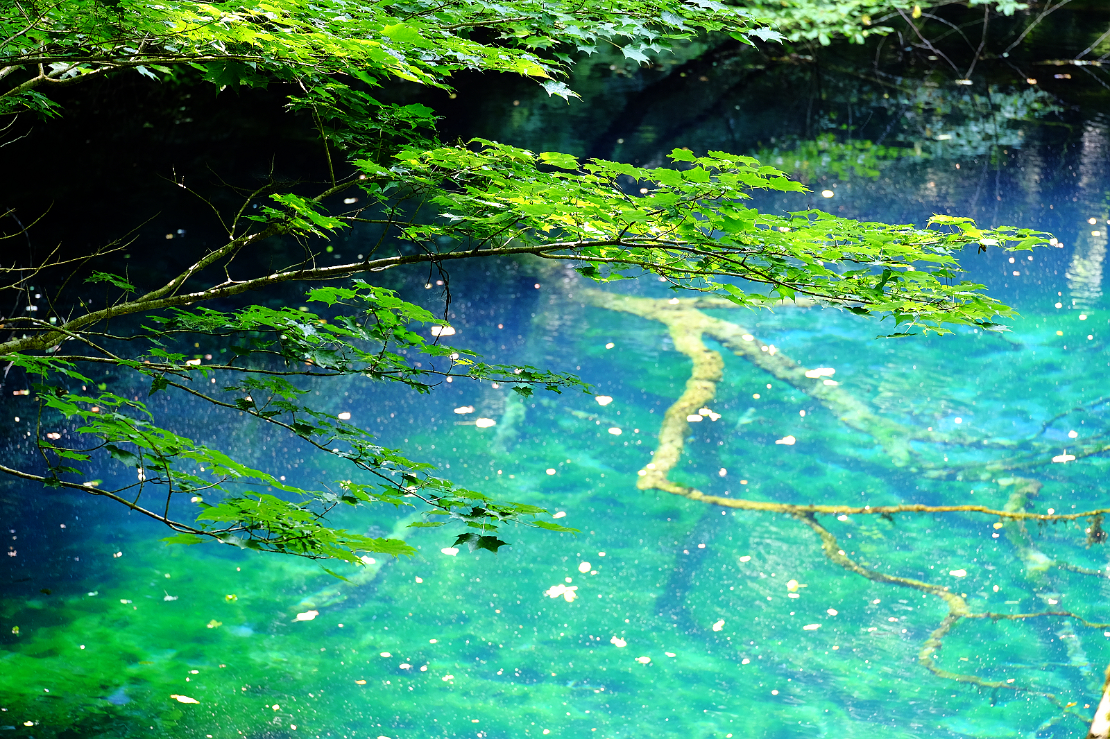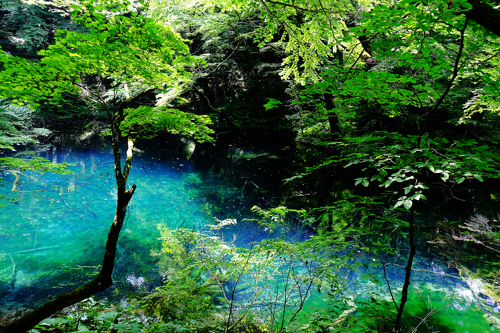 猶如墨藍寶藍碧藍等各款藍色顏料調和成的絕美青藍色湖水,透明度深達9公尺,沈睡湖底的櫸木枯枝清晰可見