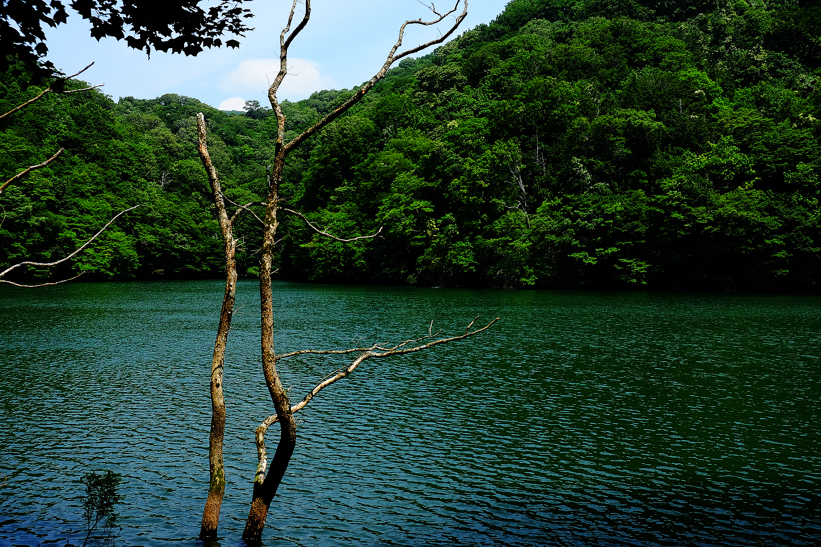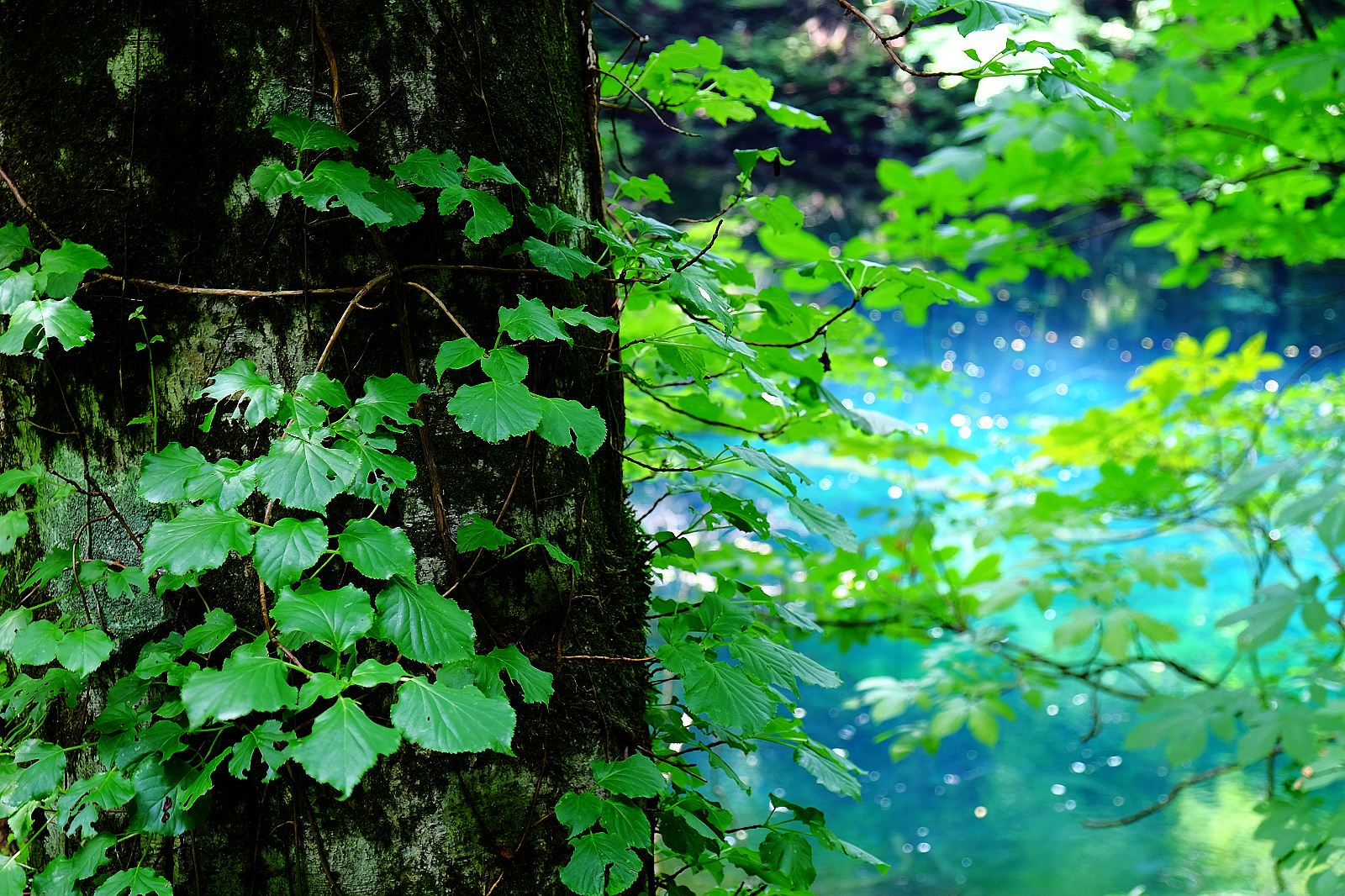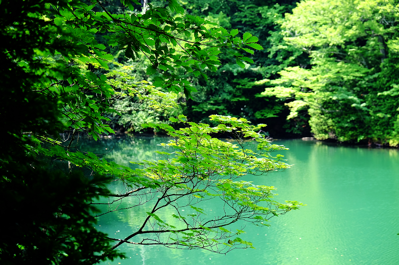 猶如墨藍寶藍碧藍等各款藍色顏料調和成的絕美青藍色湖水,透明度深達9公尺,沈睡湖底的櫸木枯枝清晰可見