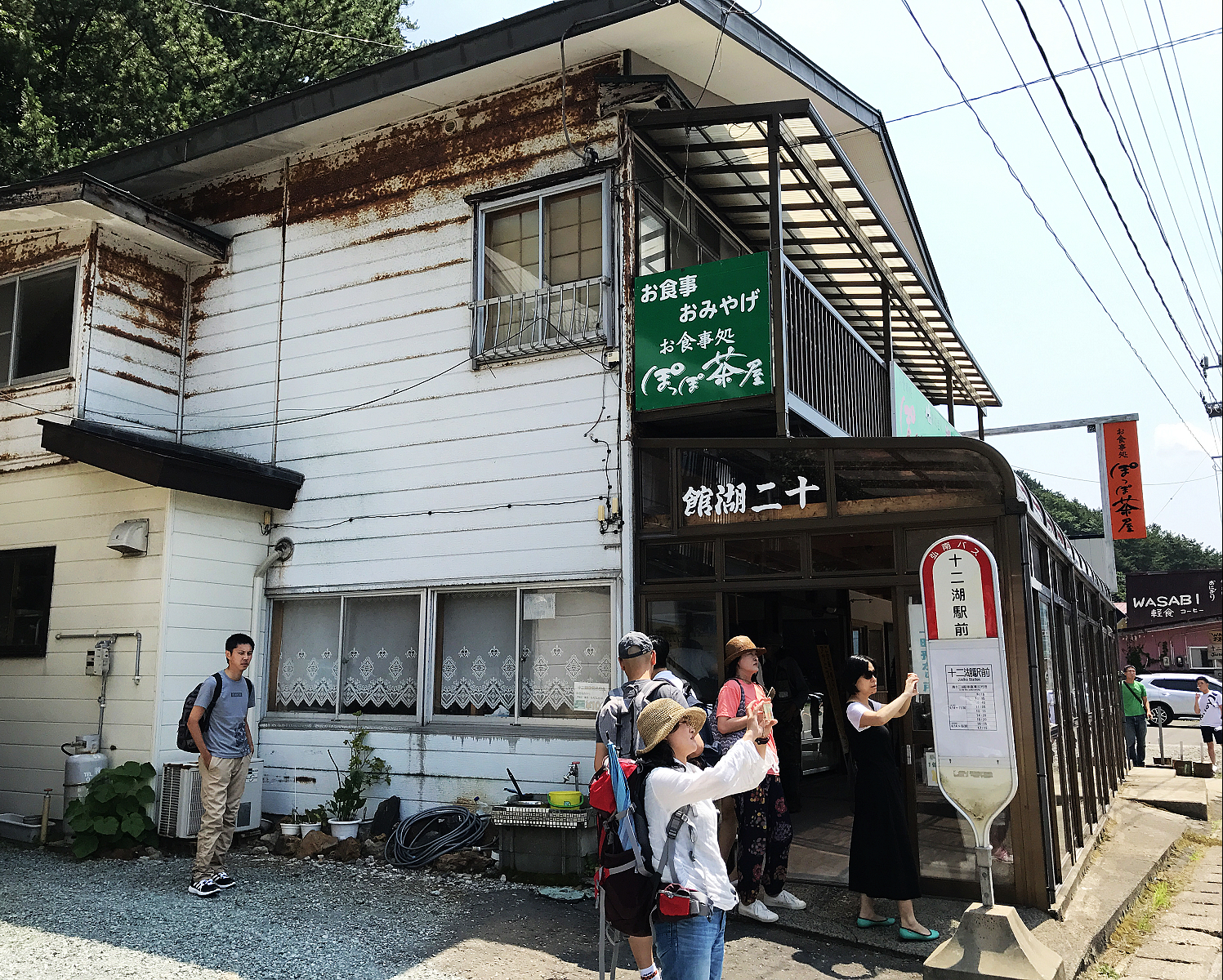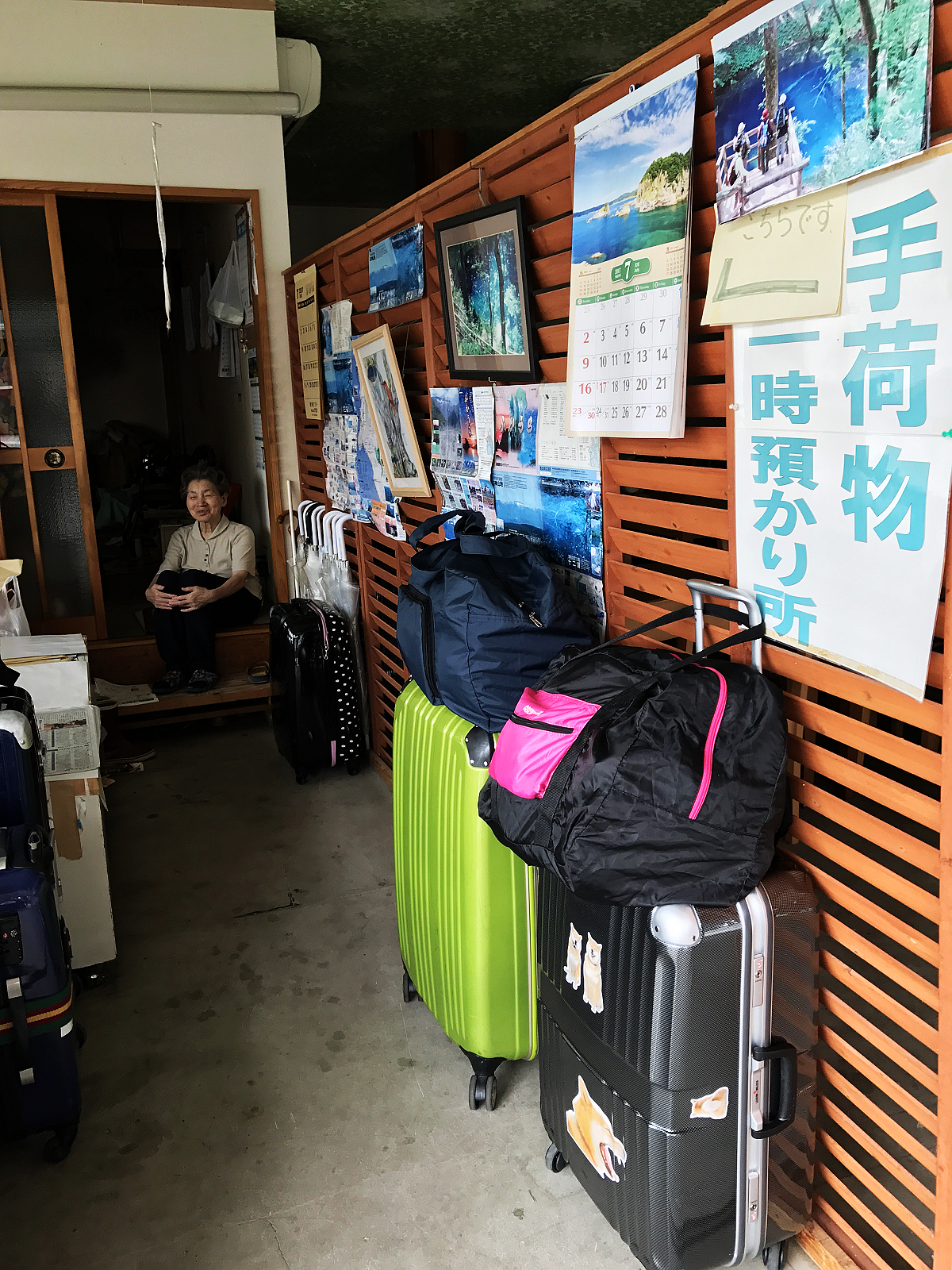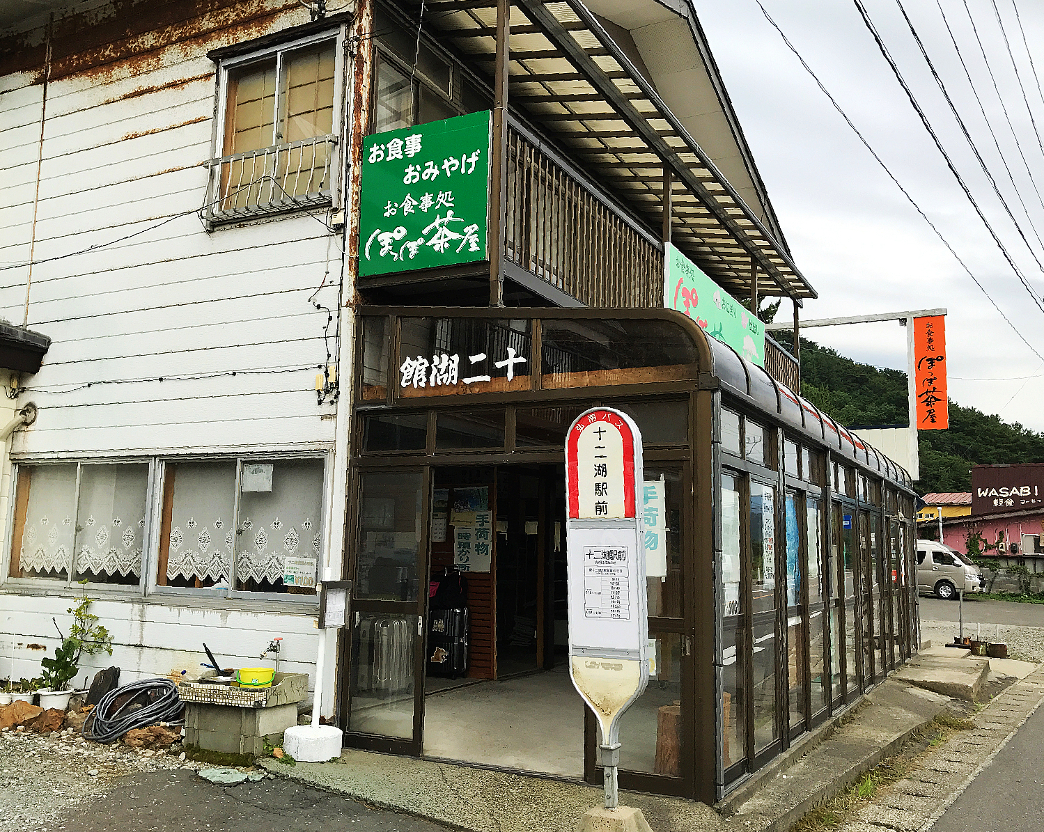 十二湖站的行李寄物櫃很少,遊客多到車站對面小雜貨店寄放行李,店門前就是要去奧十二湖的巴士站牌