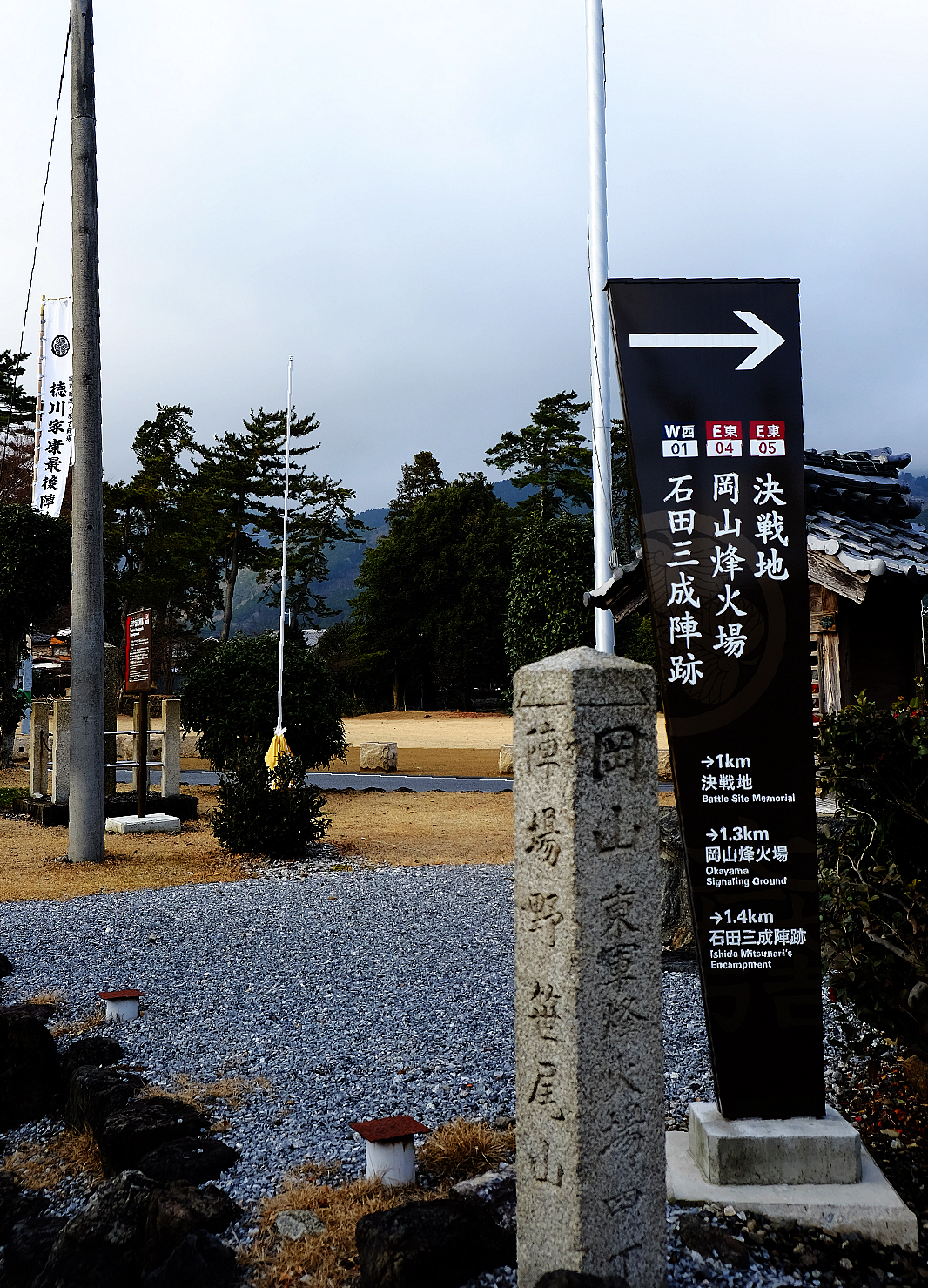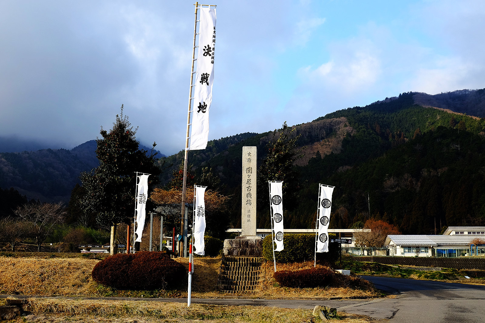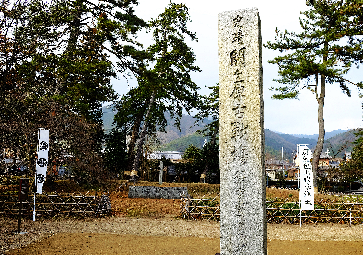 笹尾山山腳下的遼闊田野間佇立著「関ケ原古戦場決戦地」石碑與德川家、石田家旗幟,