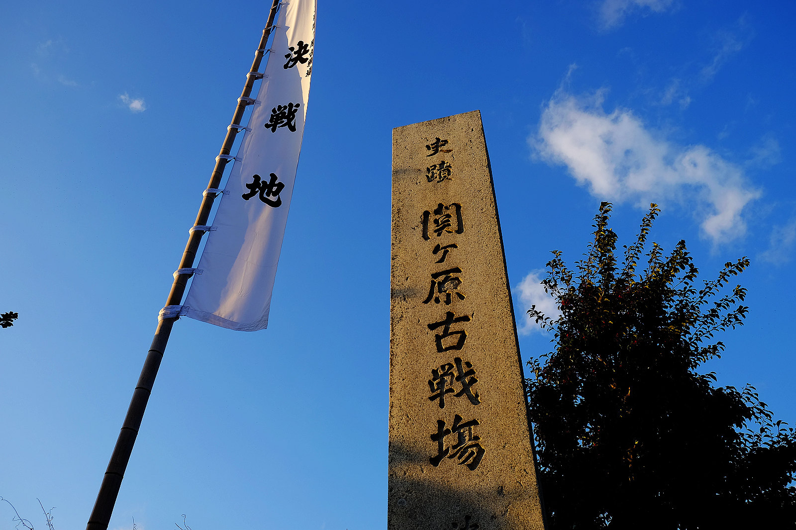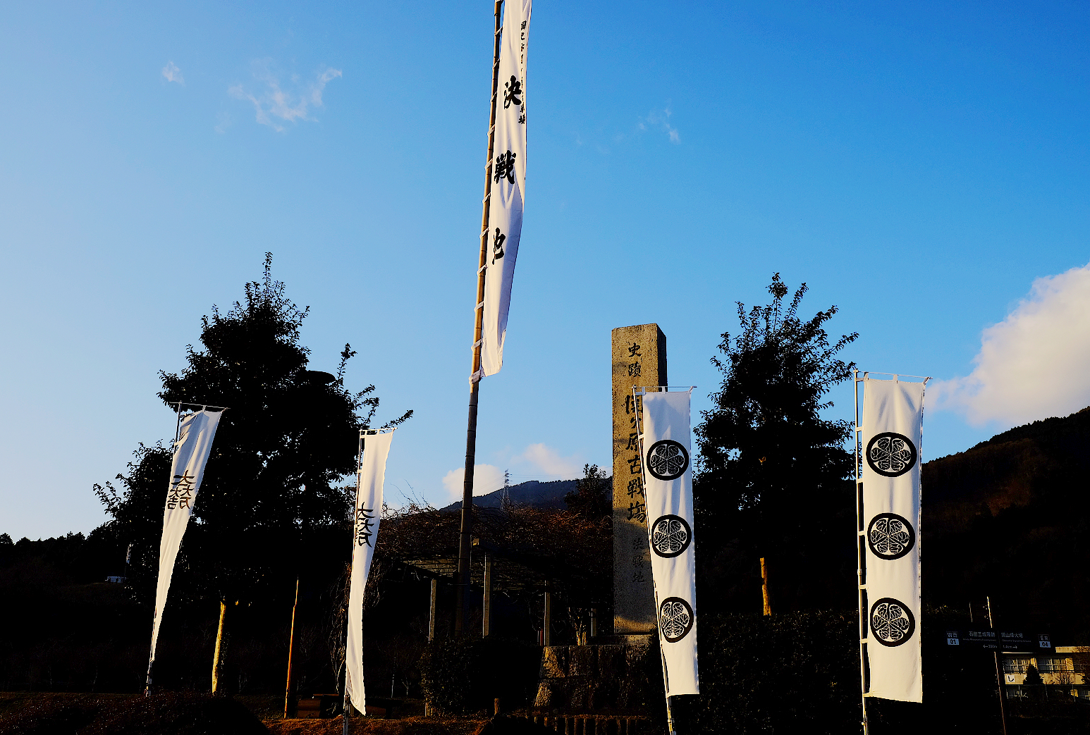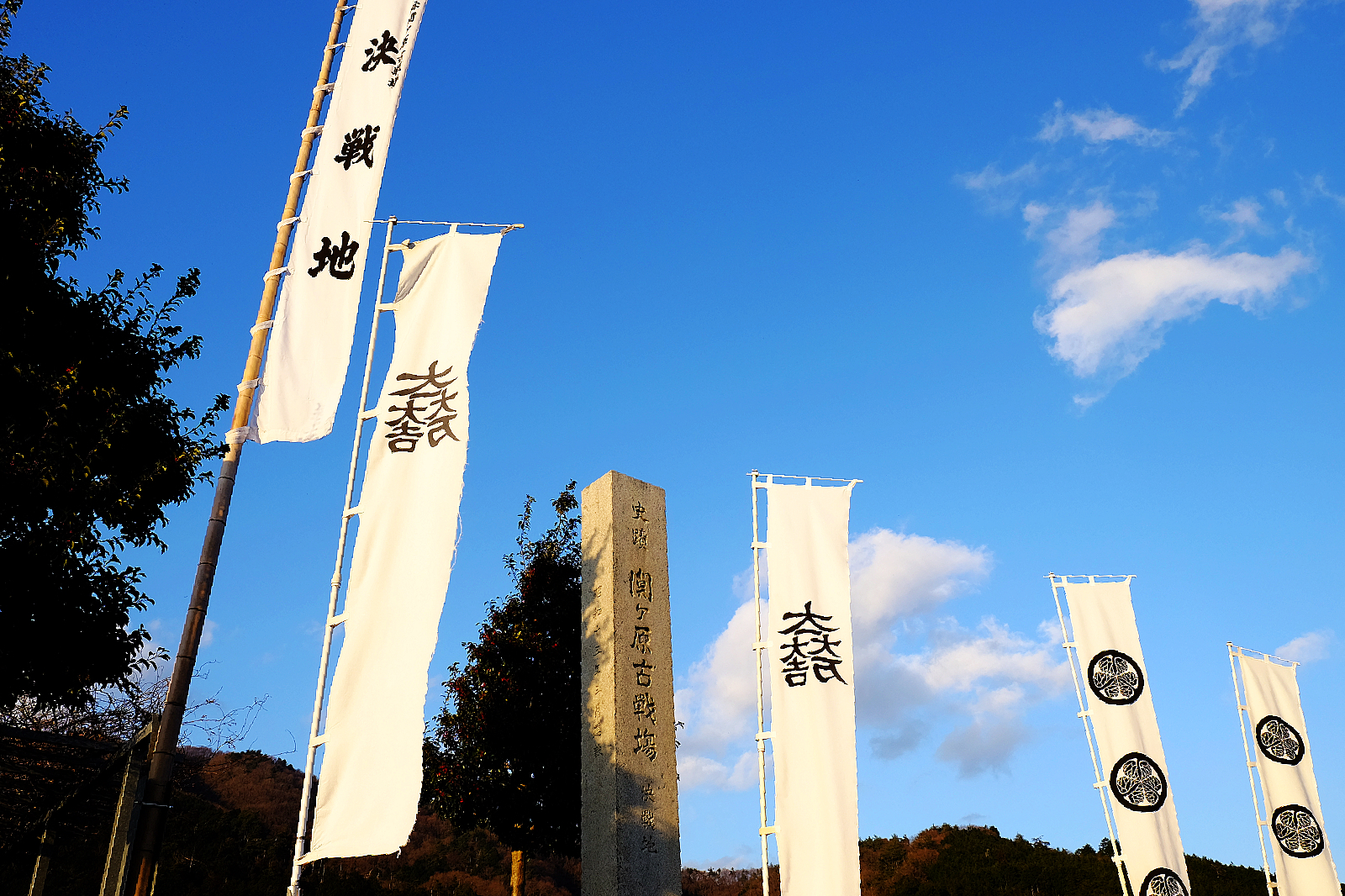笹尾山山腳下的遼闊田野間佇立著「関ケ原古戦場決戦地」石碑與德川家、石田家旗幟,