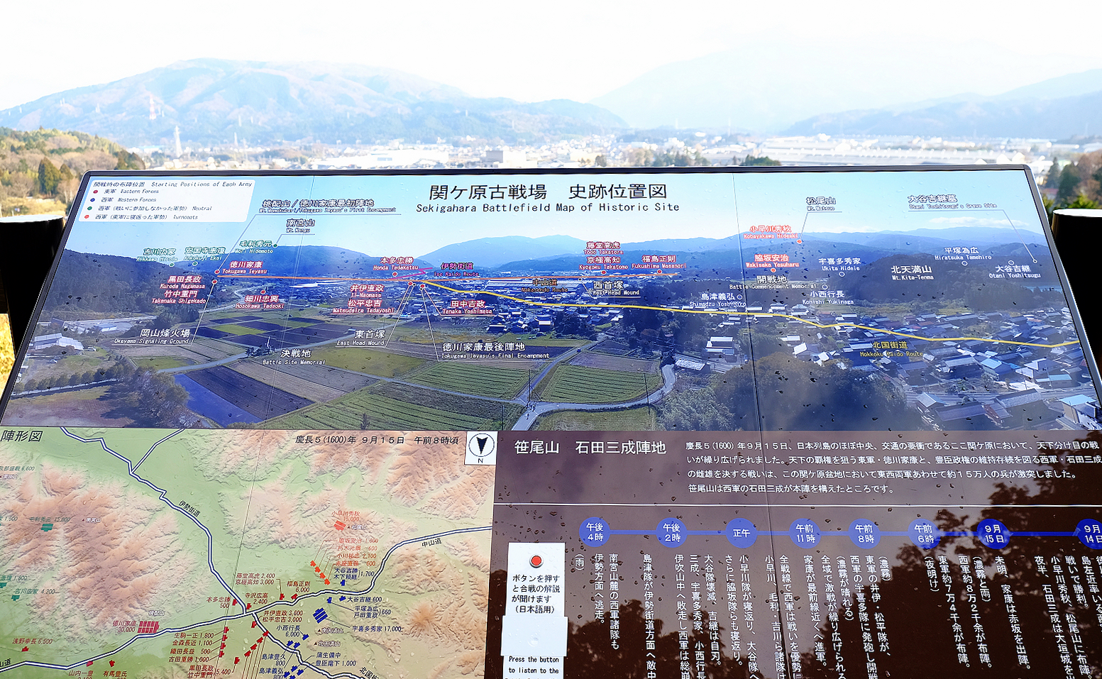 俯瞰古戰場,從位置圖可以清楚瞭解関ケ原位居京畿、北國街道、中山道、伊勢街道交通要衝,的確是軍事上重要據點