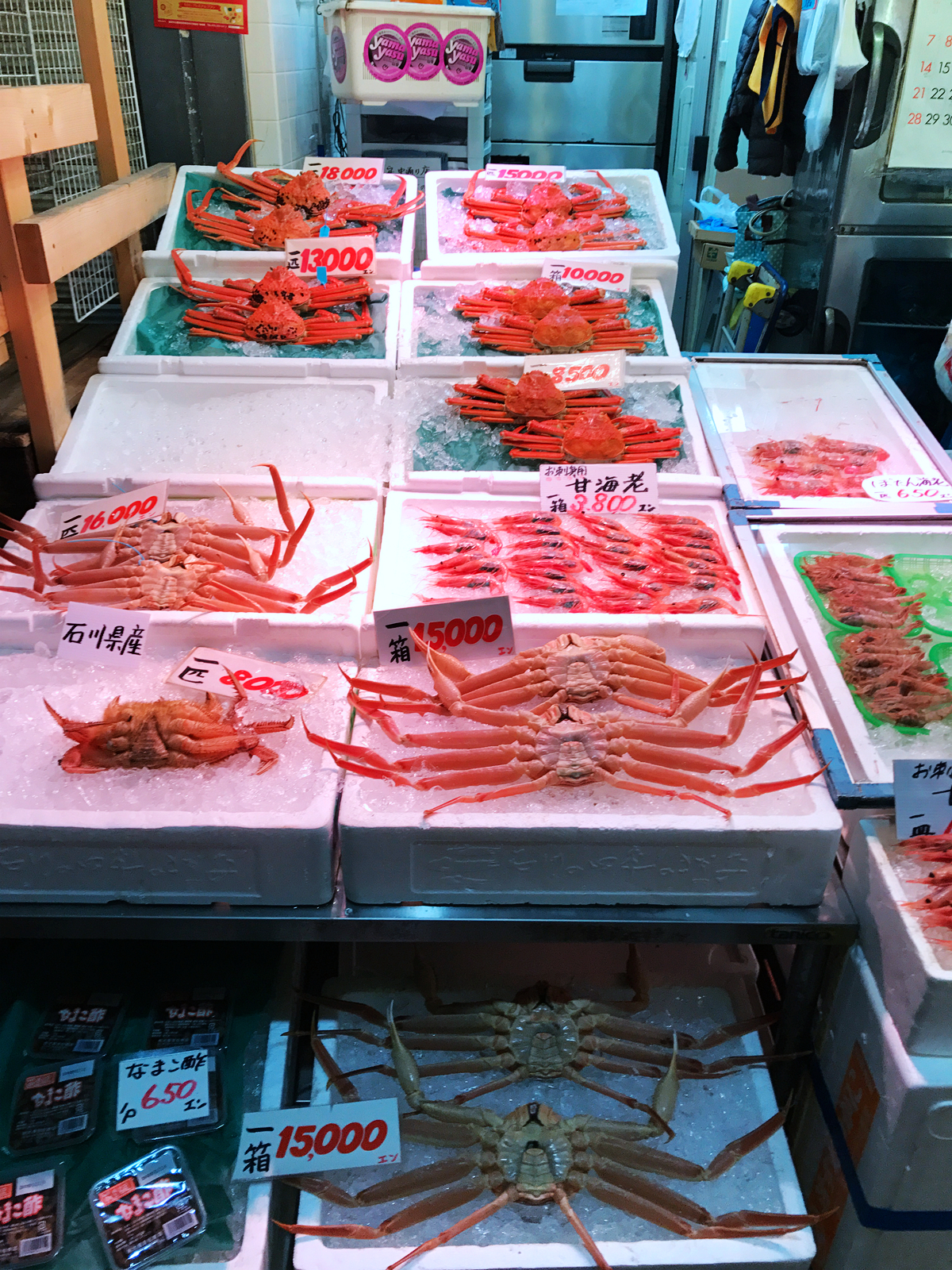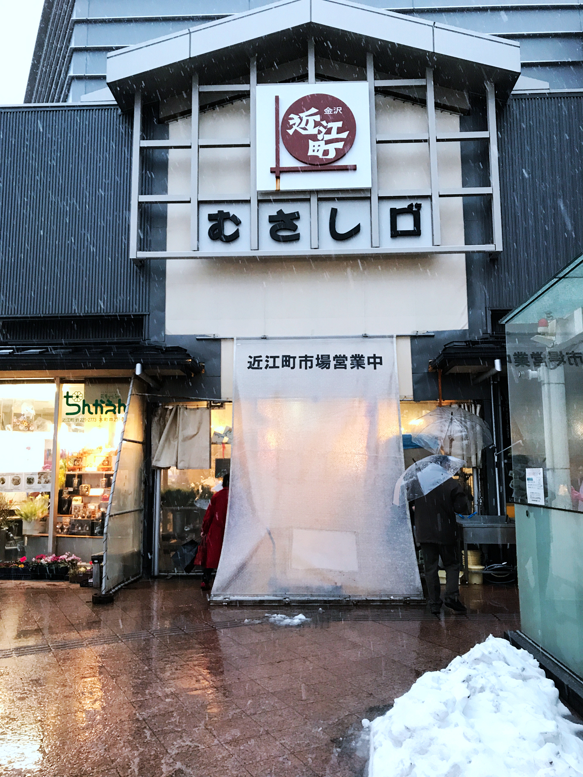[近江町市場 廻る近江町市場寿し本店]:1721年成立的近江町市場深具歷史意義,號稱金澤市民廚房,180多家店鋪販售海鮮蔬果與金澤傳統野菜,還有店家自製產品例如魚板醬菜等,一年四季提供當季各色山珍海味食材,市場內還有四十多家以海鮮為主的當地特色小吃與餐飲店,是遊金澤不可錯過的景點。出國旅遊我很喜歡逛市場,可以深入瞭解當地庶民飲食文化,幾年前第一次來是盛夏中午,熱鬧滾滾;這次則是大雪紛飛傍晚前來覓食,商店已經陸續打烊,冷清不少,沒關係,我們的目標是廻る近江町市場寿し本店。
