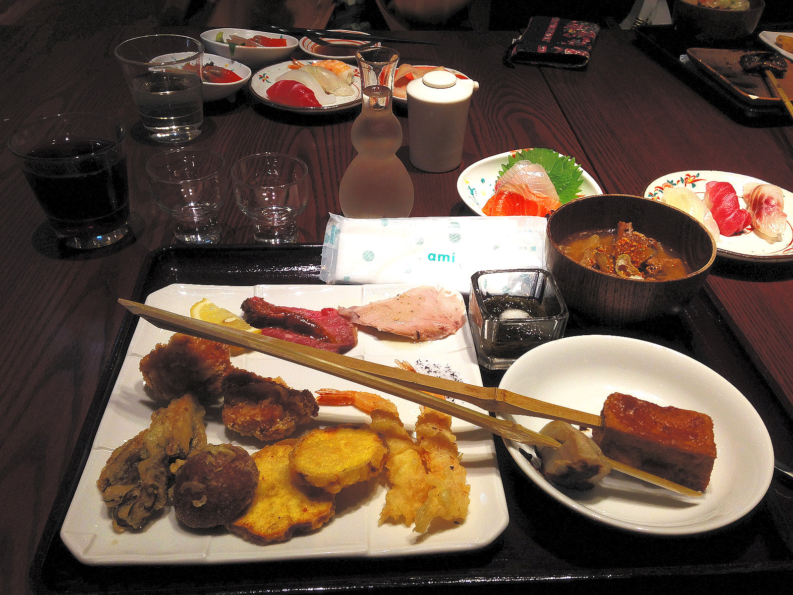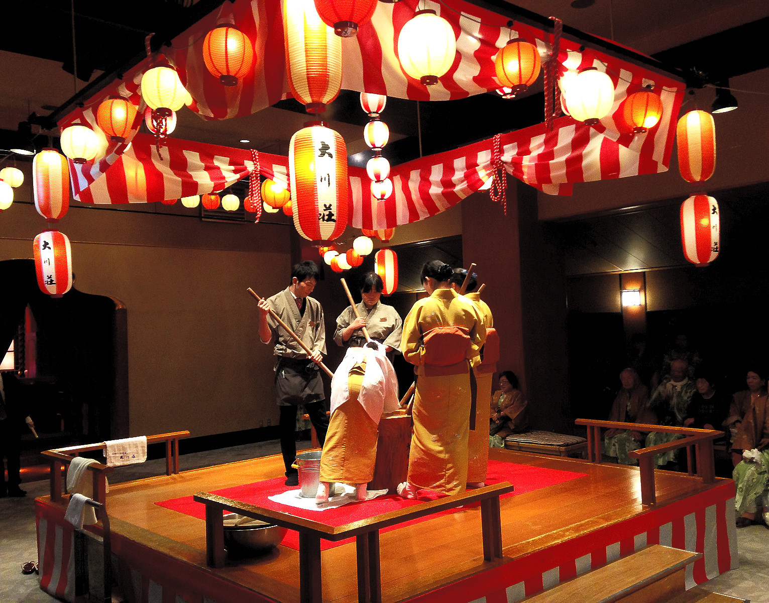 這裡每間客房皆面向溪流,擁有絕佳景觀。稍事休息後先去旅館最引以為傲的空中露天溫泉『四季舞台棚田』,這片仿梯田設計營造層次感的三階段溫泉池,全部以檜木打造,也面向溪谷,可一邊享受泡湯之樂,一邊飽覽隨四季遞嬗的美景,耳聽溪流吟哦聲,坐擁清新的大自然,五感得到充分療癒。泡完湯飢腸轆轆,澎湃的自助式晚餐令人眼睛大亮,多道以會津當令食材製作的鄉土料理,輔以甘醇銘酒,人生至樂啊!晚餐後旅館可沒閒著,怕大夥兒在這山裡溫泉鄉無聊,貼心準備搗年糕活動讓大家打發時間,還邀在場歐吉桑上台同樂,將氣氛炒到最高點。