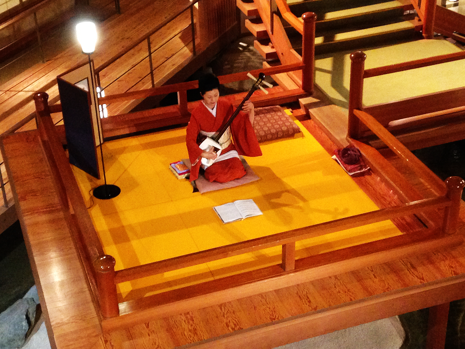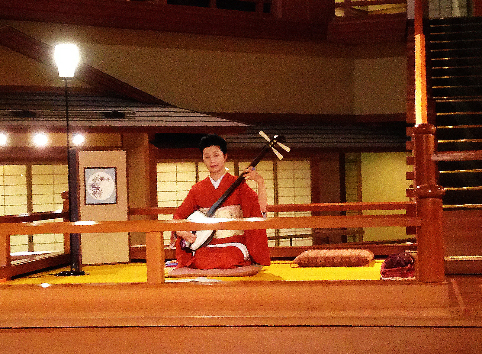 演奏者正坐其上彈著鏗鏘有力如淒如訴的三味線