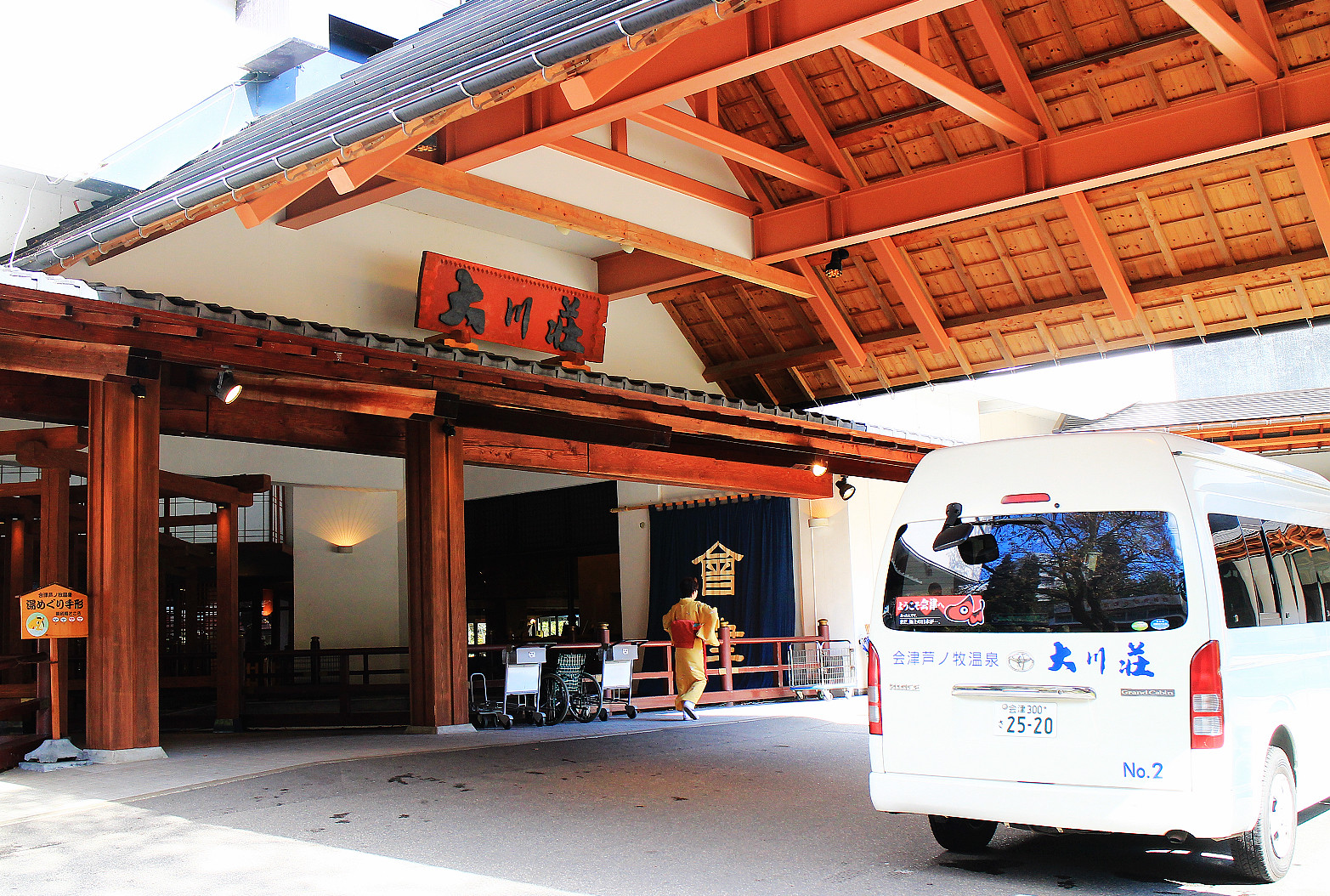 前往「大川莊」可從会津若松駅搭JR只見線直結会津鐵道,不到20分鐘抵達芦ノ牧温泉,然後搭乘旅館免費(無料送迎)巴士到「大川莊」。旅館也提供往來会津若松駅的免費(無料送迎)巴士,15:30從会津若松駅出發,16:00抵達,一定要預約。我們當天先到大內宿玩(遊記:大內宿尋訪古宿場片羽),所以是從湯野上温泉駅搭一站到芦ノ牧温泉,然後請車站服務人員聯繫旅館來接我們。