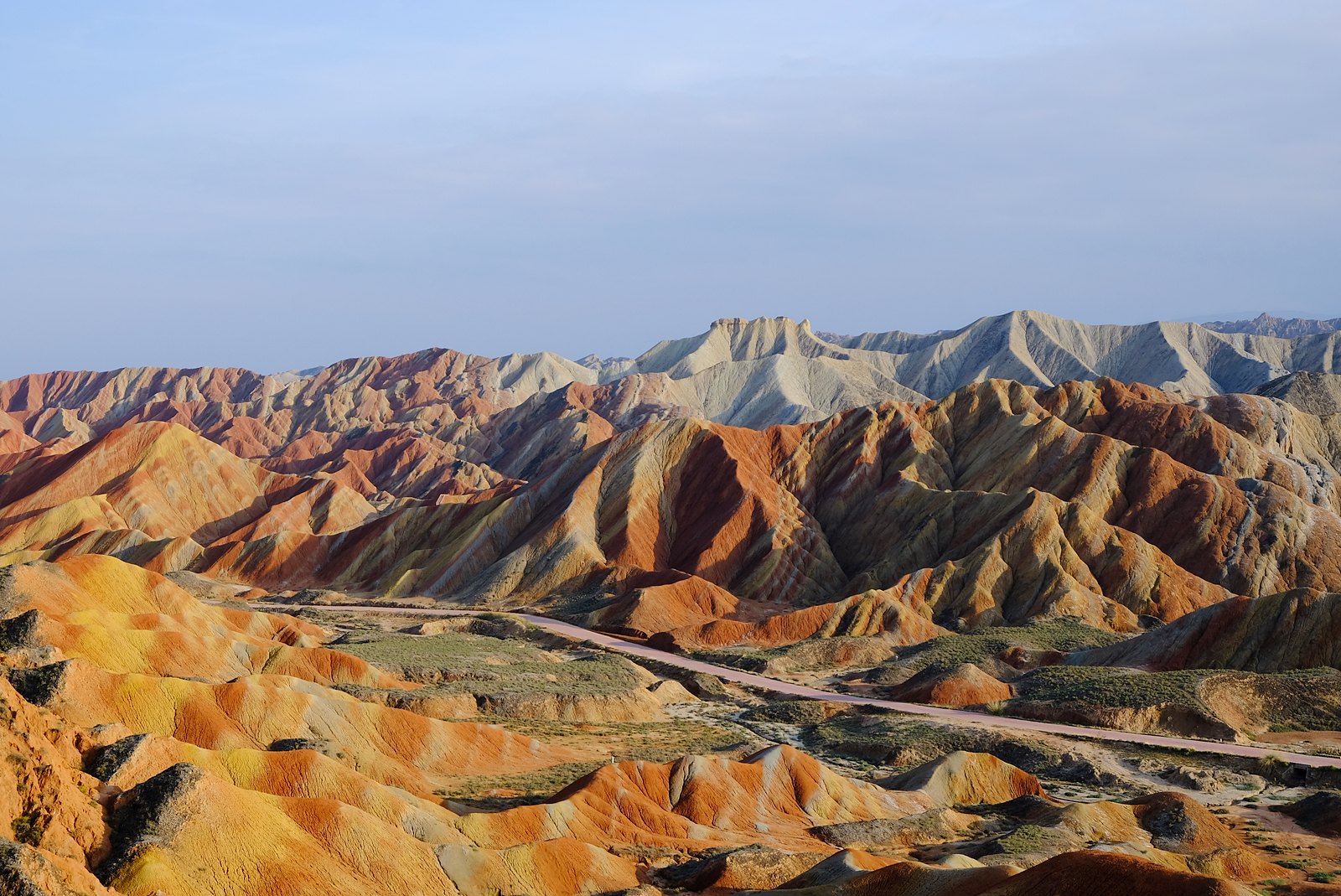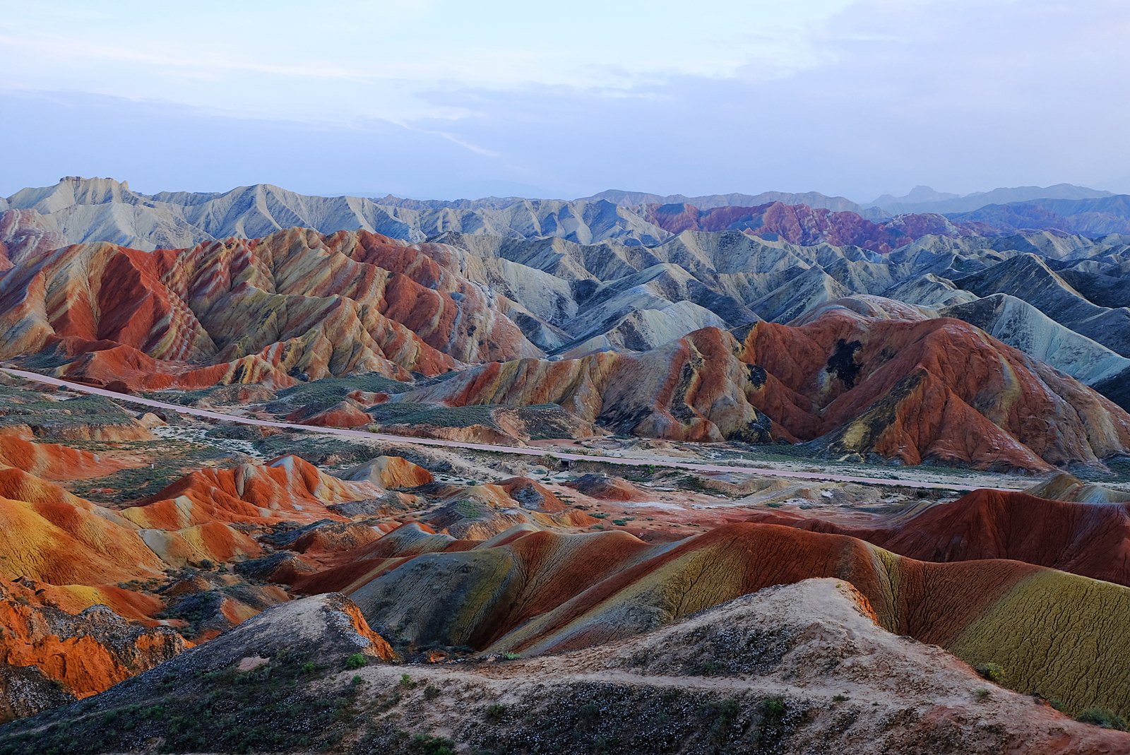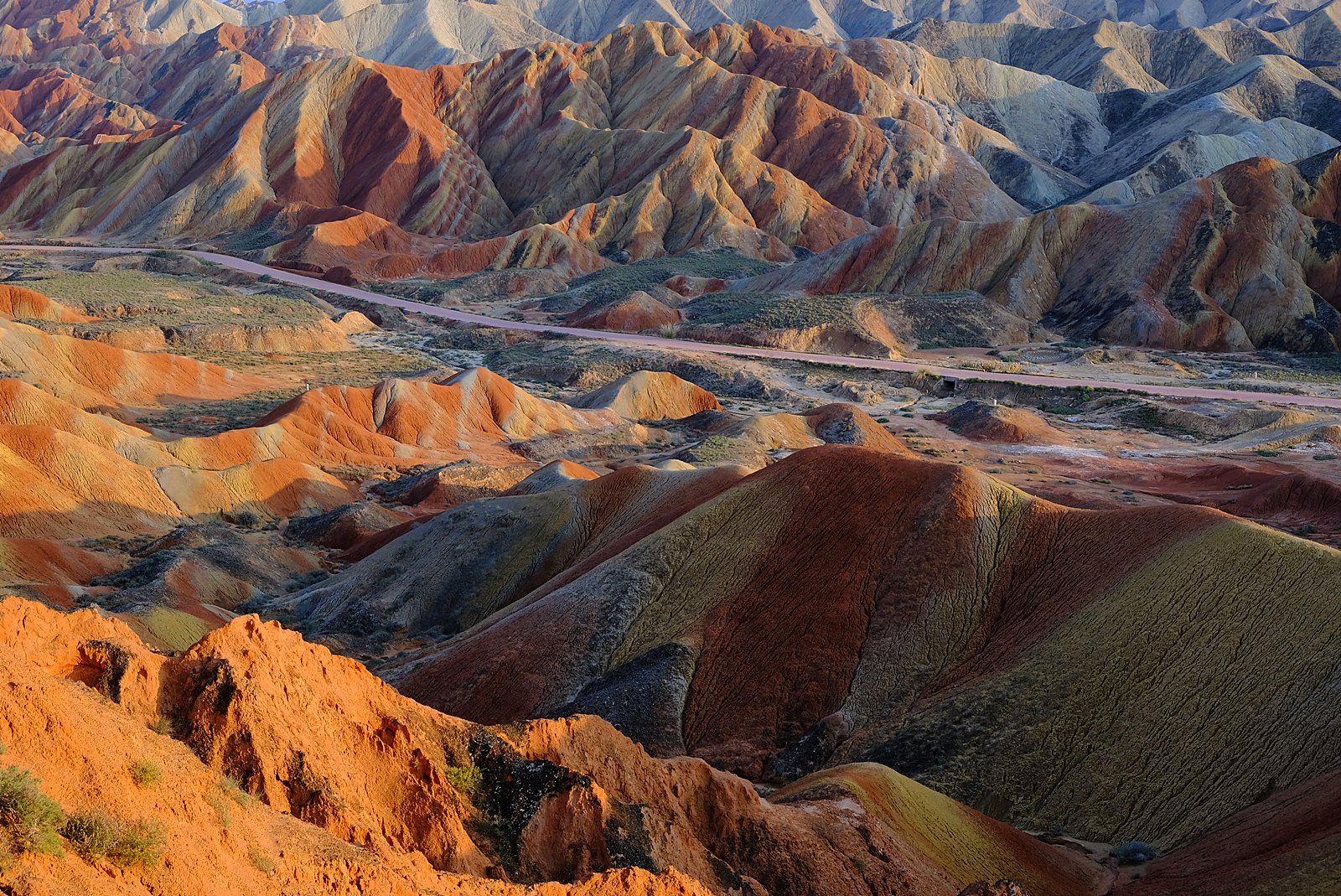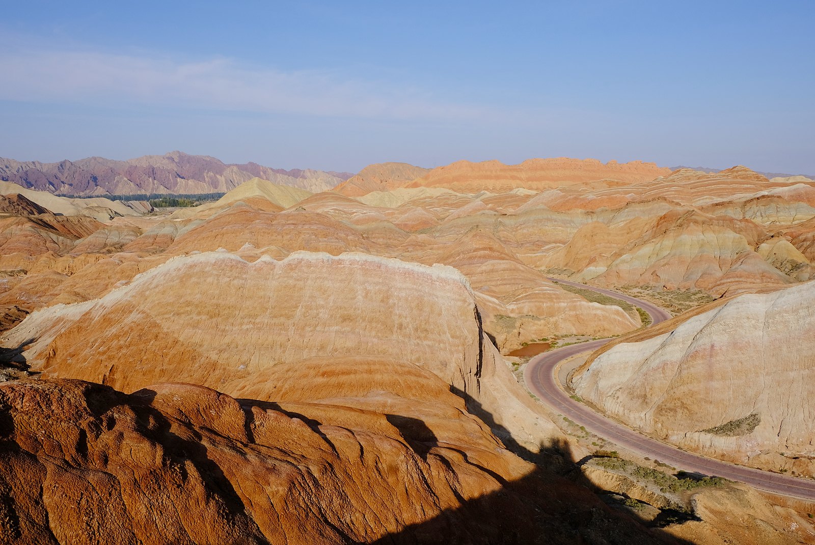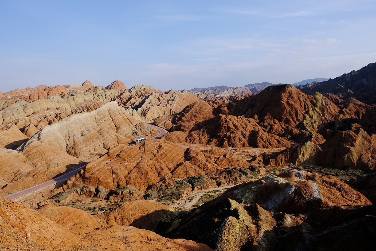 從4號觀景台俯視公路穿越溝壑縱橫的斑斕丹霞,令人感歎大自然幾億年來的鬼斧神工