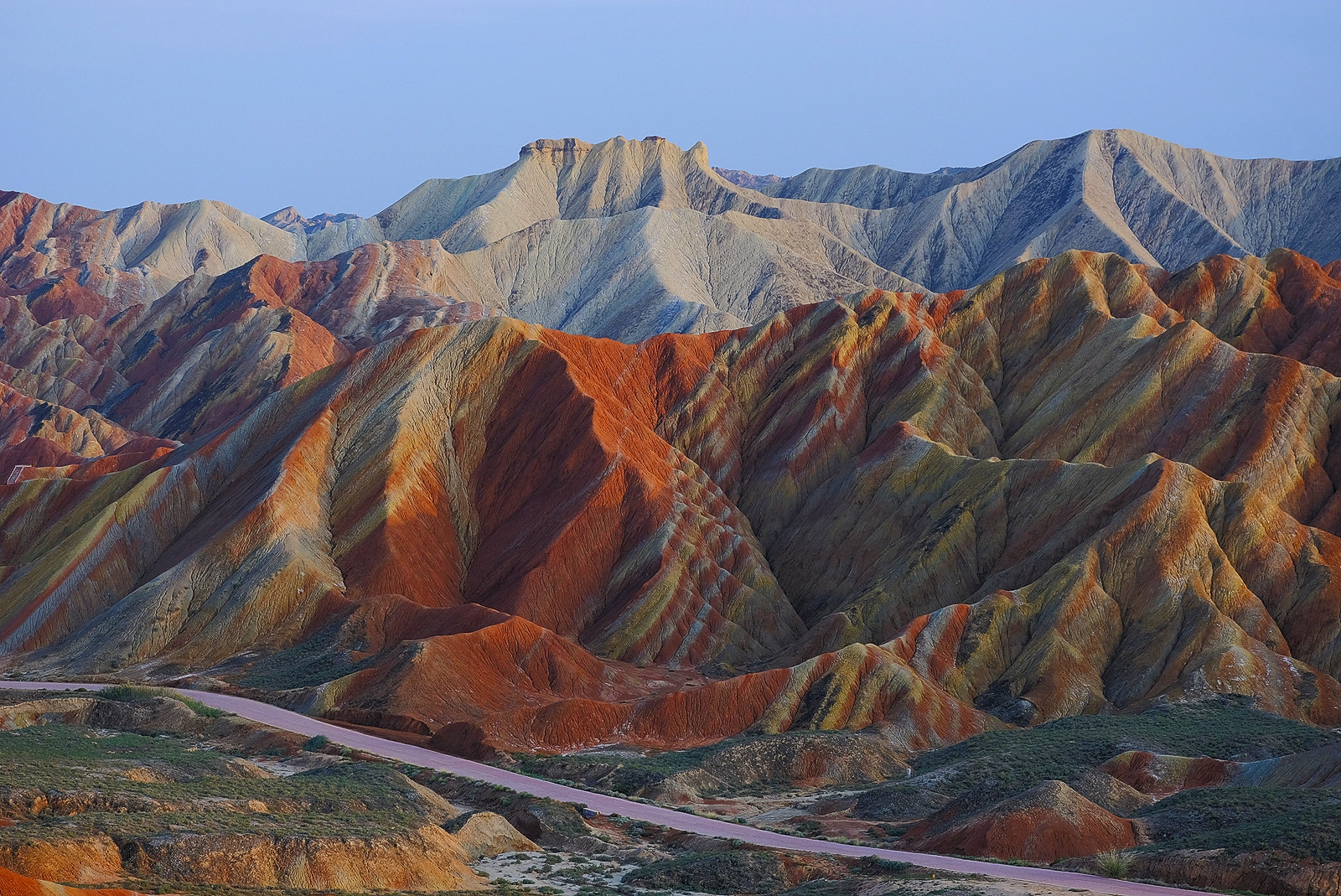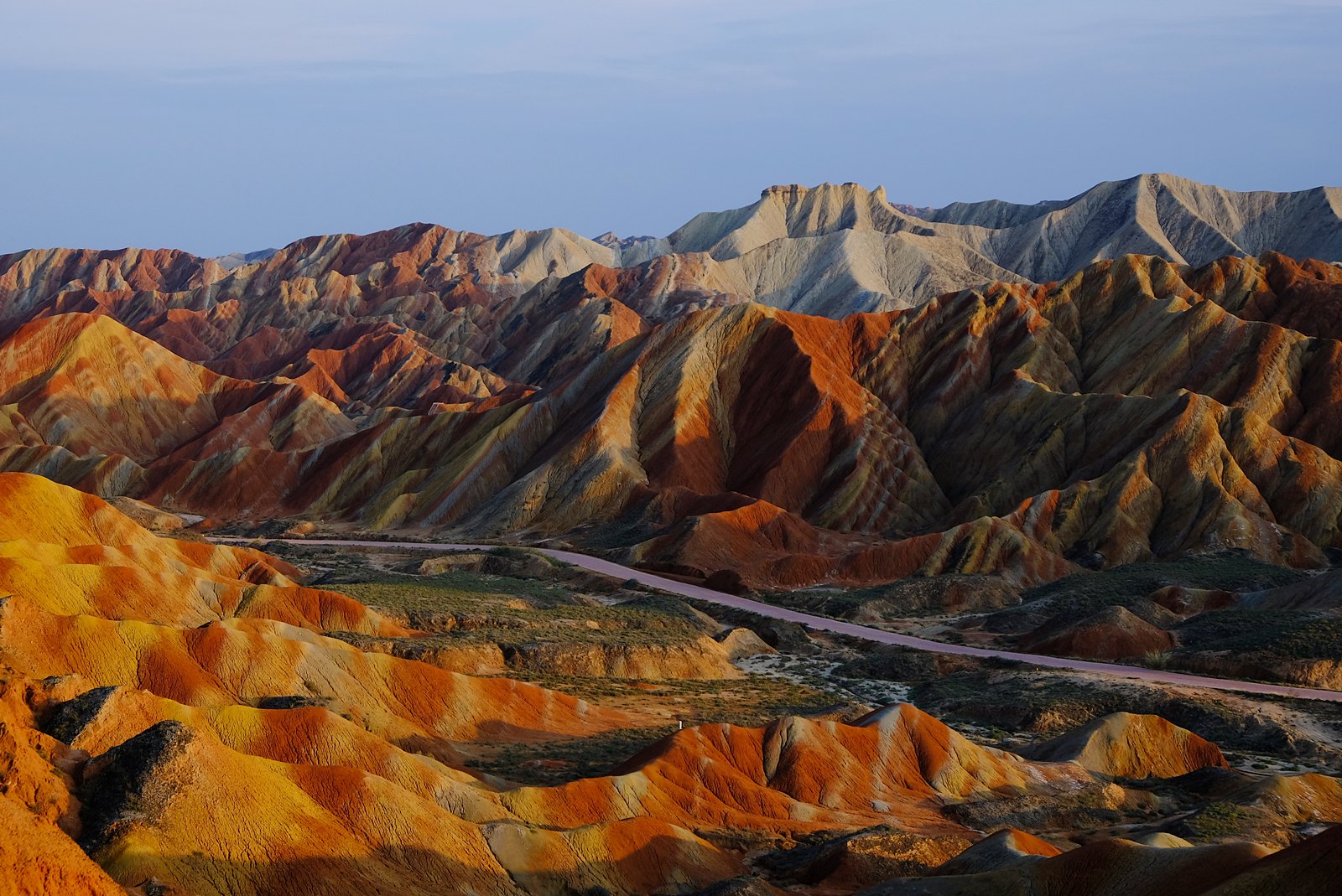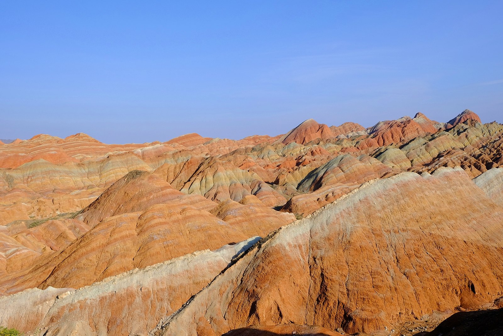 丹霞地貌是紅色砂岩經過不斷風化、崩塌、地質板塊振動與流水侵蝕,所形成的孤立山峰與嶙峋奇岩。其實張掖的丹霞地貌不只一處,除了我們前往的七彩丹霞最火紅,還有冰溝丹霞、平山湖大峽谷、臨澤紅溝、肅南懸堂寺等,風姿特色各不相同。很難想像在蒼涼荒蕪的西北戈壁灘,有如此瑰麗多彩的地貌奇觀,彷彿女媧遺落的七彩石,在絲綢之路上熠熠泛光。