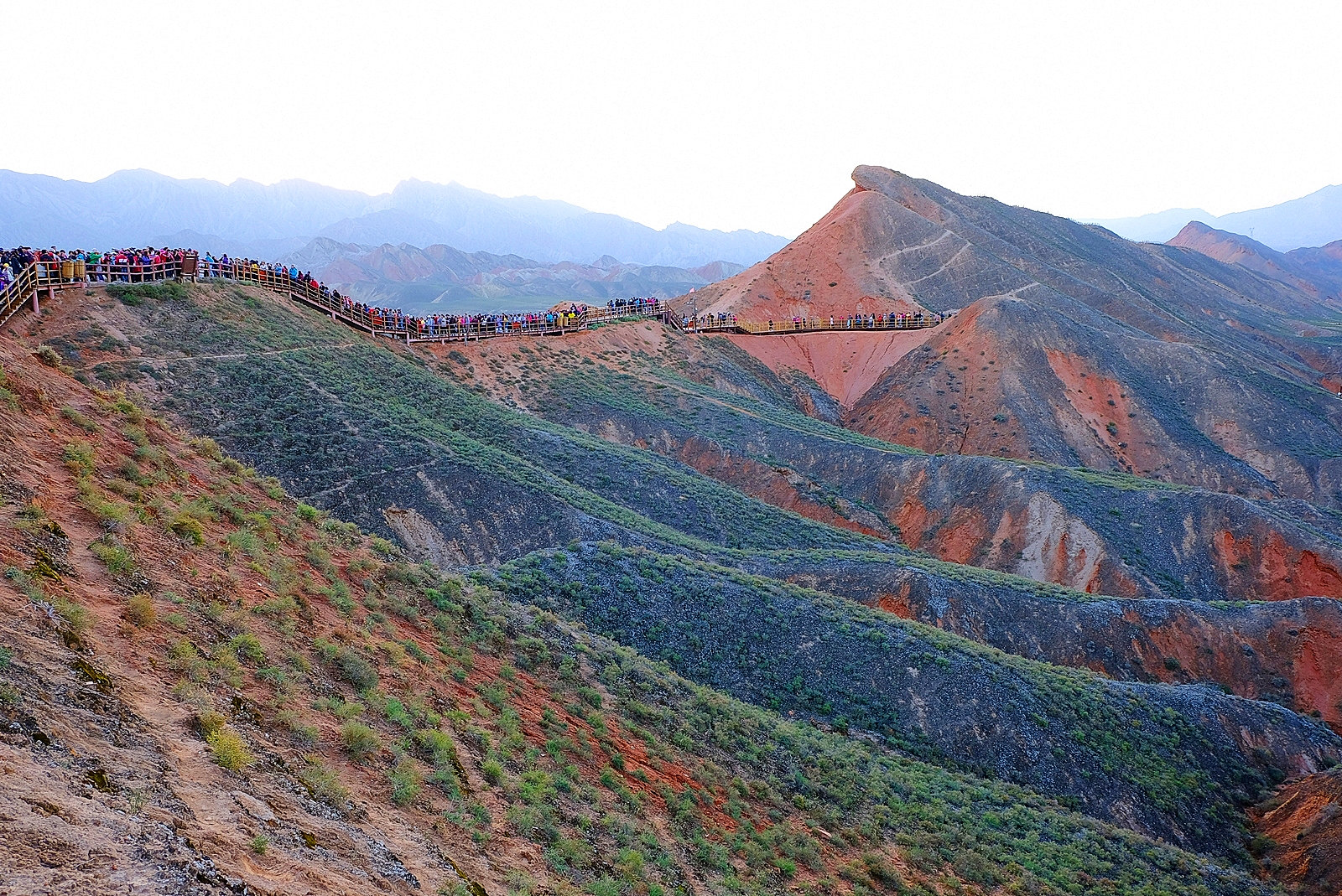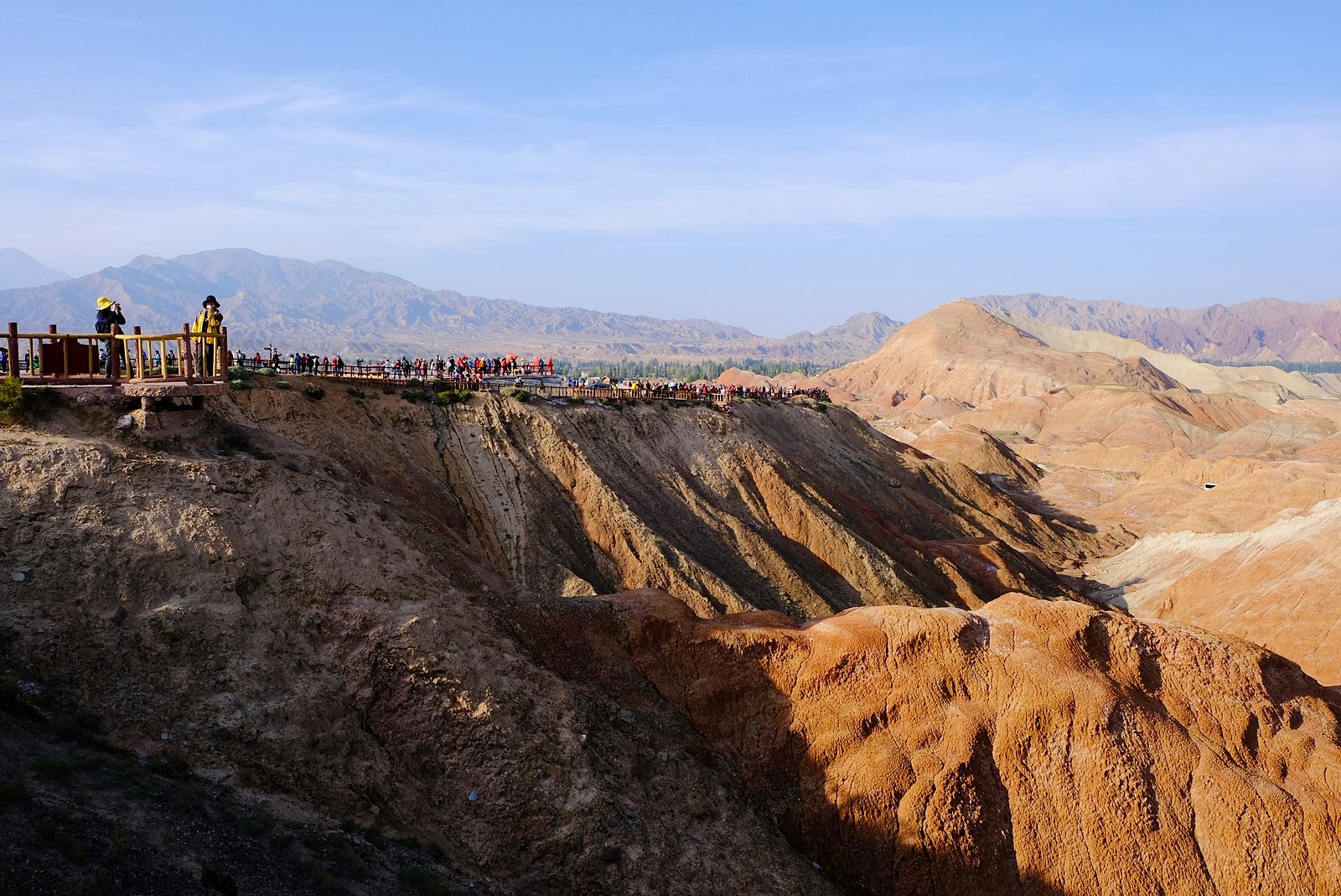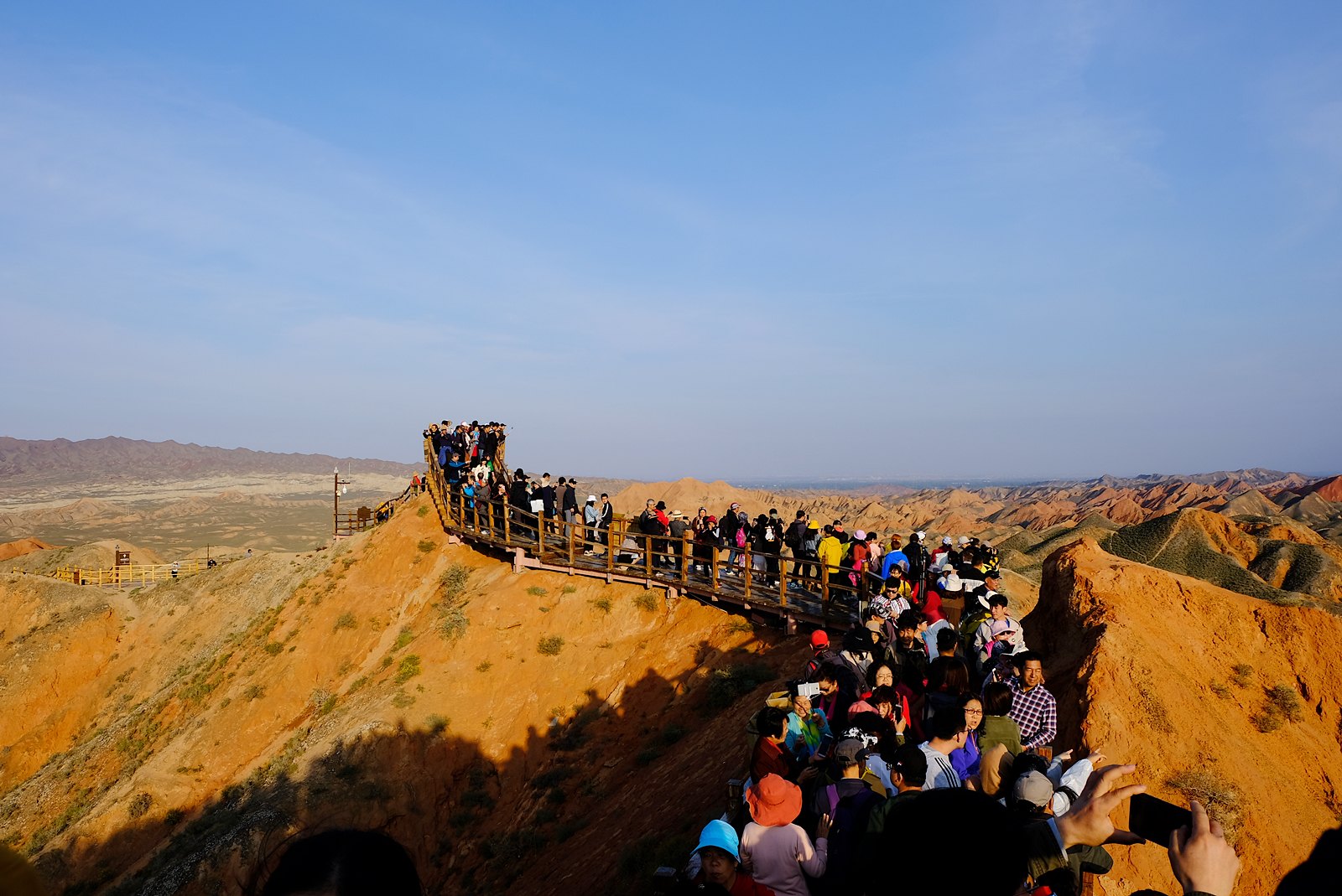 抵達4號觀景台時已經擠滿黑壓壓人潮,所謂的觀景台僅是短短一條狹窄木棧道,很容易塞爆。隨著太陽逐漸西沉,遊客如潮水般不斷湧入,已經到了寸步難行的地步。最後幾名彪形大漢管理員在棧道口管制人流,並且不斷吆喝趕人快速通過不准逗留,讓所有人很傻眼,畢竟大老遠來就是為了看美麗的丹霞夕照,不准停留實在說不過去。大家只好極緩慢移動,在斥責喊叫聲中等待時間流逝。