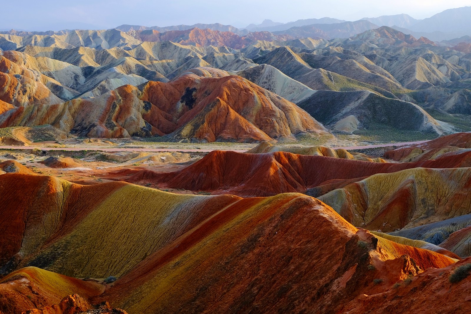 七彩丹霞東距張掖市區40公里,面積廣達50平方公里,平均海拔1820公尺,是中國唯一丹霞地貌與彩色丘陵結合的地質奇觀。源於喜馬拉雅造山運動,數億年來地層不同程度抬升,產生大量斷層與皺褶構造,最後形成粗曠雄奇、充滿律動感的景觀,形似神龍戲火、靈猴觀海、眾僧拜佛、大扇貝、七彩屏等包羅萬象。隨著光影變化與溫度濕度的差異,即使同一個地點或同樣紋理,在日出、早、中、傍晚看到的景觀色調都可能截然不同。尤其雨後初晴會更加鮮豔飽和,也最有層次感。